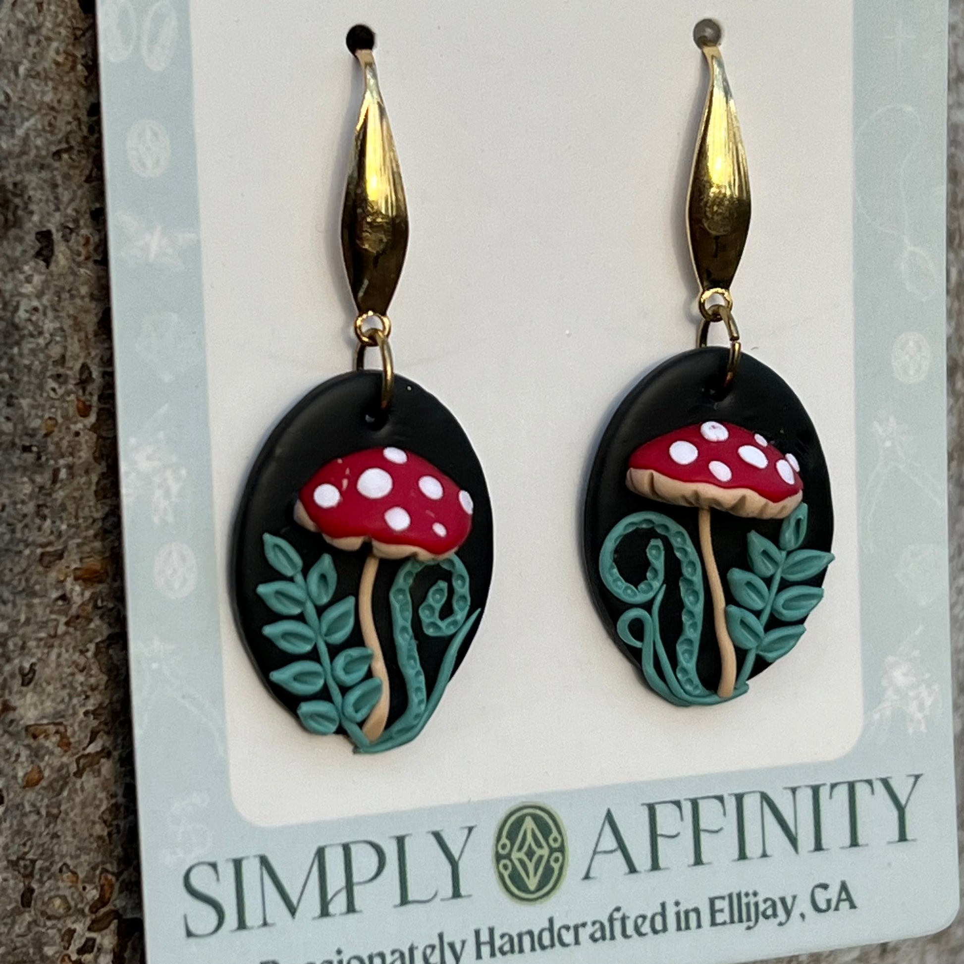 Add a touch of enchantment to your wardrobe with these intricately sculpted mushroom earrings. I hand sculpt each piece out of lightweight polymer clay, so you enjoy the whimsical beauty of nature while being comfortable wearing your earrings all day long. These sweet earrings are on gold plated stainless steel ear wires.