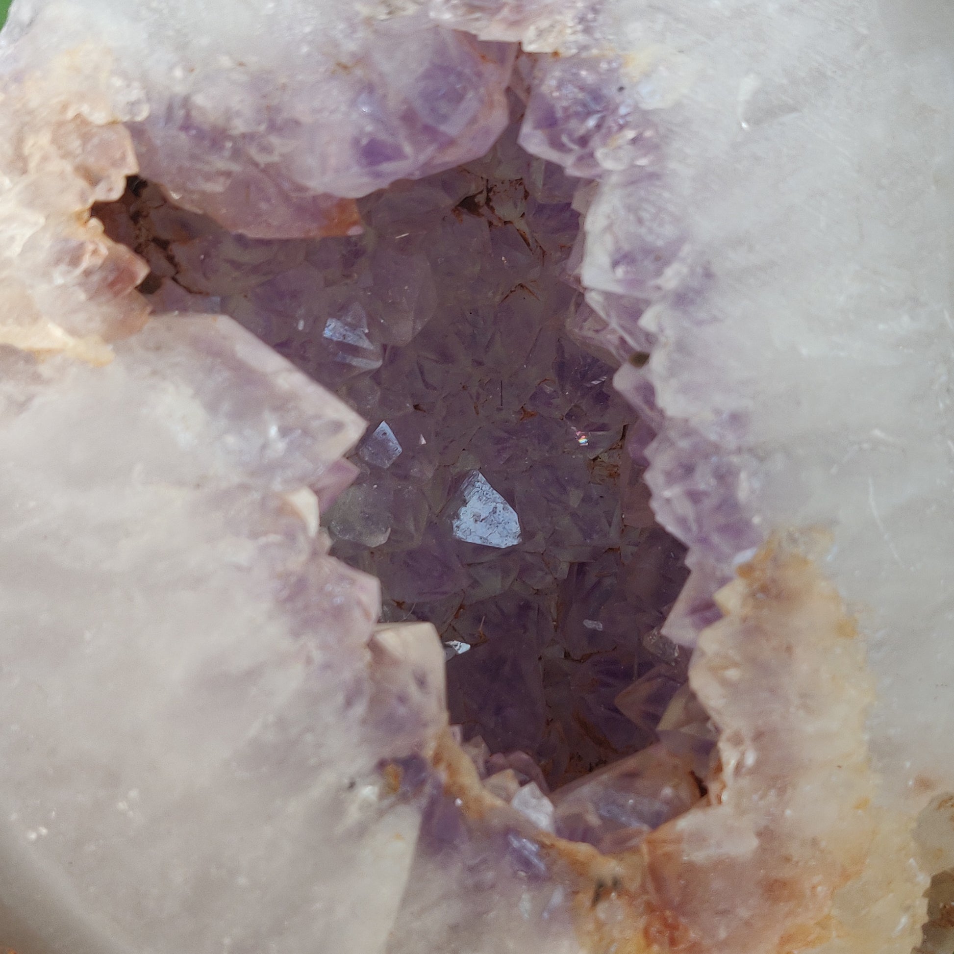 This beautiful agate geode is encrusted with beautiful purple amethyst crystals. Agate forms when microscopic crystals of quartz are laid down in bands. Agate is a very grounding stone. It brings emotional, physical and intellectual balance.