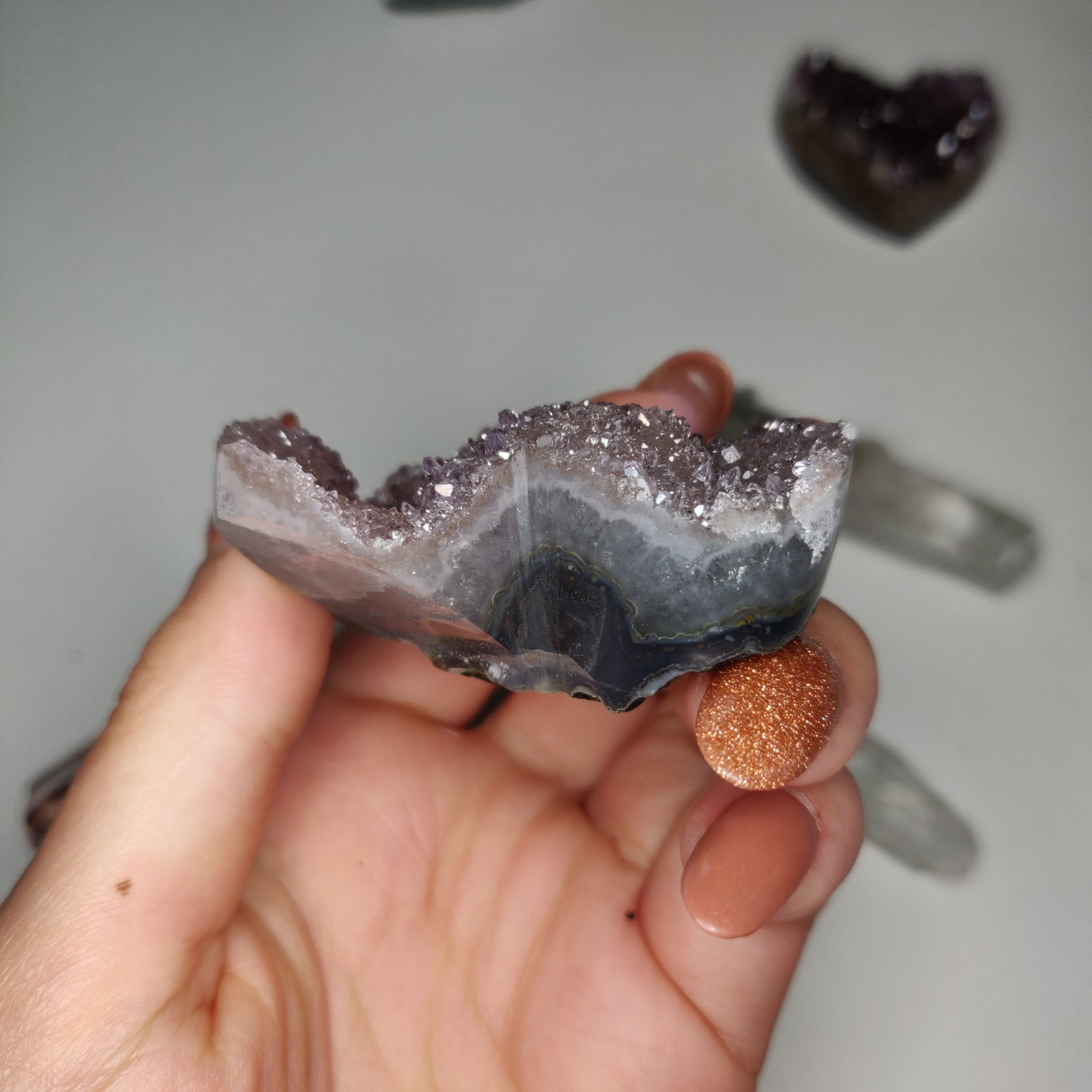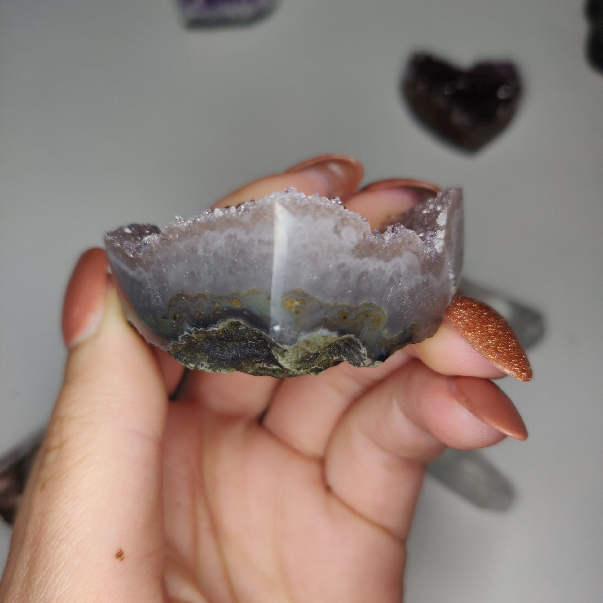 Agate forms when microscopic crystals of quartz are laid down in bands. Agate is a very grounding stone. It brings emotional, physical and intellectual balance.