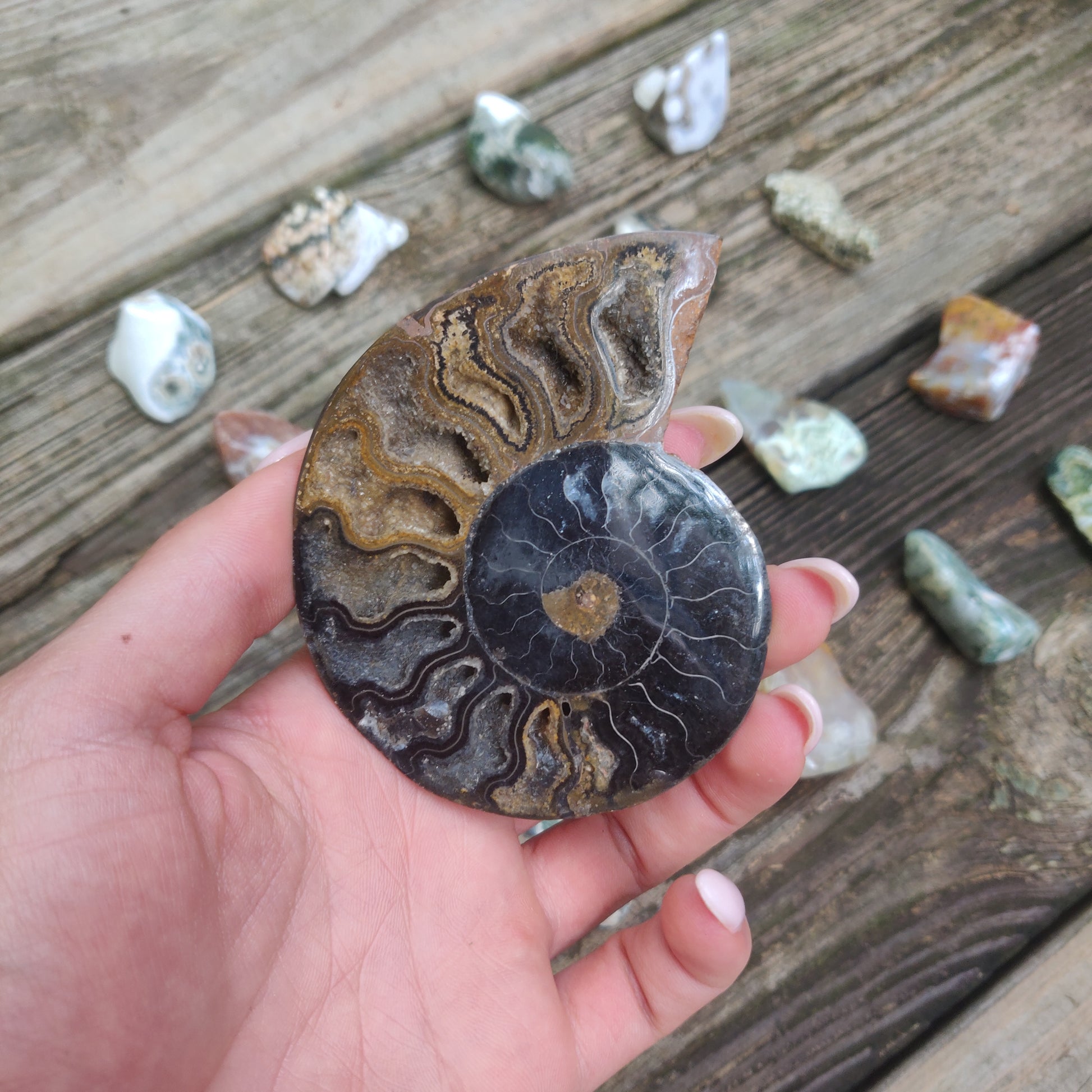 During fossilization, the nacreous layer of some ammonites were chemically transformed into an iridescent material called ammolite, which is aragonite with varying mineral impurities that is considered to be an opal-like gemstone. Ammonite spirals work as a filter. They draw in negative energies and replace them with wonderful, positive energy. ♡ The wonderful rainbow iridescent of the shell serves a a great reminder that, "The greater the storm, the brighter the rainbow." In life, sometimes we have to go through hard times to appreciate the good times. Ammonite reminds us to bask in today's rainbow and let the clouds of the past dissolve behind us.