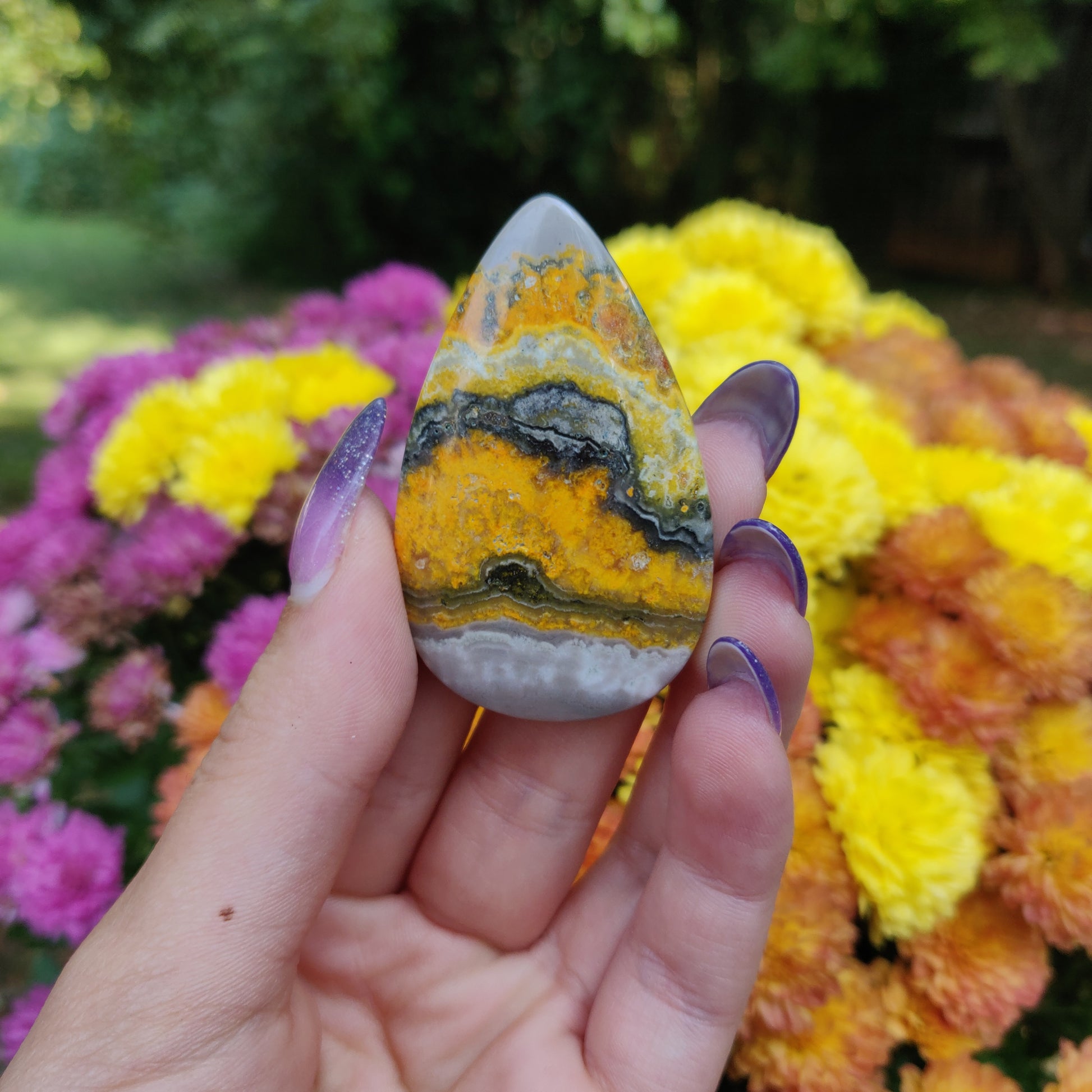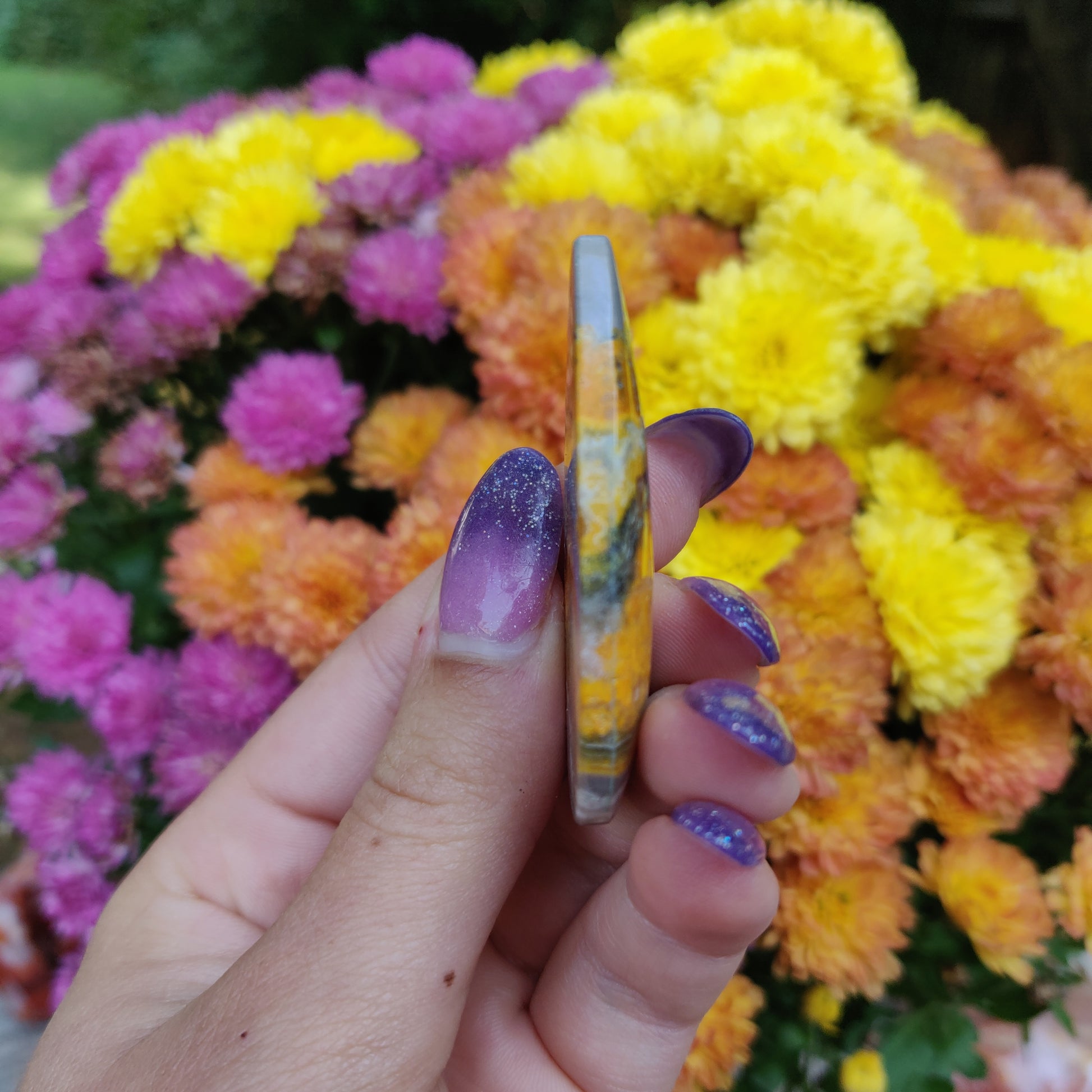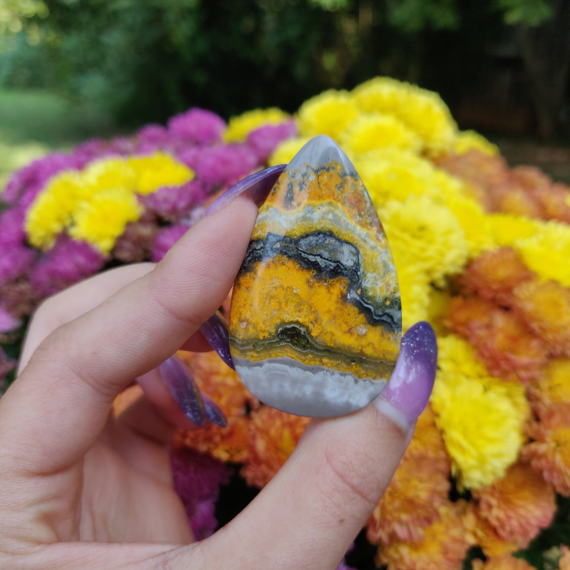 Please wash your hands after working with Bumblebee Jasper. It is on the toxic list of crystals. It can naturally contain sulfur and arsenic.Â