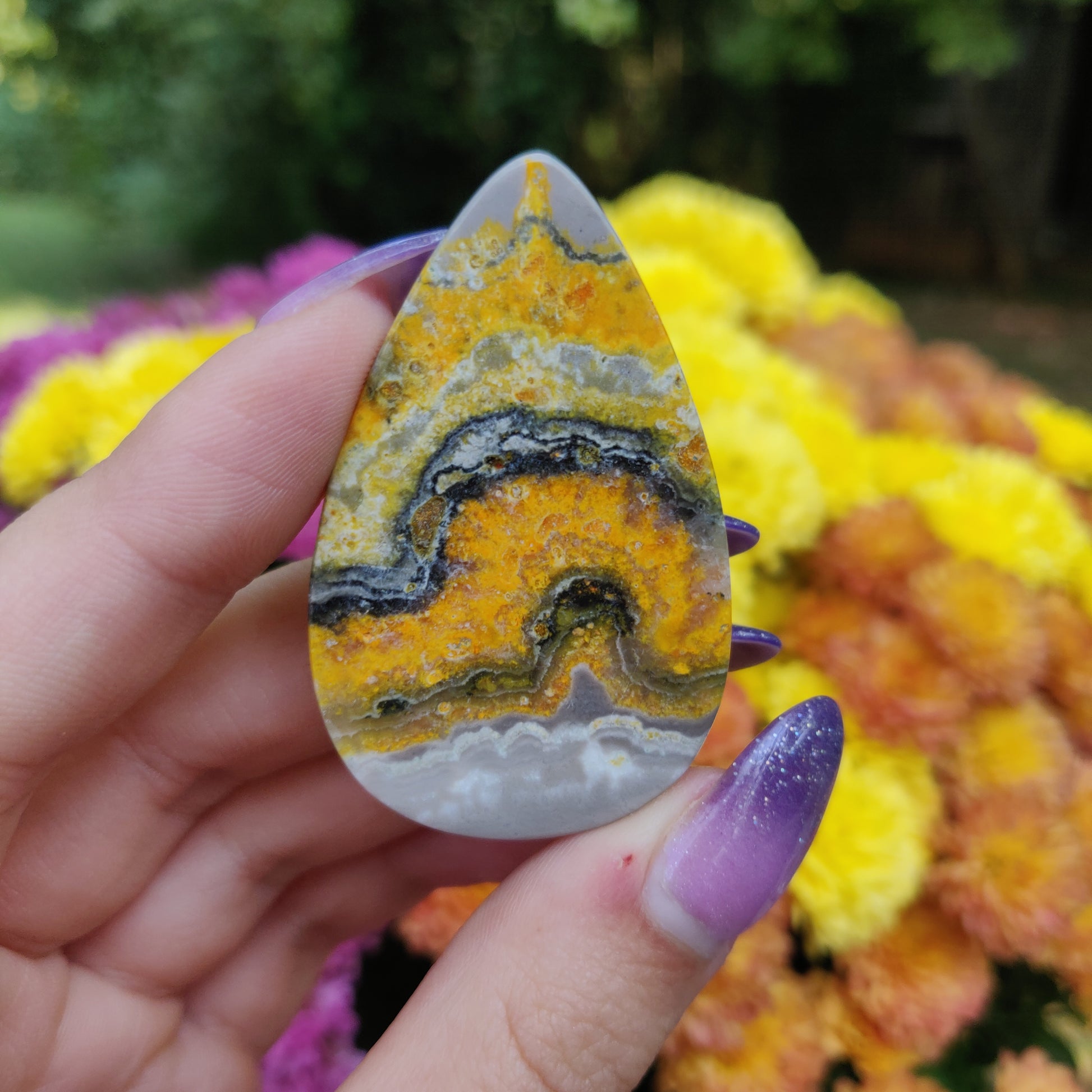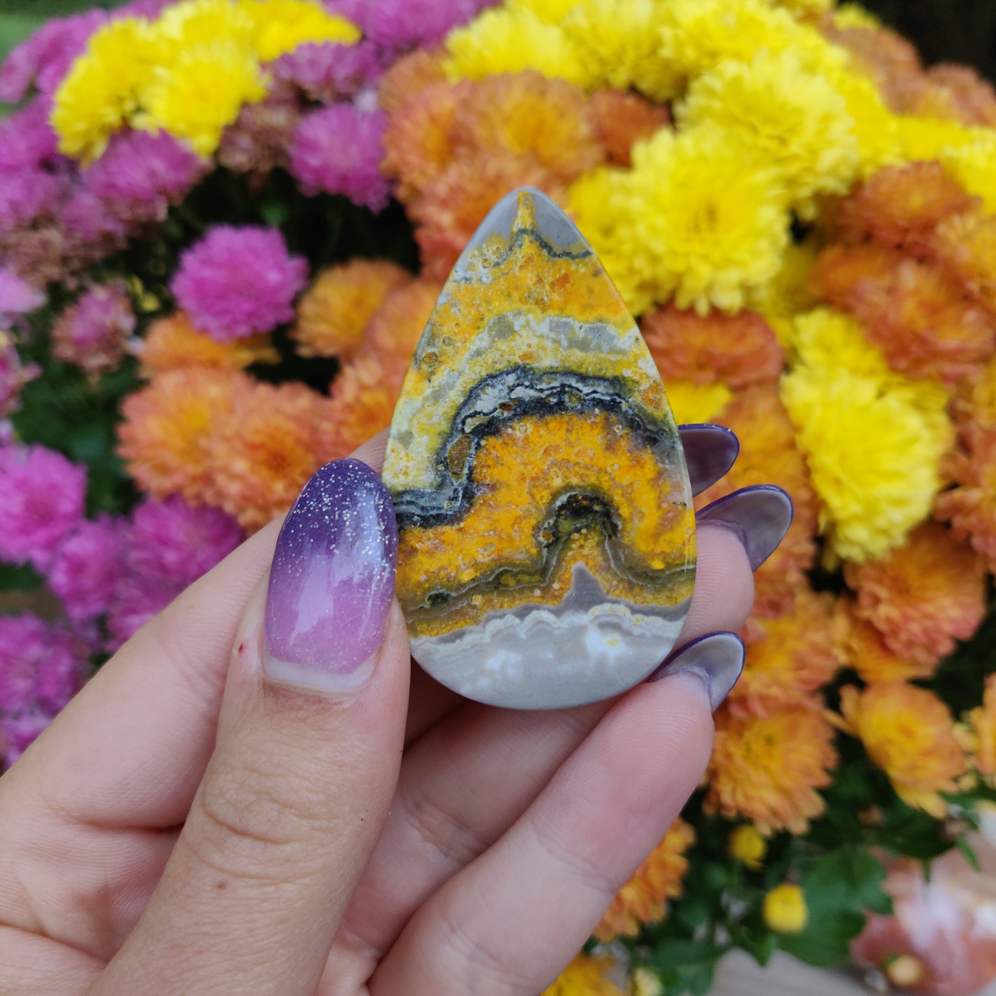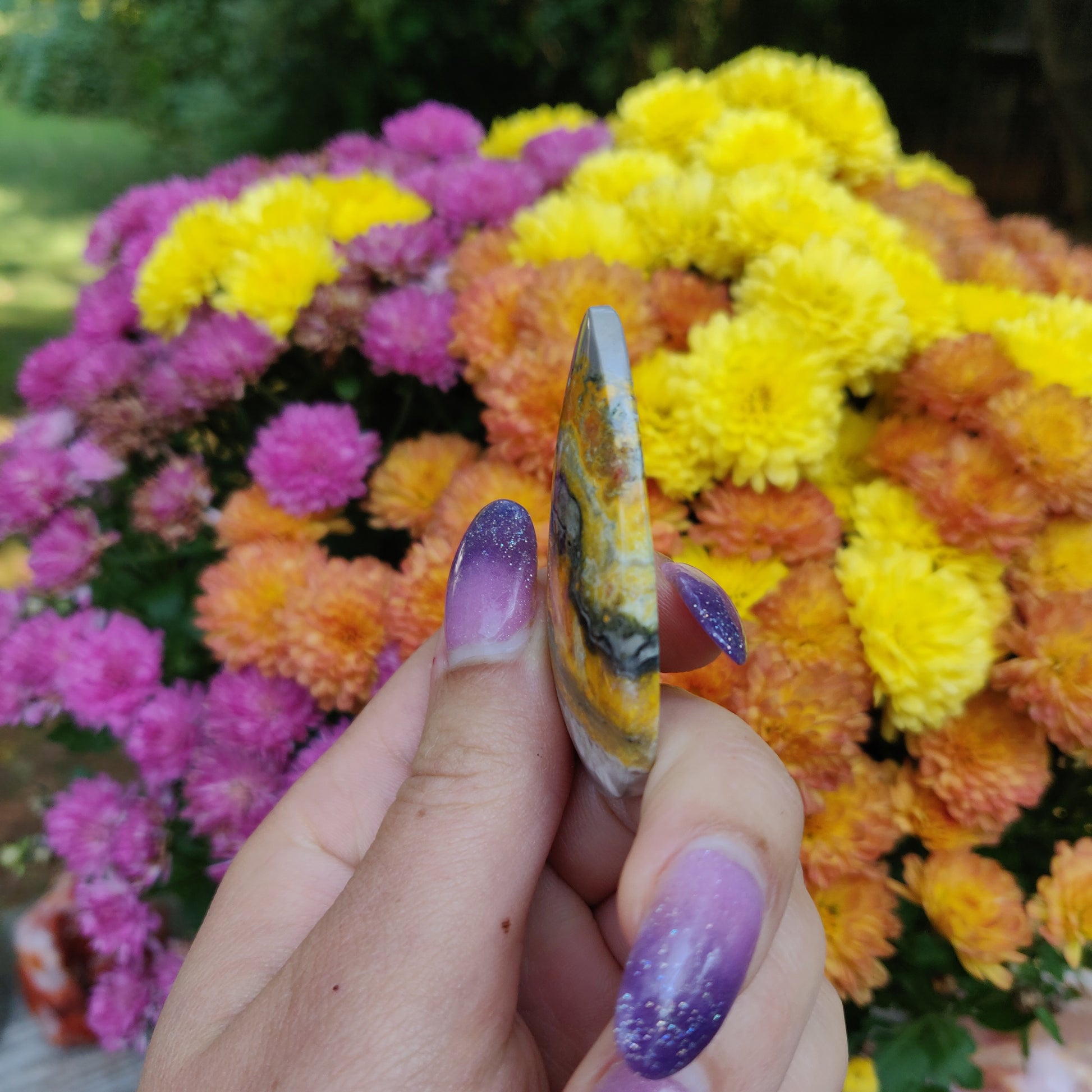 Please wash your hands after working with Bumblebee Jasper. It is on the toxic list of crystals. It can naturally contain sulfur and arsenic.Â
