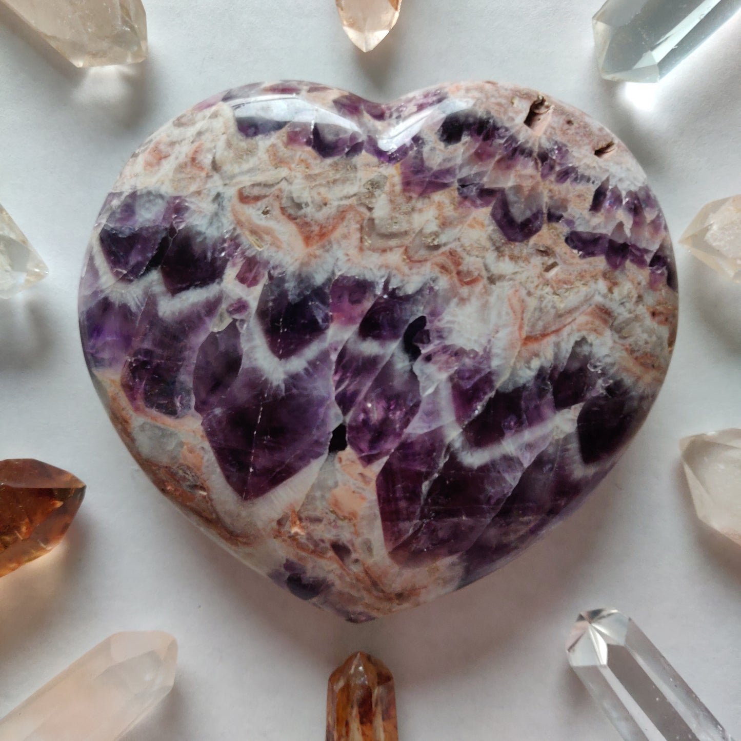 This beautiful Brazilian Amethyst Heart has gorgeous chevron patterning. Amethyst evokes passion and imagination, emotion and logic. It stimulates creativity and is particularly helpful in artistic endeavors. Amethyst is the traditional birthstone of those born in February, and is associated with the sign of Pisces.