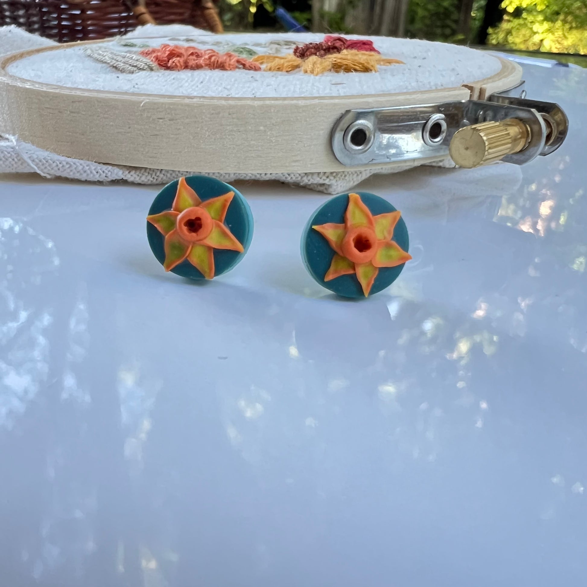 Add a touch of enchantment to your wardrobe with our lightweight and intricately sculpted daffodil earrings. Handcrafted from lightweight polymer clay, enjoy the whimsical beauty of nature while being comfortable wearing your earrings all day long. These sweet earrings are on surgical steel posts.