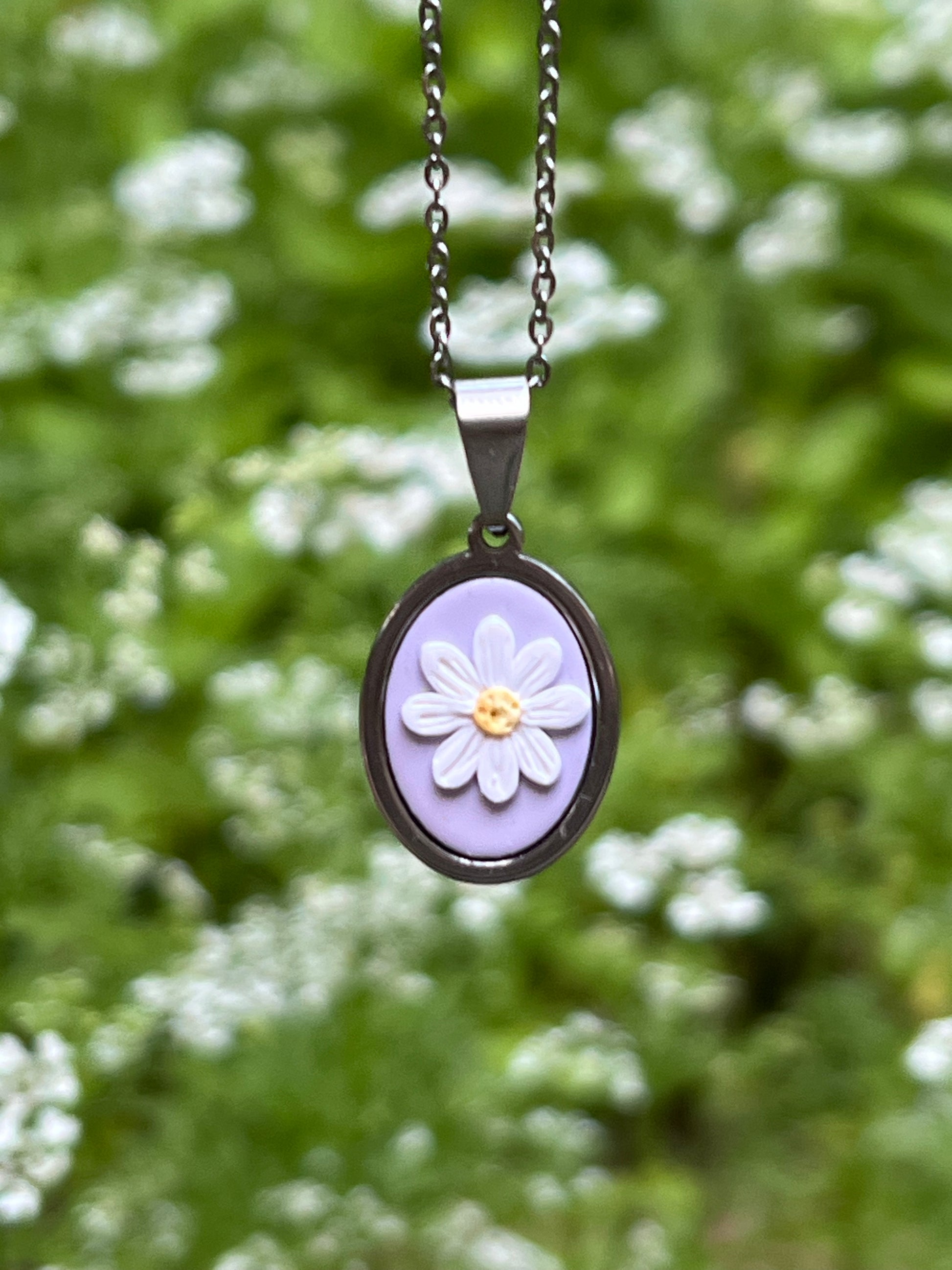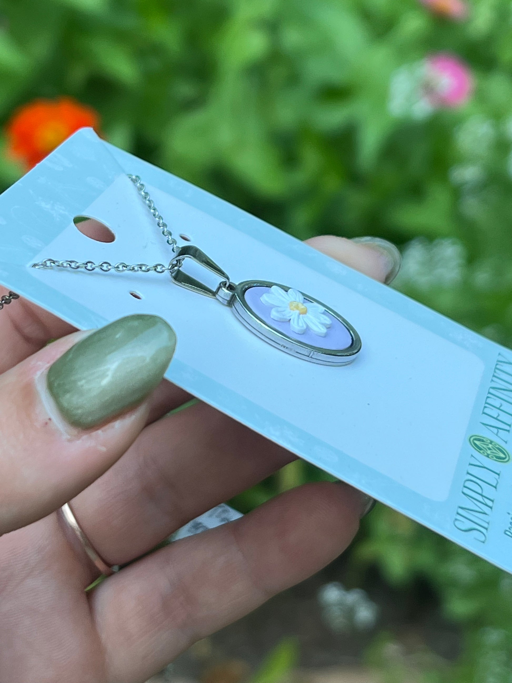 The daisy is set in a stainless steel pendant and hangs from an 18" stainless steel chain that’s durable, hypoallergenic, and perfect for everyday wear.