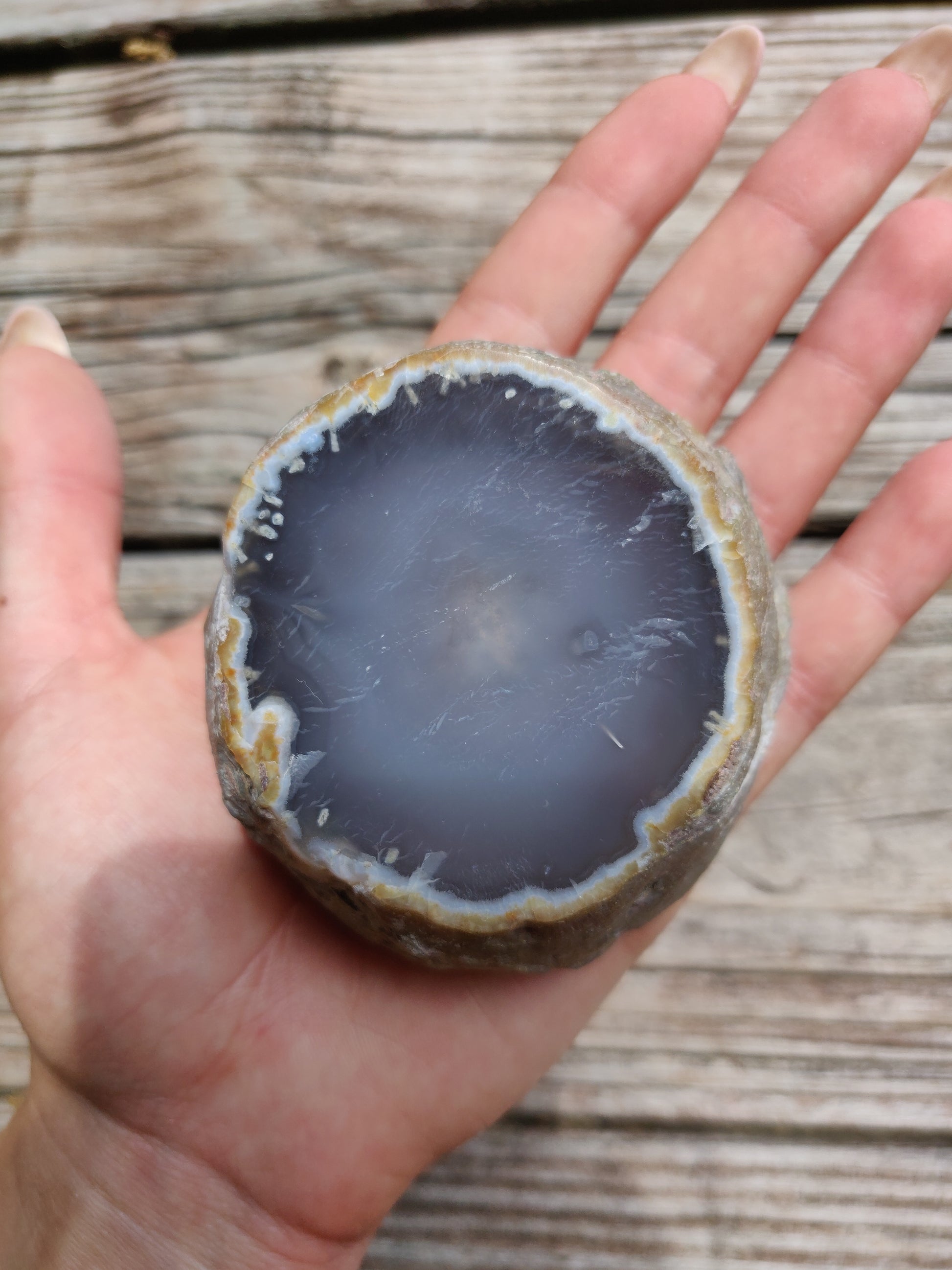Please note: The chalcedony shell is porous, allowing water to enter and exit the cavity very slowly. Especially if you live in a very dry climate, with low humidity, it is suggested that you keep your Enhydro Agate in water to emulate its conditions when it was underground, constantly surrounded by moisture. Otherwise, your Enhydro agate can dry out.