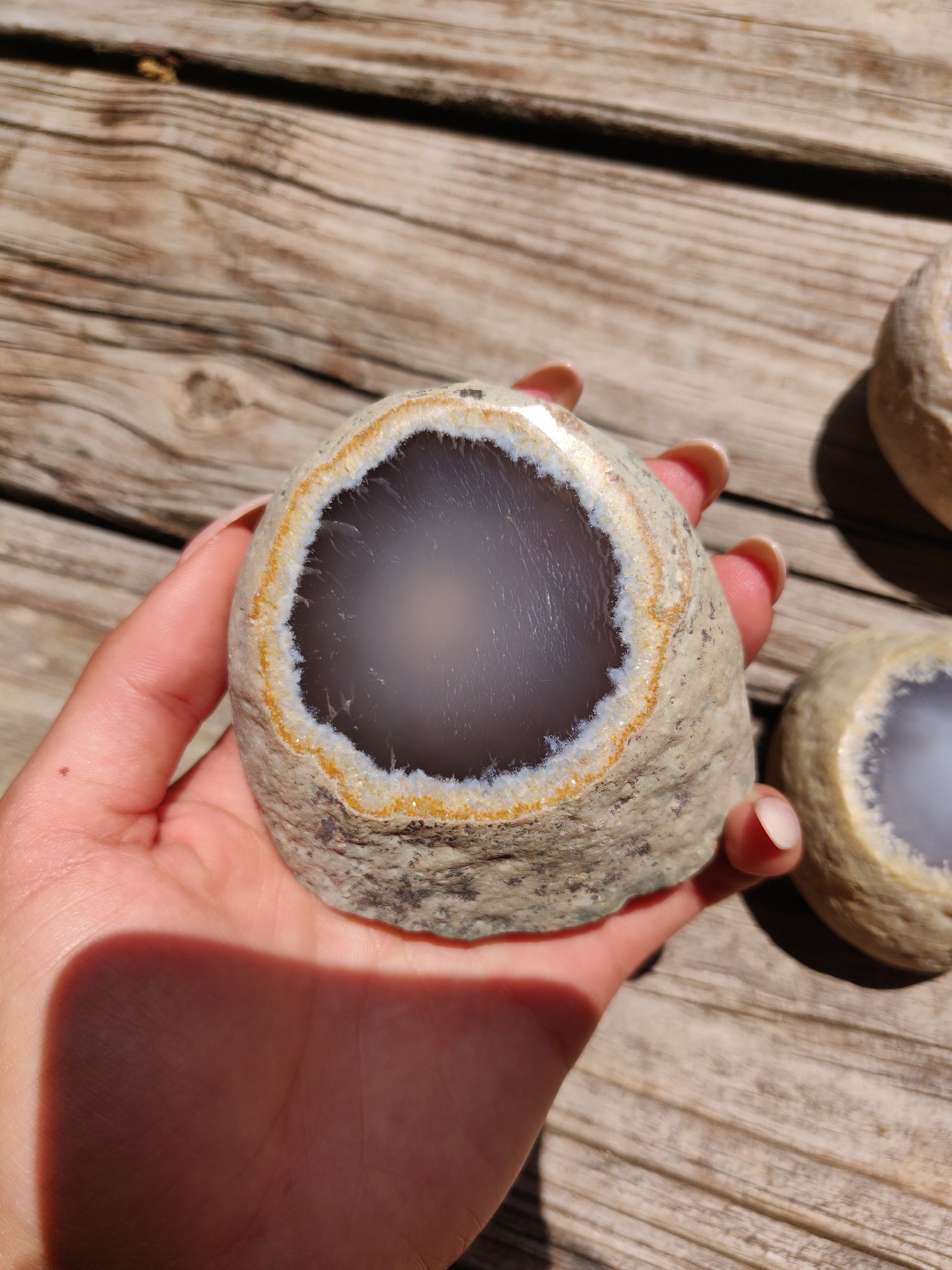 Please note: The chalcedony shell is porous, allowing water to enter and exit the cavity very slowly. Especially if you live in a very dry climate, with low humidity, it is suggested that you keep your Enhydro Agate in water to emulate its conditions when it was underground, constantly surrounded by moisture. Otherwise, your Enhydro agate can dry out.
