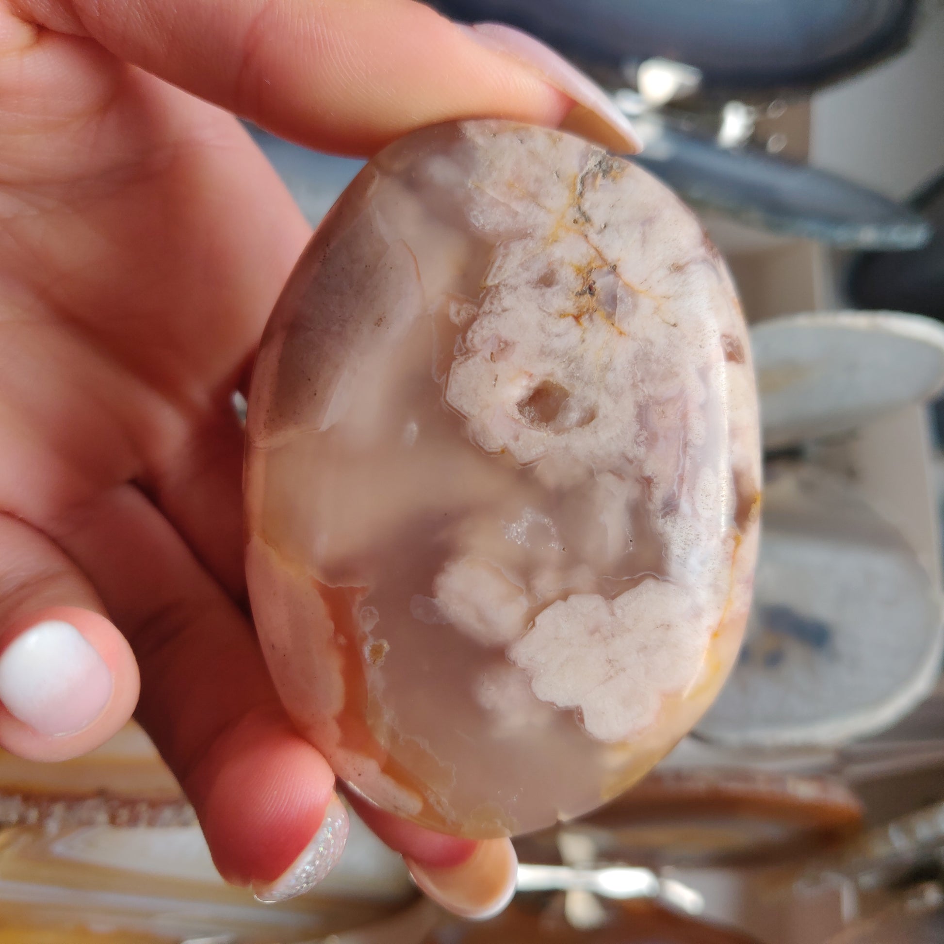 Flower Agate is a fascinating new find from Madagascar. It is a type of plume agate (agate with plume-like inclusions). However, instead of 2-dimensional plumes, as found in other types of plume agates (such as dendritic agate), Flower Agate plumes are more 3-dimensional, and their cross-sections create gorgeous flower-like plumes. Flower Agate has many amazing metaphysical properties that encourage self-growth. The best analogy to describe the energy flowing from Flower Agate is “from seed to blossom”, because Flower Agate will help you to blossom and reach your full potential. It can aid as a protector from your own fears & self-doubt to allow you to grow. For More Info about Flower Agate's Metaphysical Properties see our Blog Post