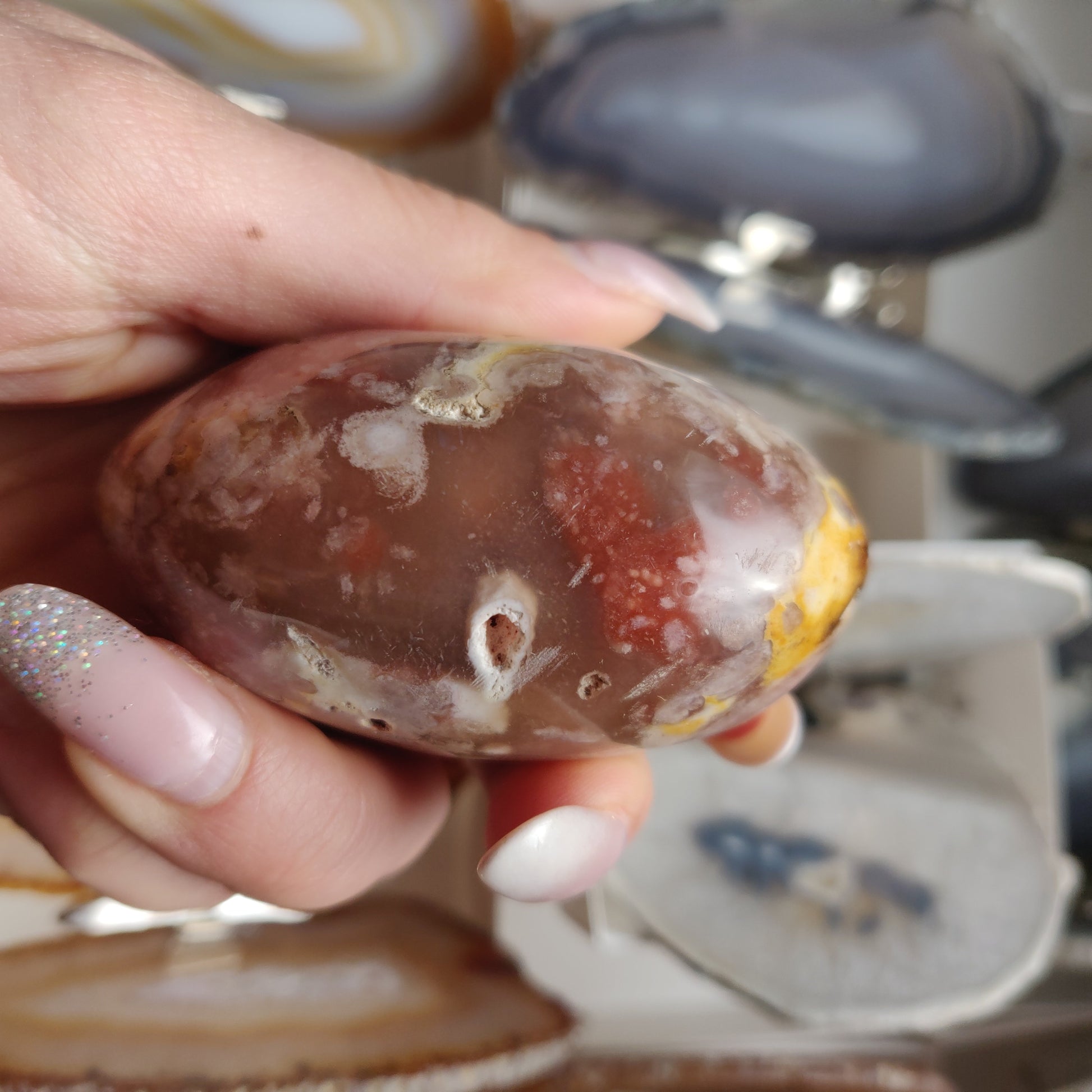 Flower Agate is a fascinating new find from Madagascar. It is a type of plume agate (agate with plume-like inclusions). However, instead of 2-dimensional plumes, as found in other types of plume agates (such as dendritic agate), Flower Agate plumes are more 3-dimensional, and their cross-sections create gorgeous flower-like plumes. Flower Agate has many amazing metaphysical properties that encourage self-growth. The best analogy to describe the energy flowing from Flower Agate is “from seed to blossom”, because Flower Agate will help you to blossom and reach your full potential. It can aid as a protector from your own fears & self-doubt to allow you to grow. For More Info about Flower Agate's Metaphysical Properties see our Blog Post