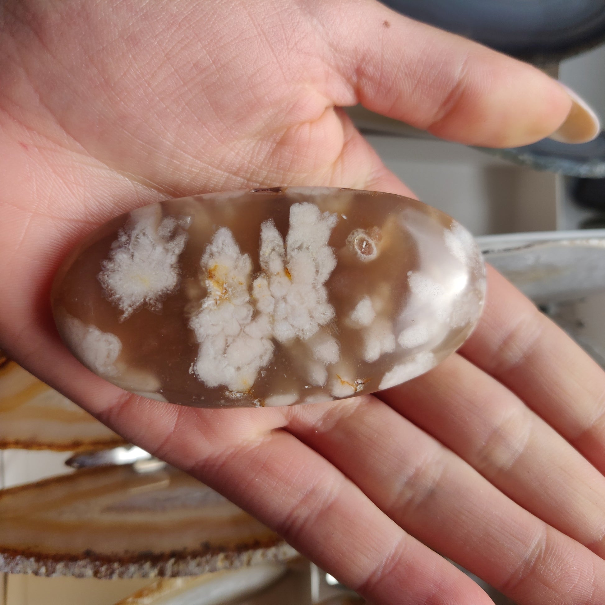 Flower Agate is a fascinating new find from Madagascar. It is a type of plume agate (agate with plume-like inclusions). However, instead of 2-dimensional plumes, as found in other types of plume agates (such as dendritic agate), Flower Agate plumes are more 3-dimensional, and their cross-sections create gorgeous flower-like plumes. Flower Agate has many amazing metaphysical properties that encourage self-growth. The best analogy to describe the energy flowing from Flower Agate is “from seed to blossom”, because Flower Agate will help you to blossom and reach your full potential. It can aid as a protector from your own fears & self-doubt to allow you to grow. For More Info about Flower Agate's Metaphysical Properties see our Blog Post