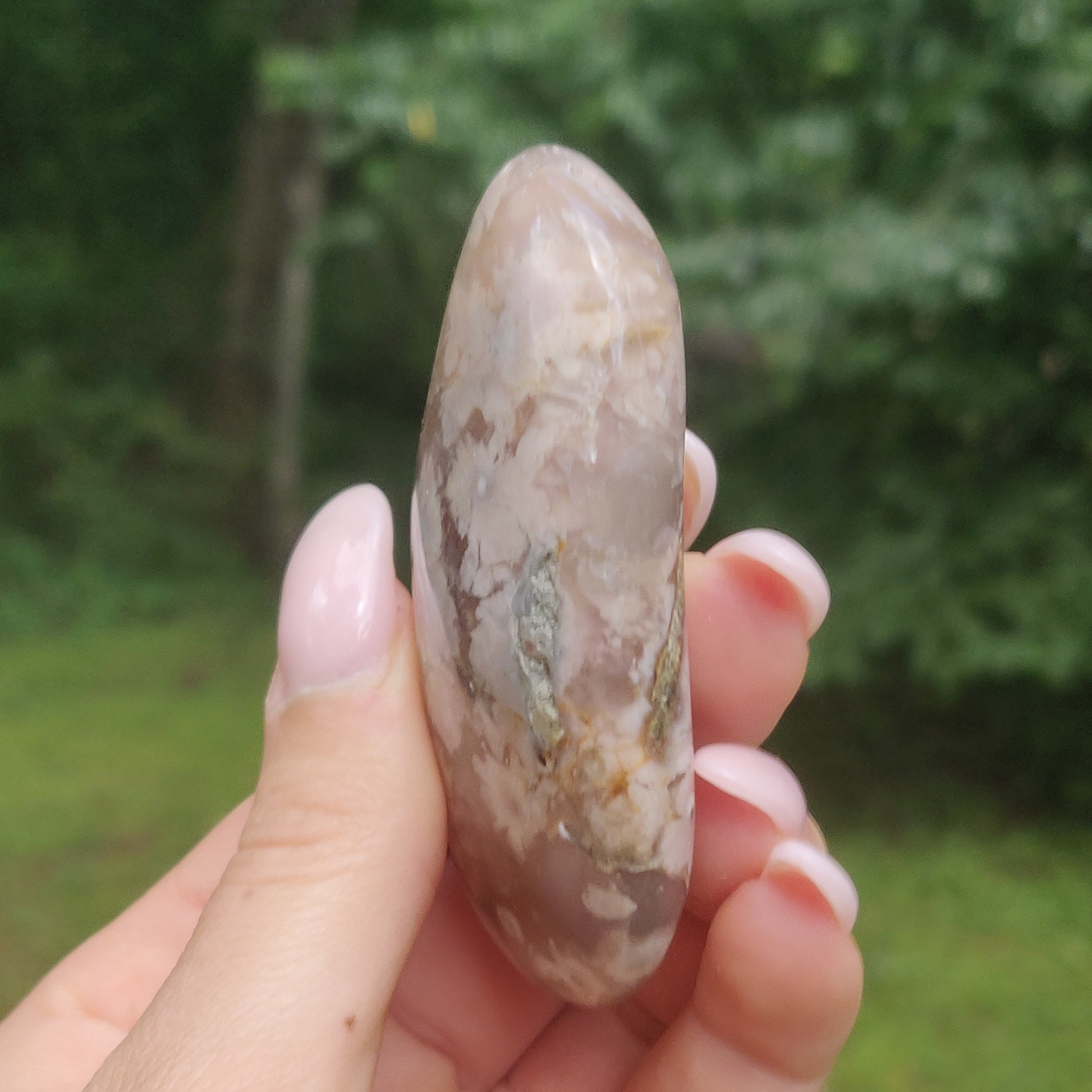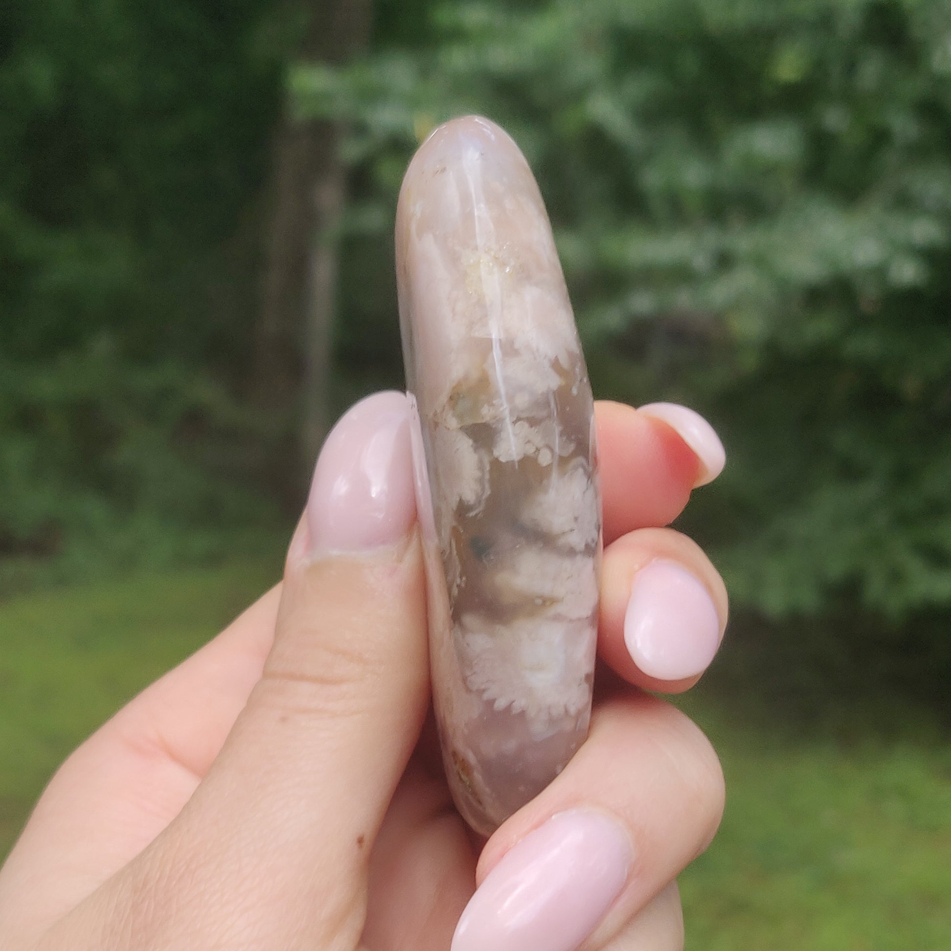 Flower Agate is a fascinating new find from Madagascar. It is a type of plume agate (agate with plume-like inclusions). However, instead of 2-dimensional plumes, as found in other types of plume agates (such as dendritic agate), Flower Agate plumes are more 3-dimensional, and their cross-sections create gorgeous flower-like plumes. Flower Agate has many amazing metaphysical properties that encourage self-growth. The best analogy to describe the energy flowing from Flower Agate is “from seed to blossom”, because Flower Agate will help you to blossom and reach your full potential. It can aid as a protector from your own fears & self-doubt to allow you to grow. For More Info about Flower Agate's Metaphysical Properties see our Blog Post