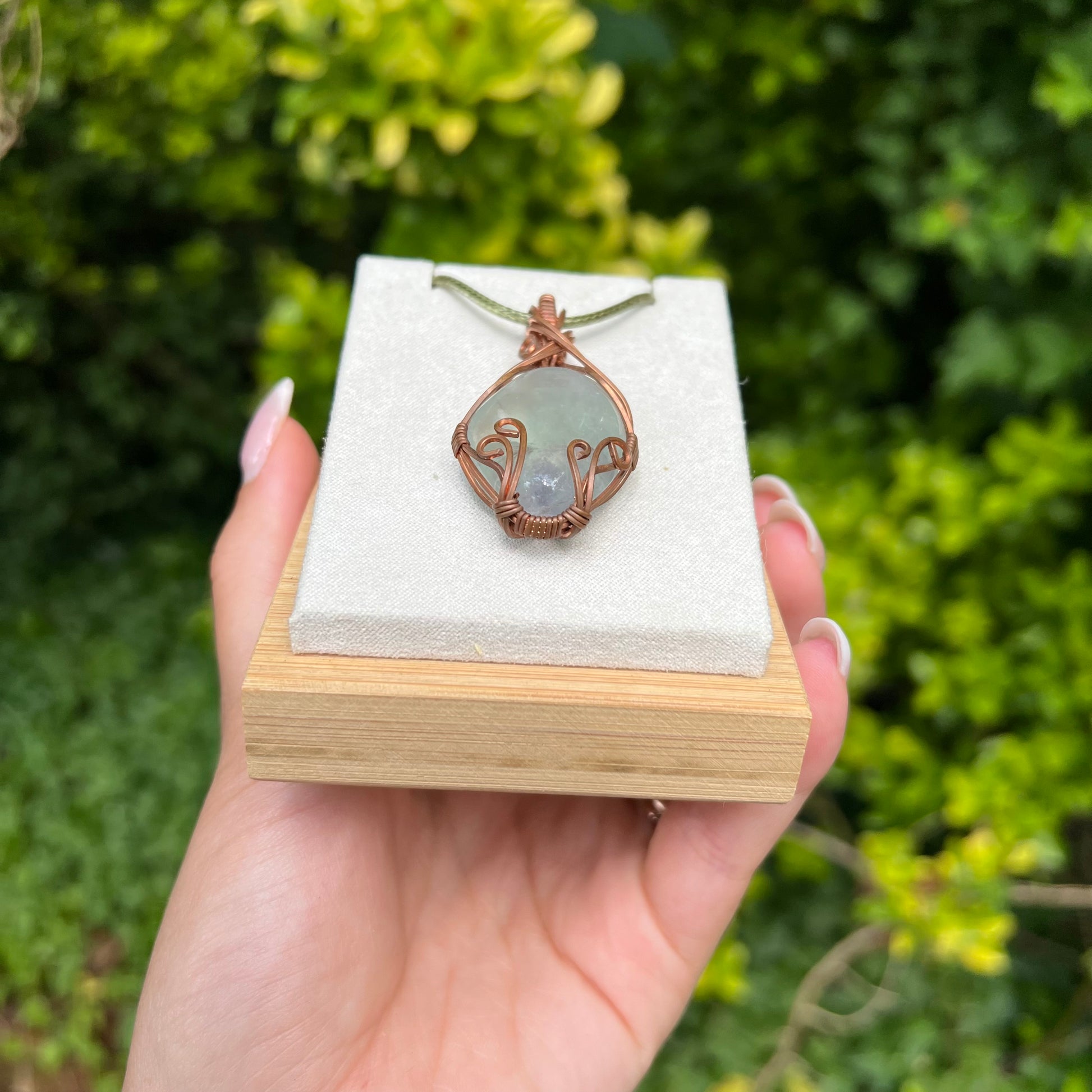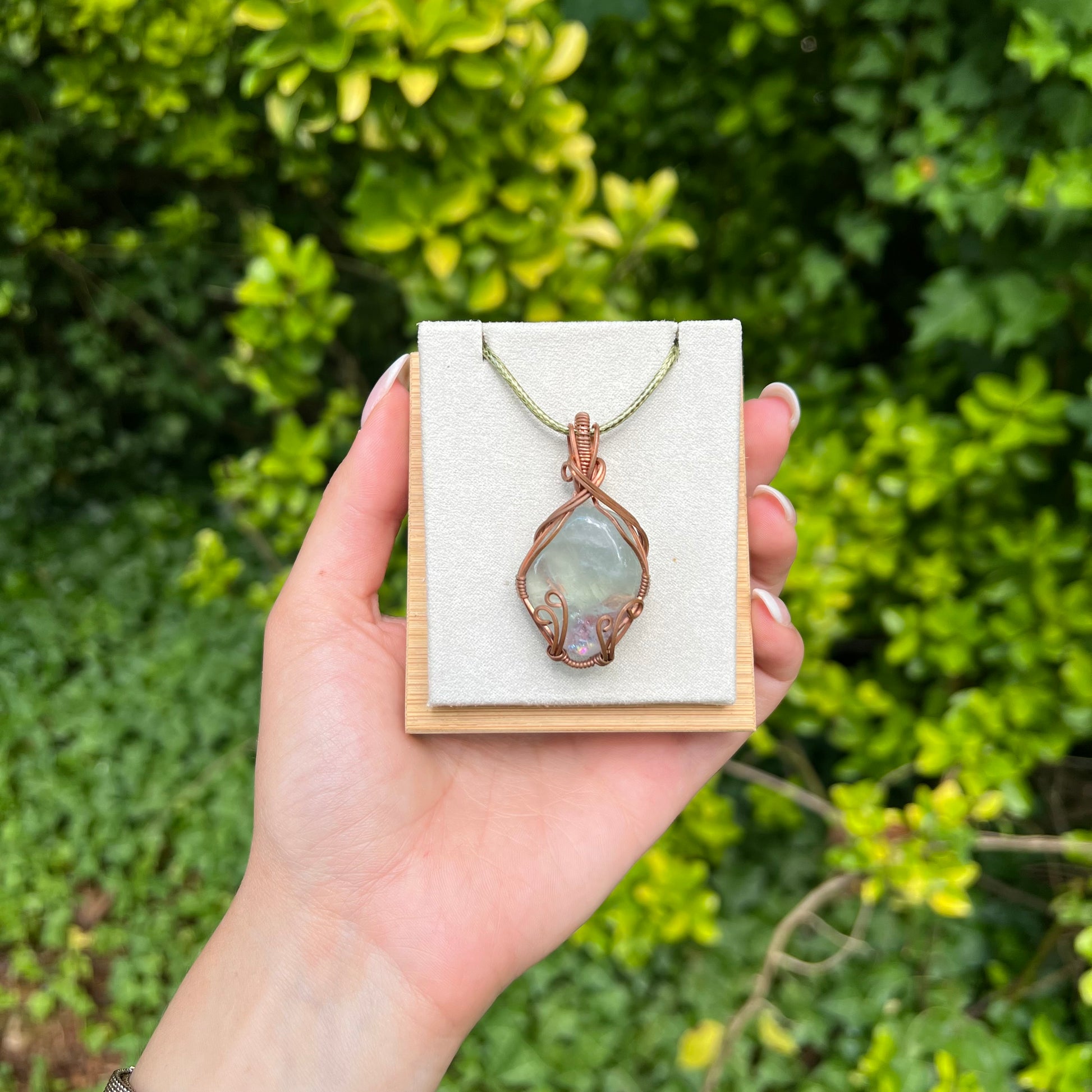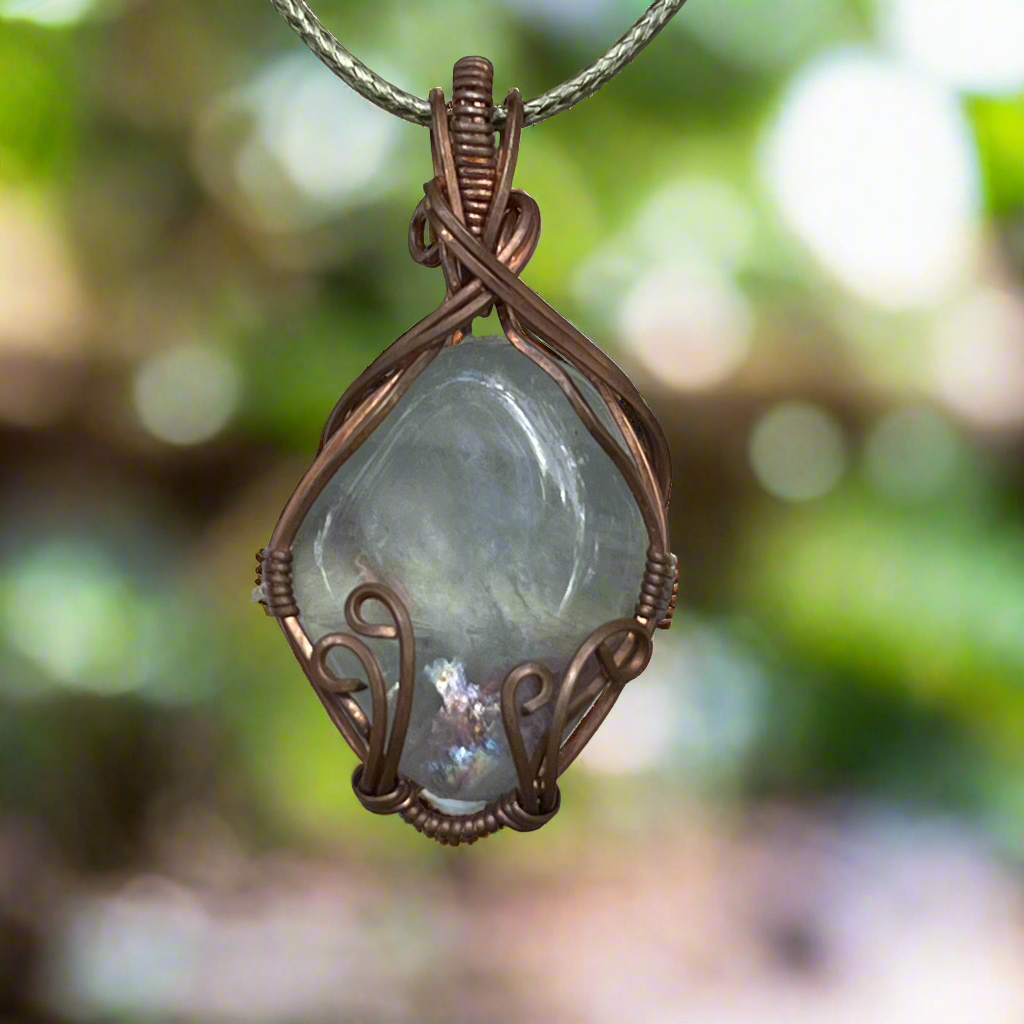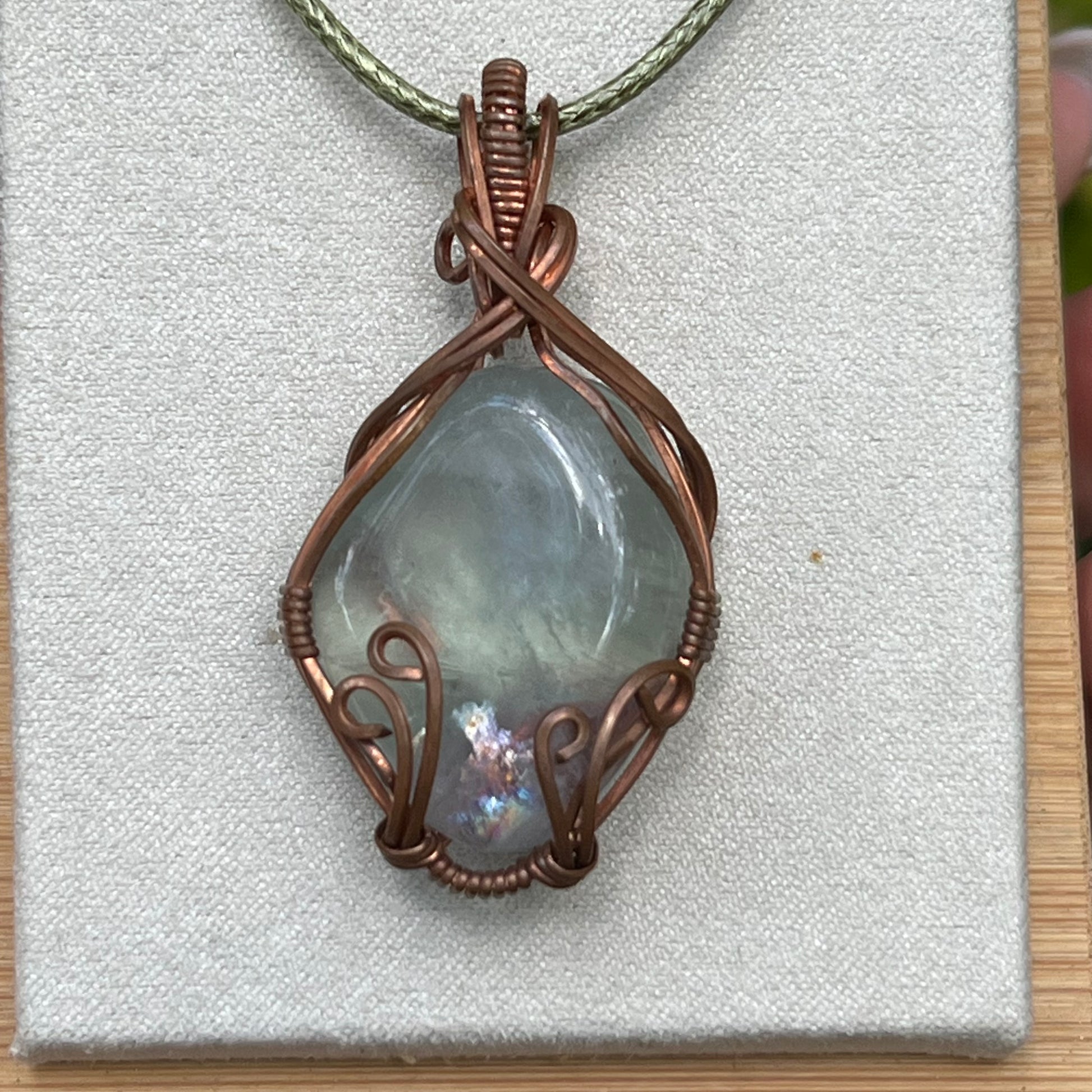 Carefully crafted, this stunning Fluorite is encased in copper wire adorned with elegant swirls. This OOAK piece comes on a green colored 18"-20" adjustable cotton cord chain. I also have black, red, grey, brown, white, beige and cream colored cotton cord chains. If you would prefer one of these colors instead, please let me know in the notes to seller at checkout. I hope that you enjoy this piece as much as I did creating it!