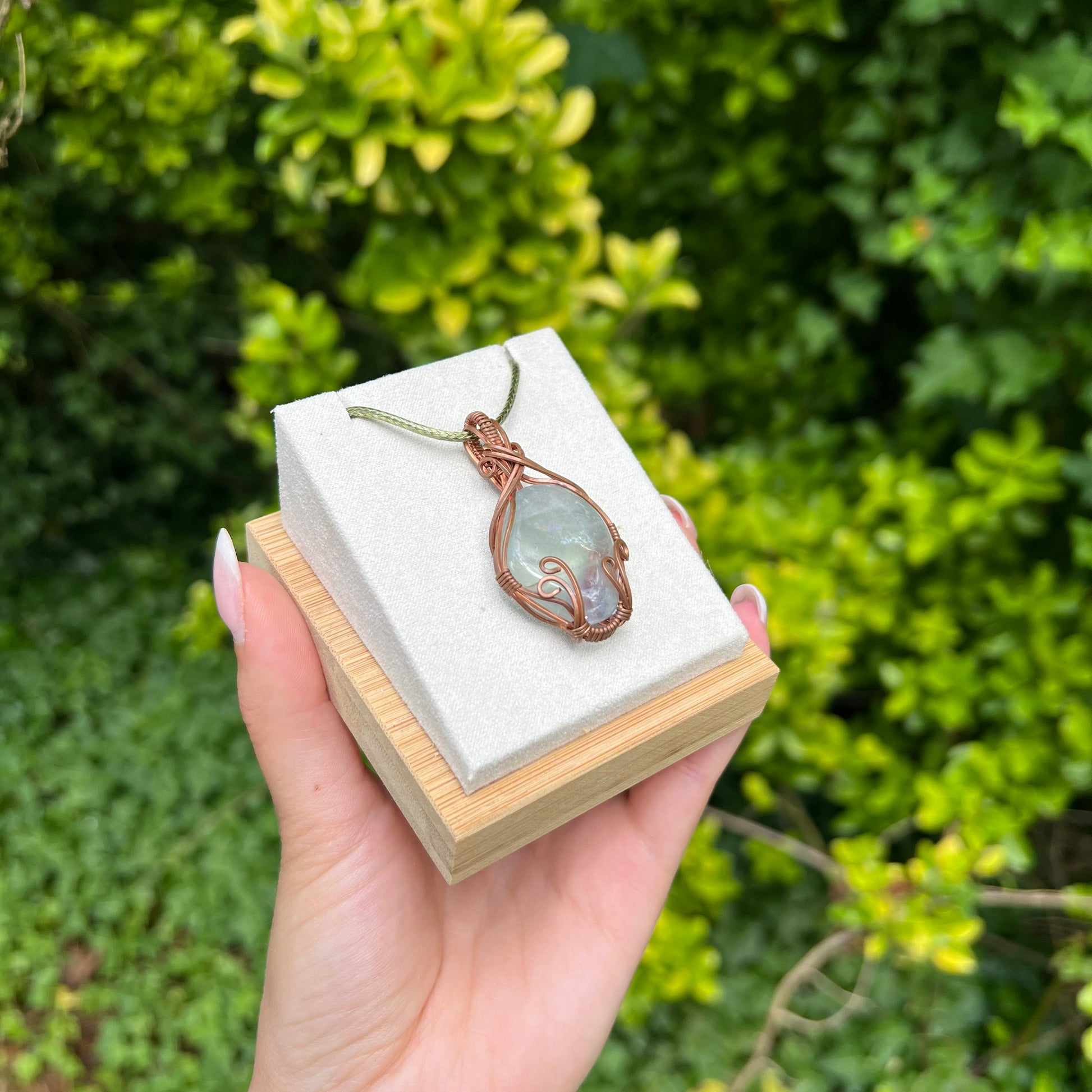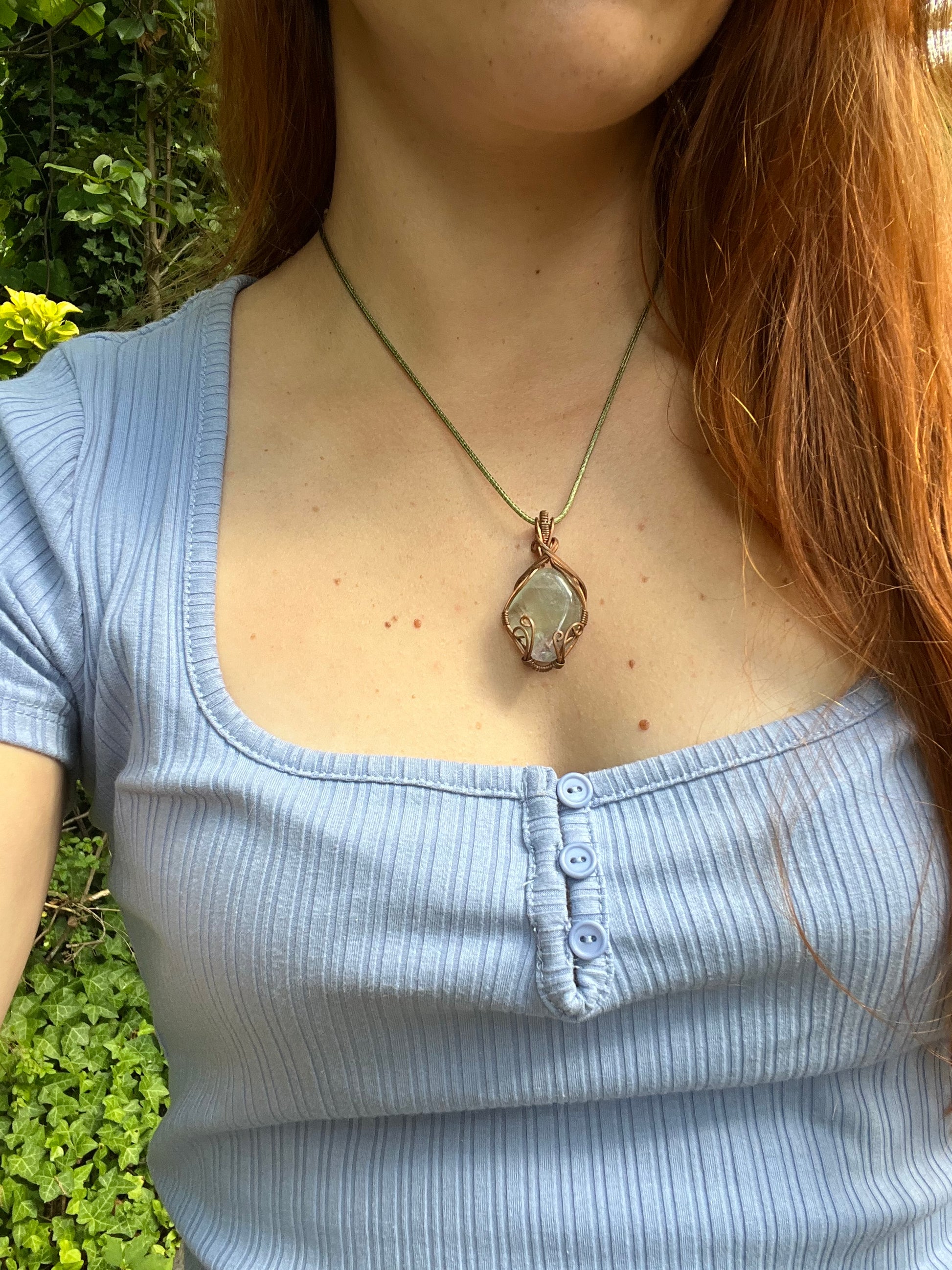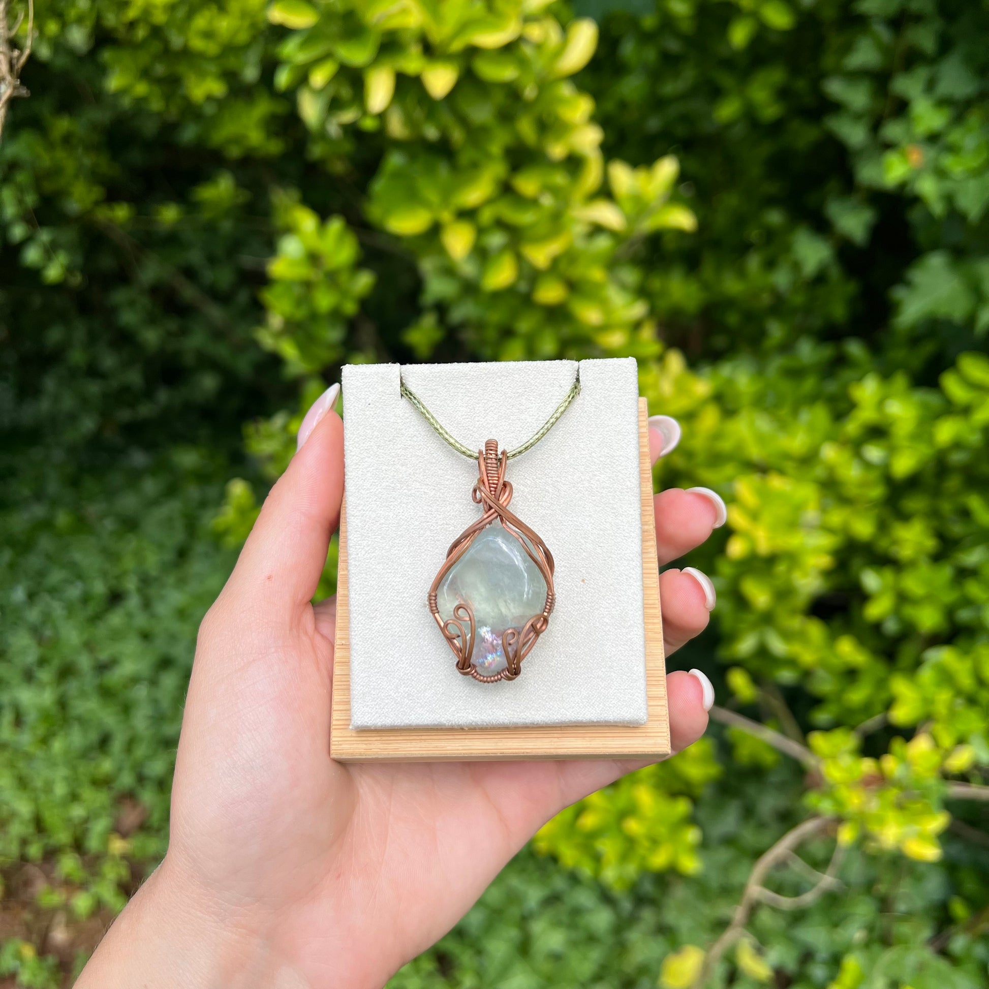 Carefully crafted, this stunning Fluorite is encased in copper wire adorned with elegant swirls. This OOAK piece comes on a green colored 18"-20" adjustable cotton cord chain. I also have black, red, grey, brown, white, beige and cream colored cotton cord chains. If you would prefer one of these colors instead, please let me know in the notes to seller at checkout. I hope that you enjoy this piece as much as I did creating it!