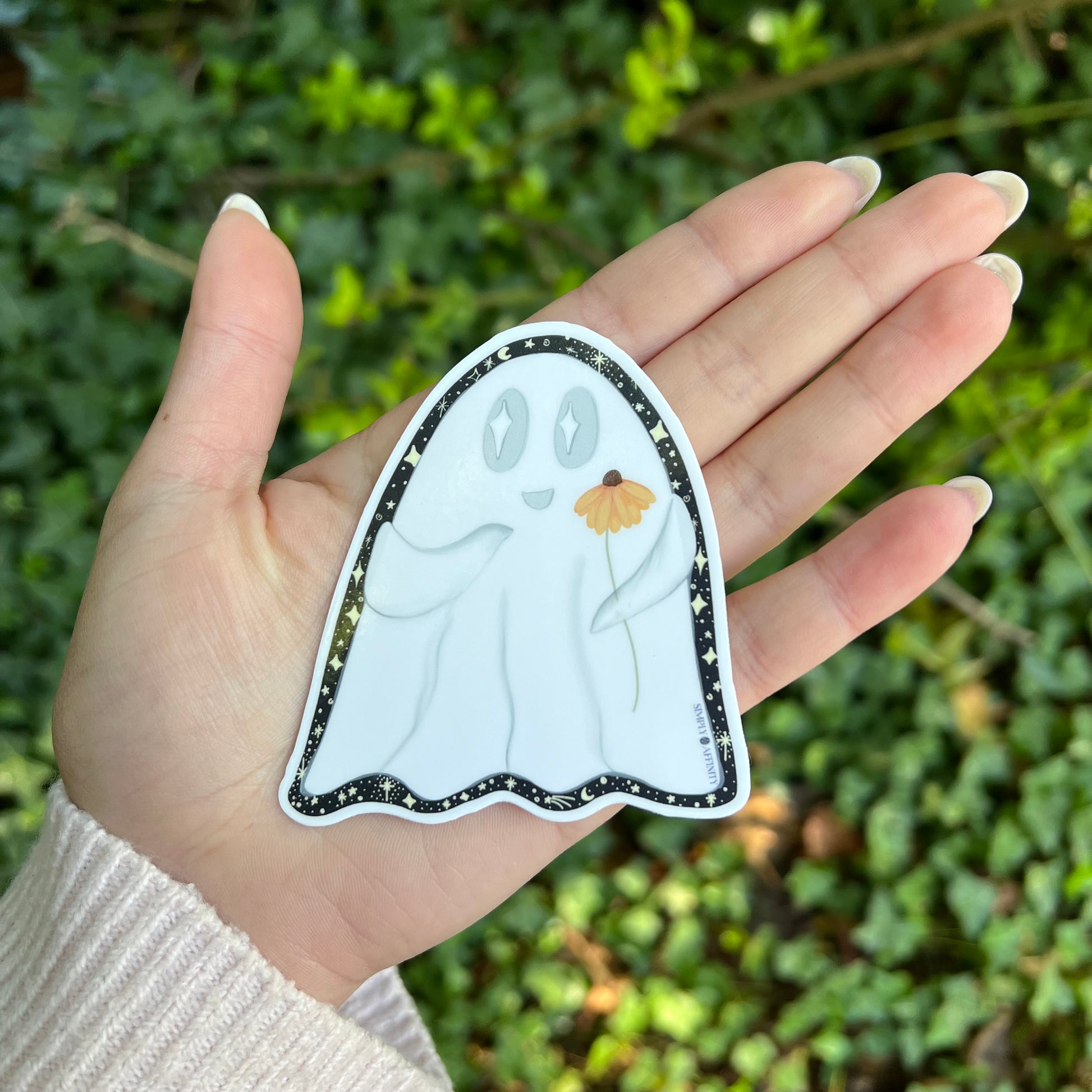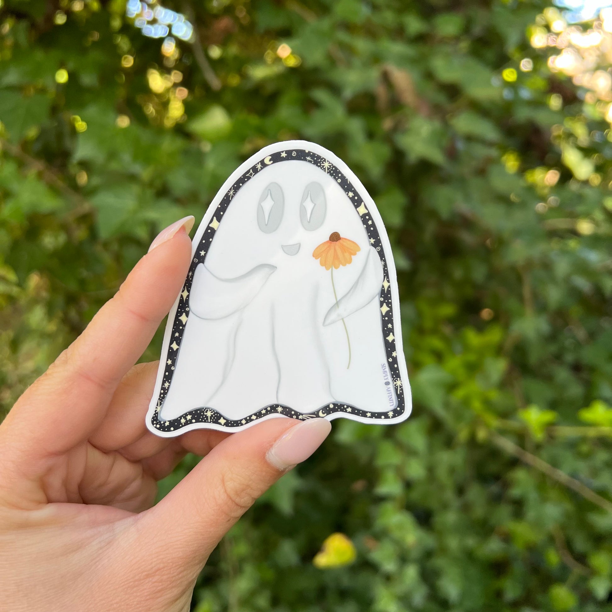 I created the original artwork to make this friendly little ghost sticker. I was inspired by one of my favorite designs in my Halloween collection of hand-sculpted polymer clay earrings! Those earrings are also coming to the shop soon!