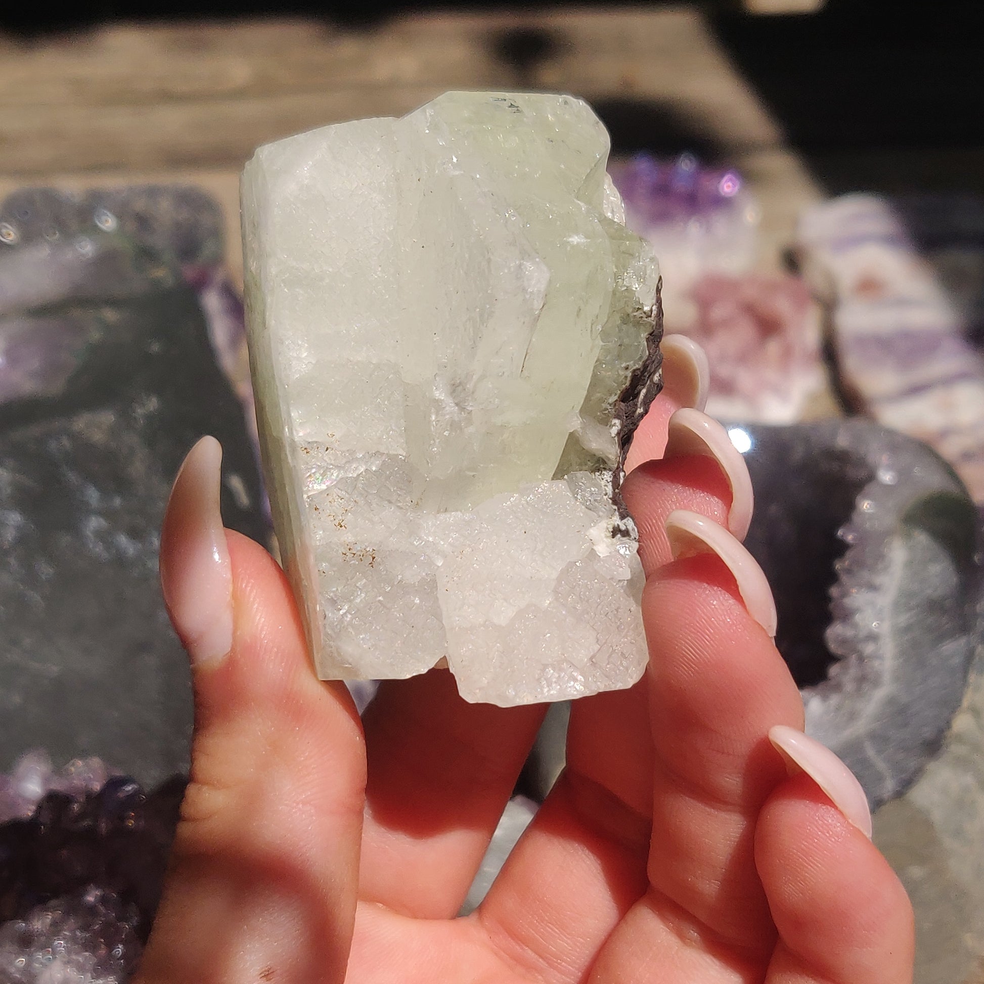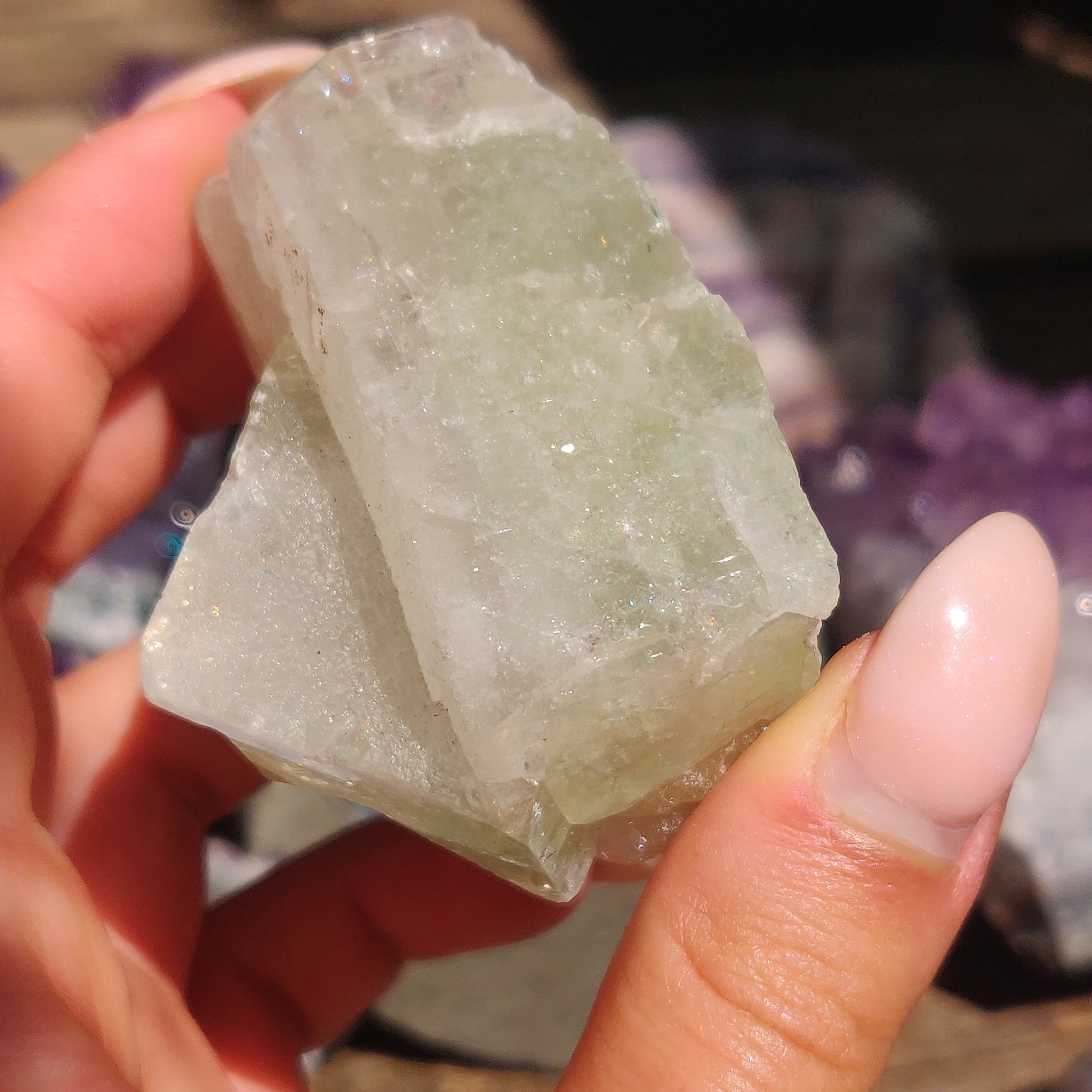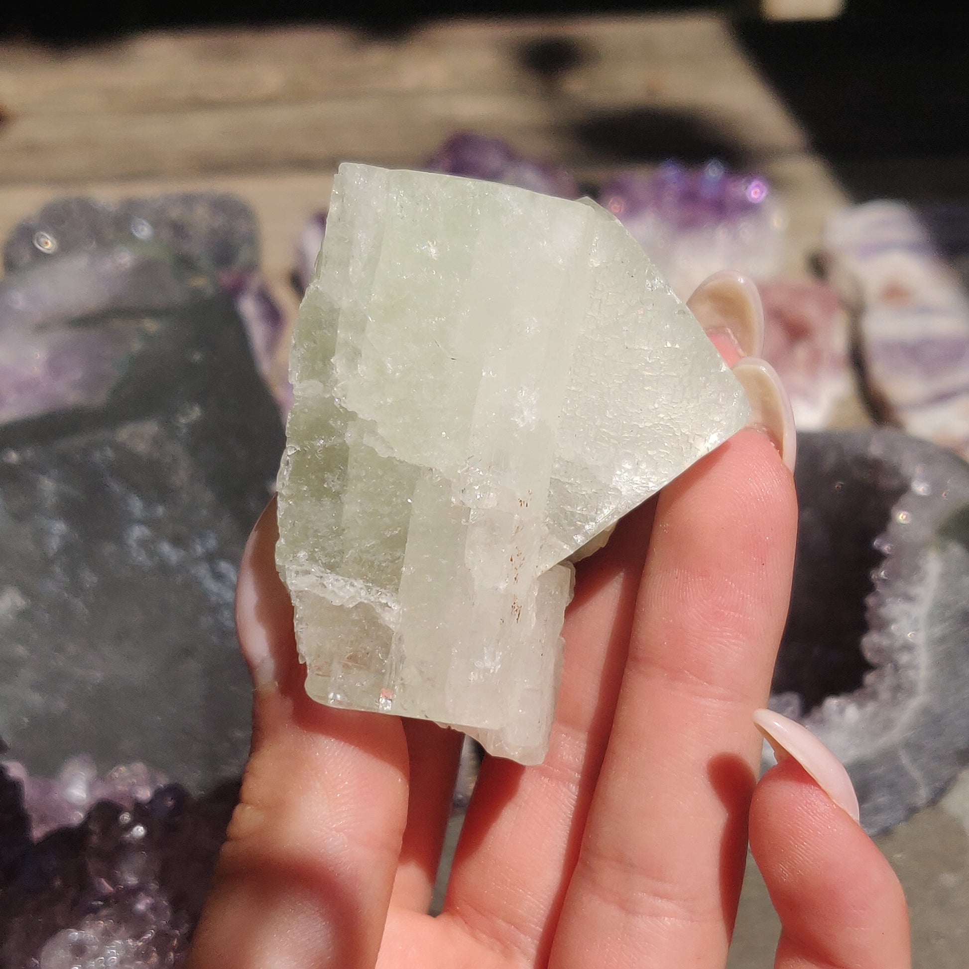 Green Apophyllite - is a high energy stone! Because it is a powerful vibrational transmitter, its presence in a room enhances the energies. It is a calming stone that reduces stress, releasing mental blockages, and negative thought patterns. It has strong links to the spiritual realm. It calms and grounds the spirit. Specifically, Green Apophyllite activates the heart chakra, and promotes an honest heart. It absorbs and transmits universal energy.