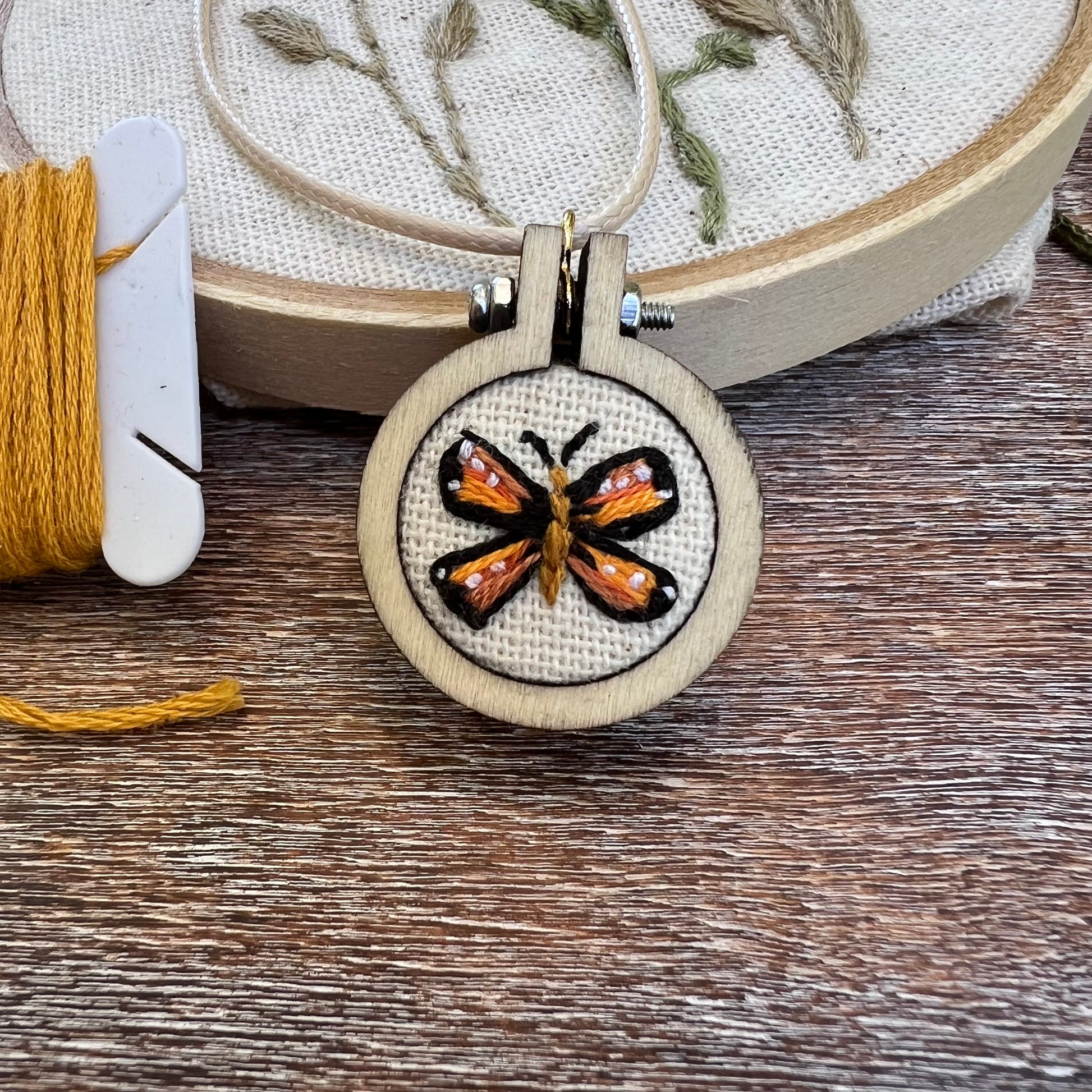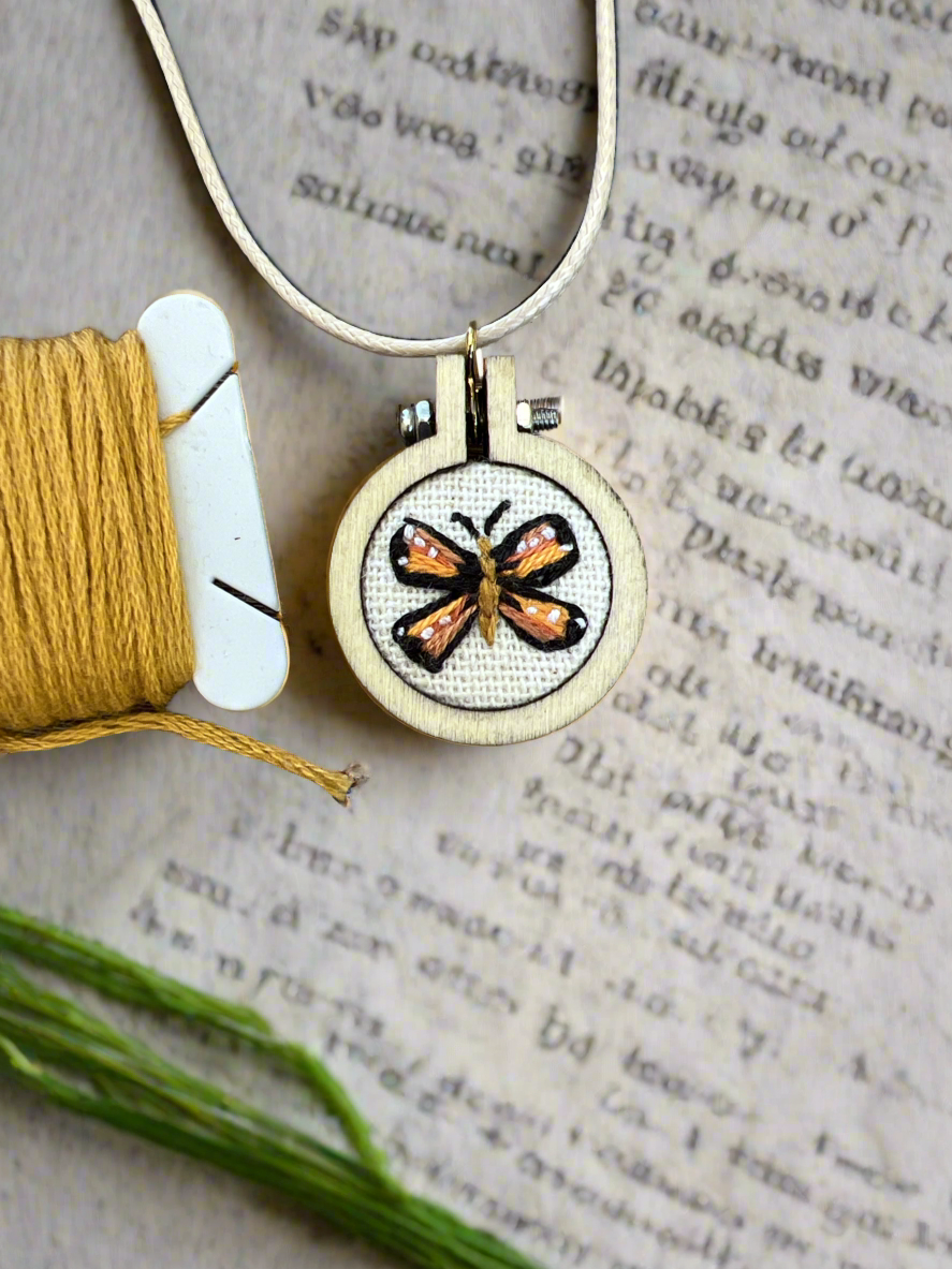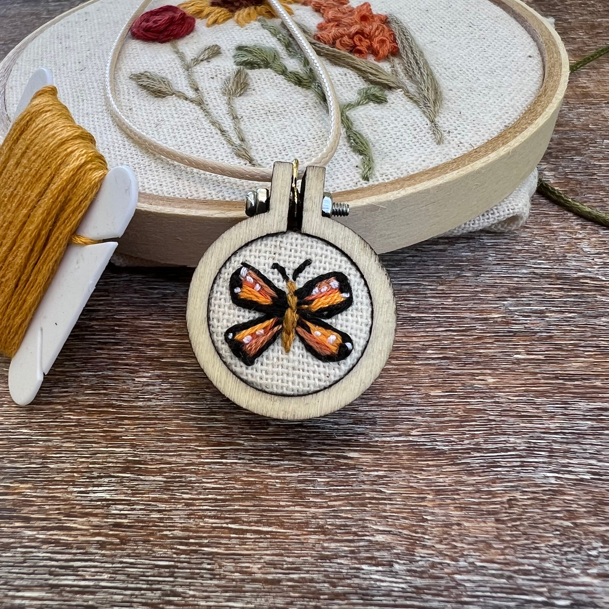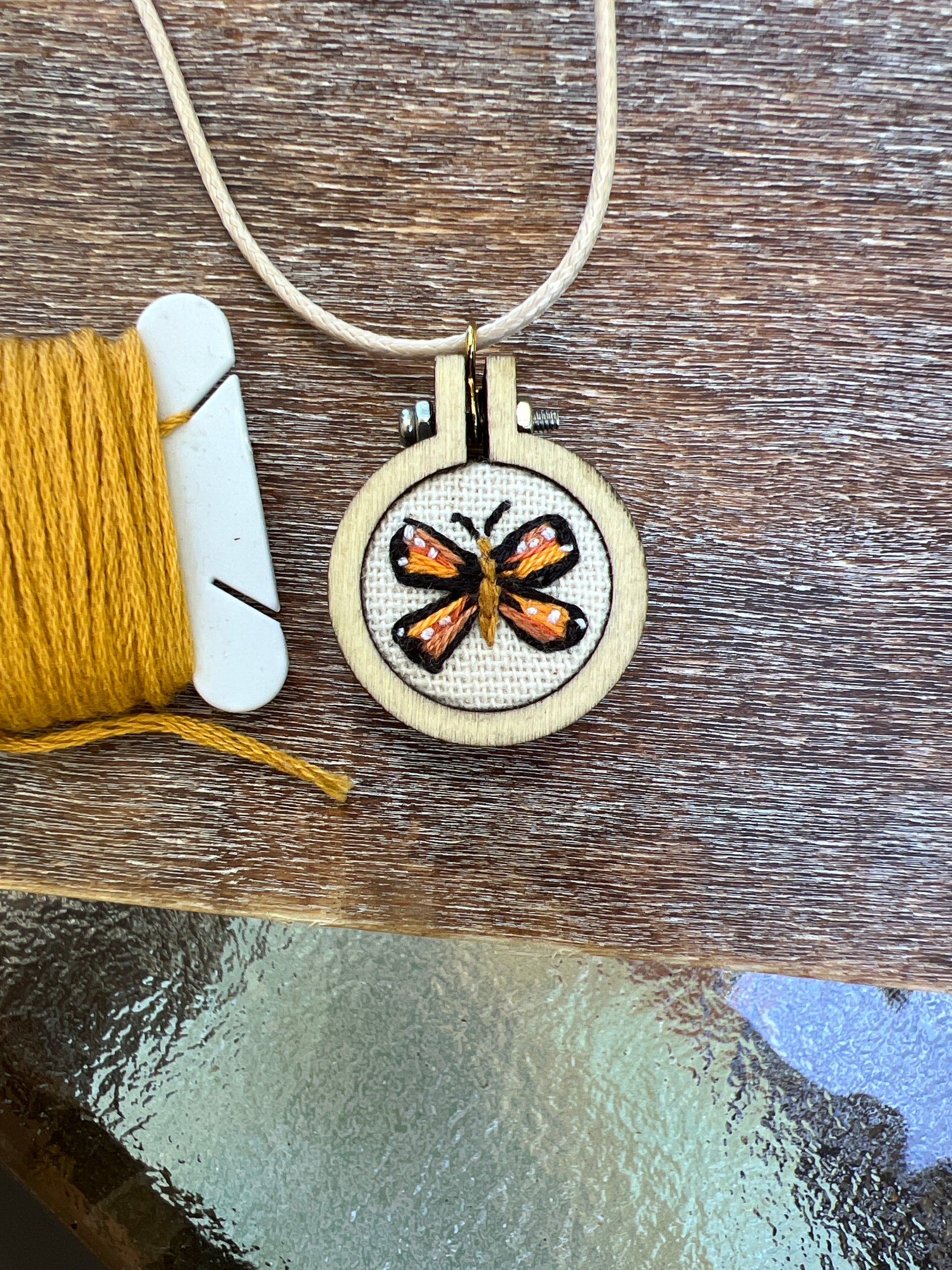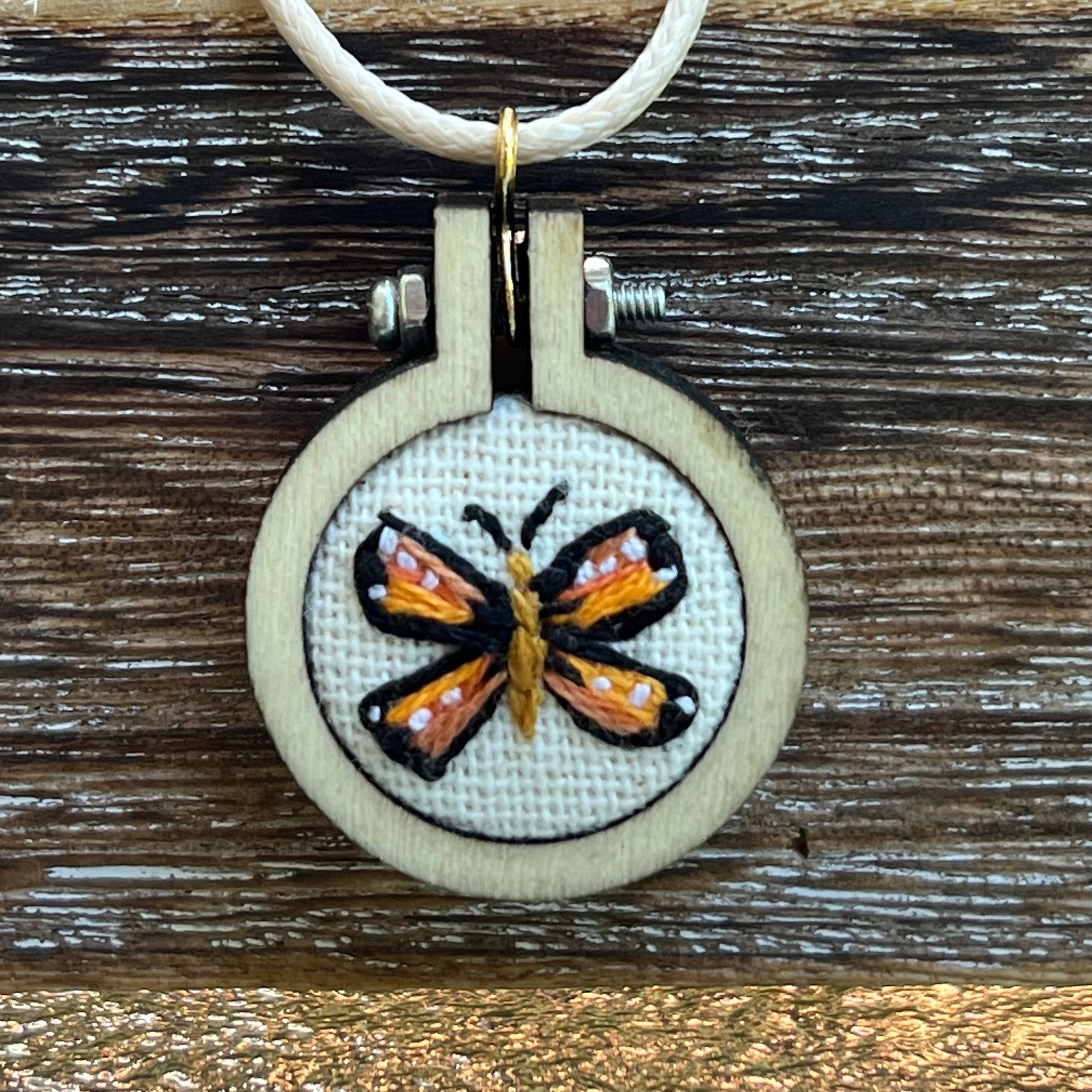 I hand-embroidered this cute mini butterfly pendant. I love creating all of the little details, and the meditative process of slowing down and embroidering. Transformed from tiny embroidered art to a wearable pendant with a teeny embroidery hoop framing, this OOAK piece comes on a beige colored 18"-20" adjustable cotton cord chain. If you would prefer a different color cotton cord, just let me know in the notes to seller. Please reference the last photograph on this listing for color options.