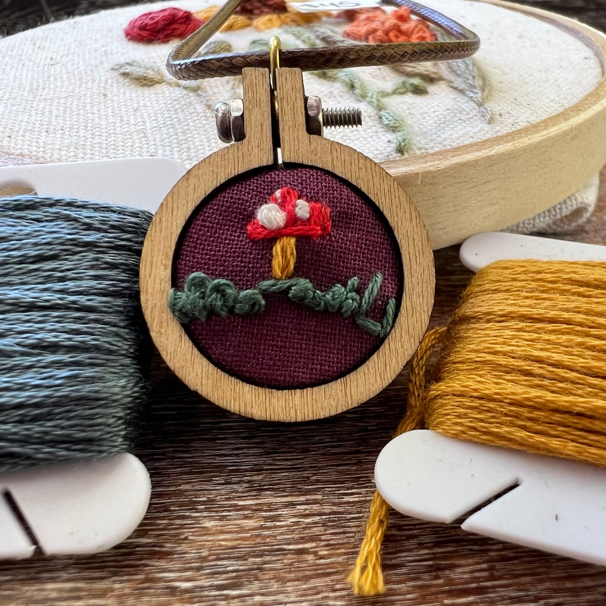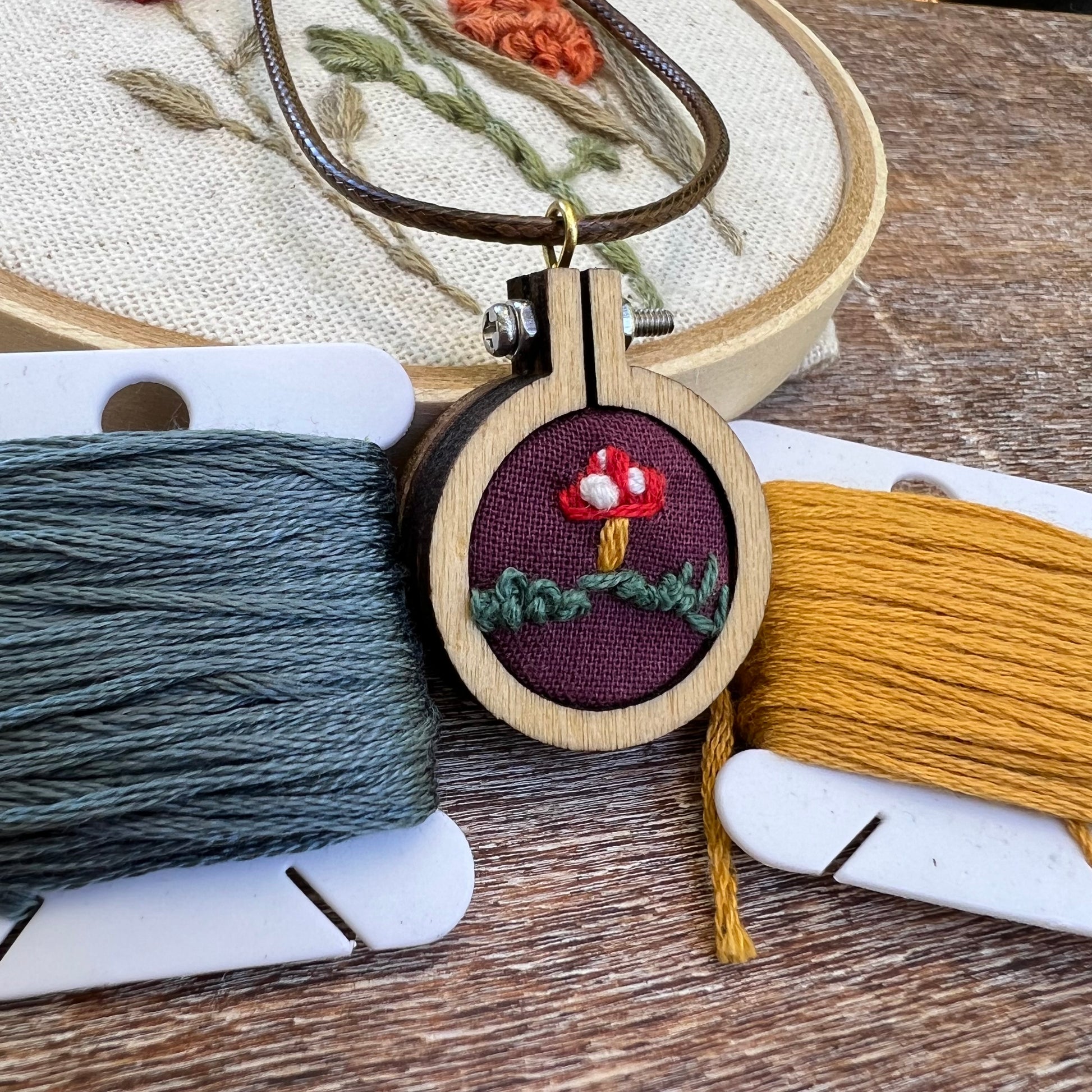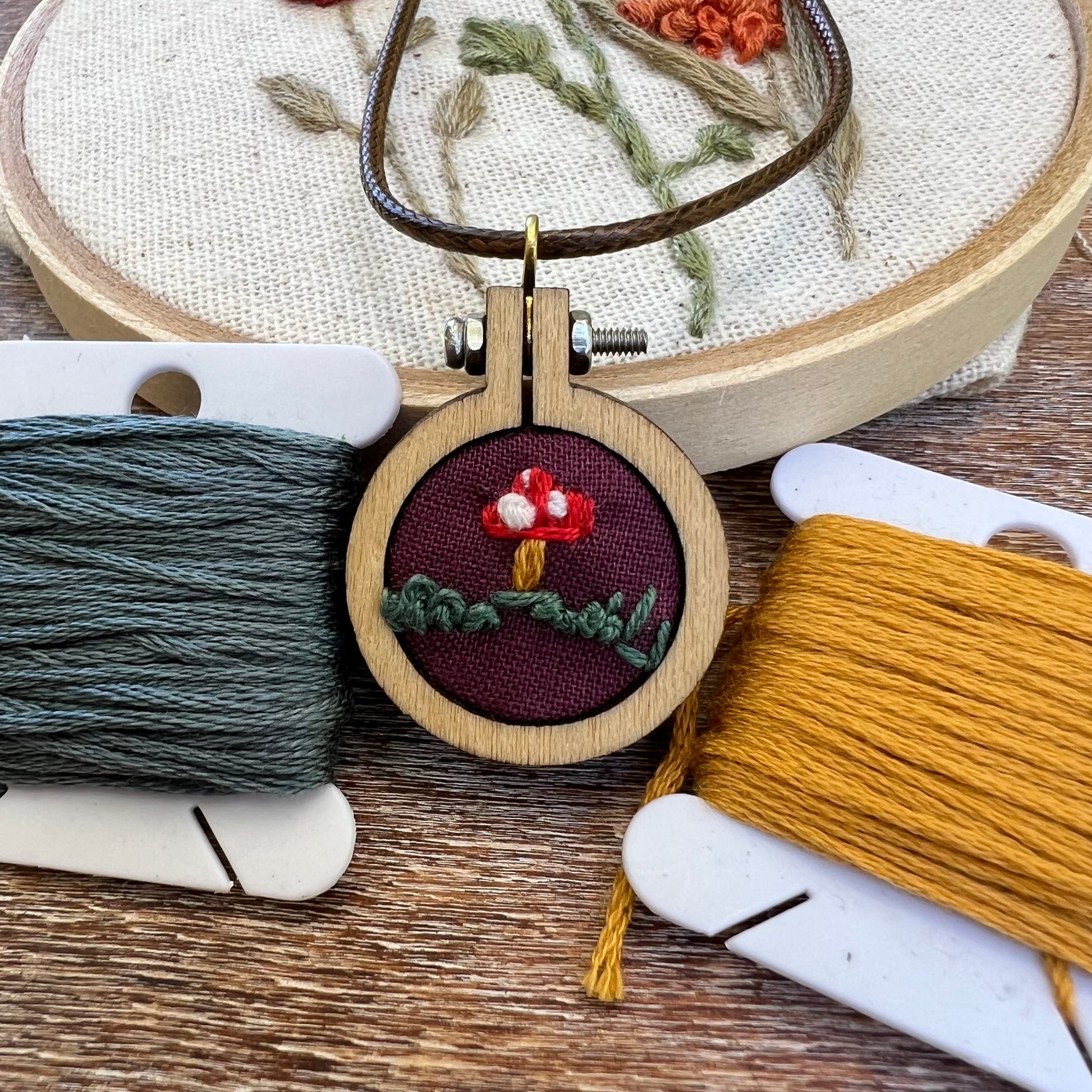 I hand-embroidered this cute mushroom pendant. I love creating all of the little details, and the meditative process of slowing down and embroidering. Transformed from tiny embroidered art to a wearable pendant with a teeny embroidery hoop framing, this OOAK piece comes on a dark brown colored 18"-20" adjustable cotton cord chain.