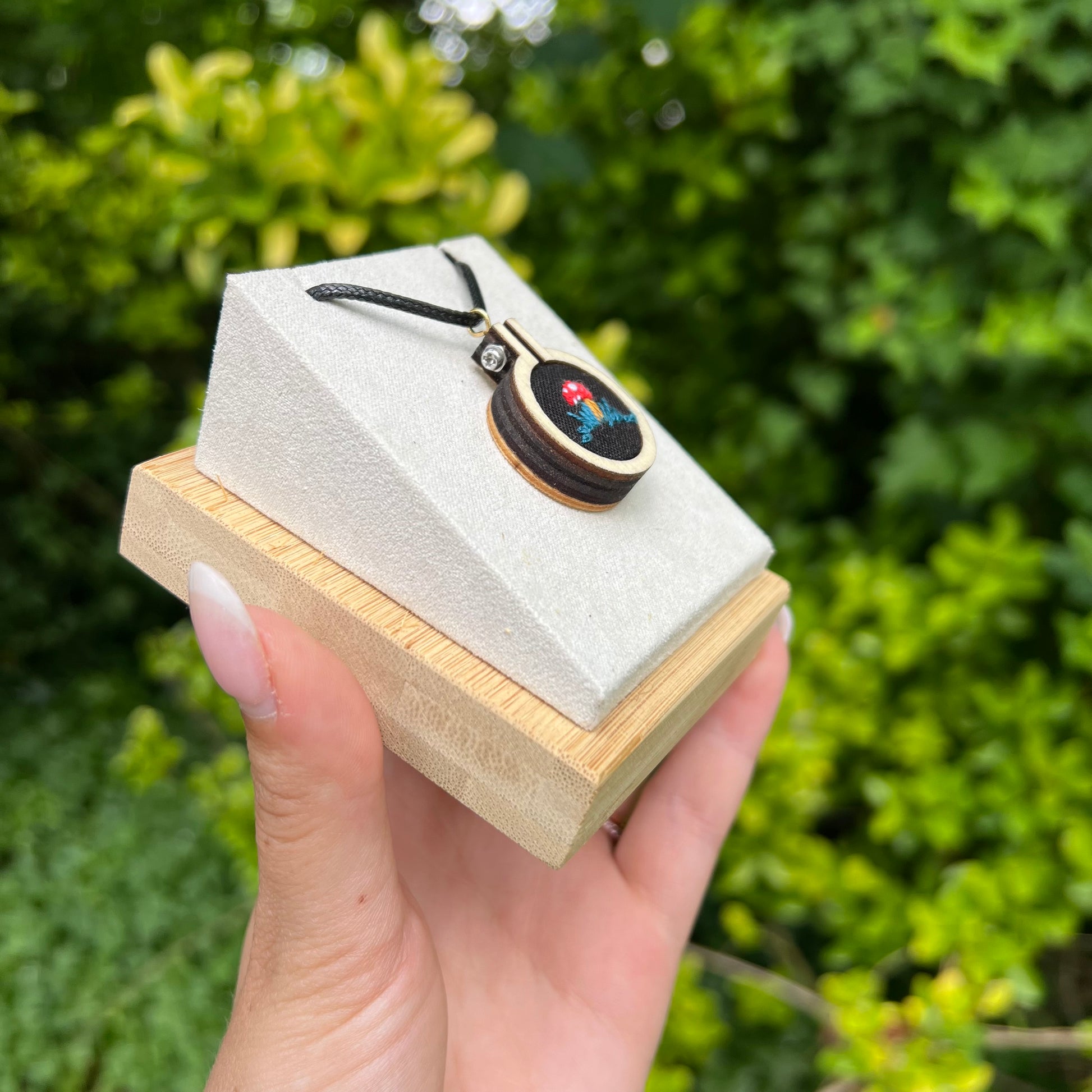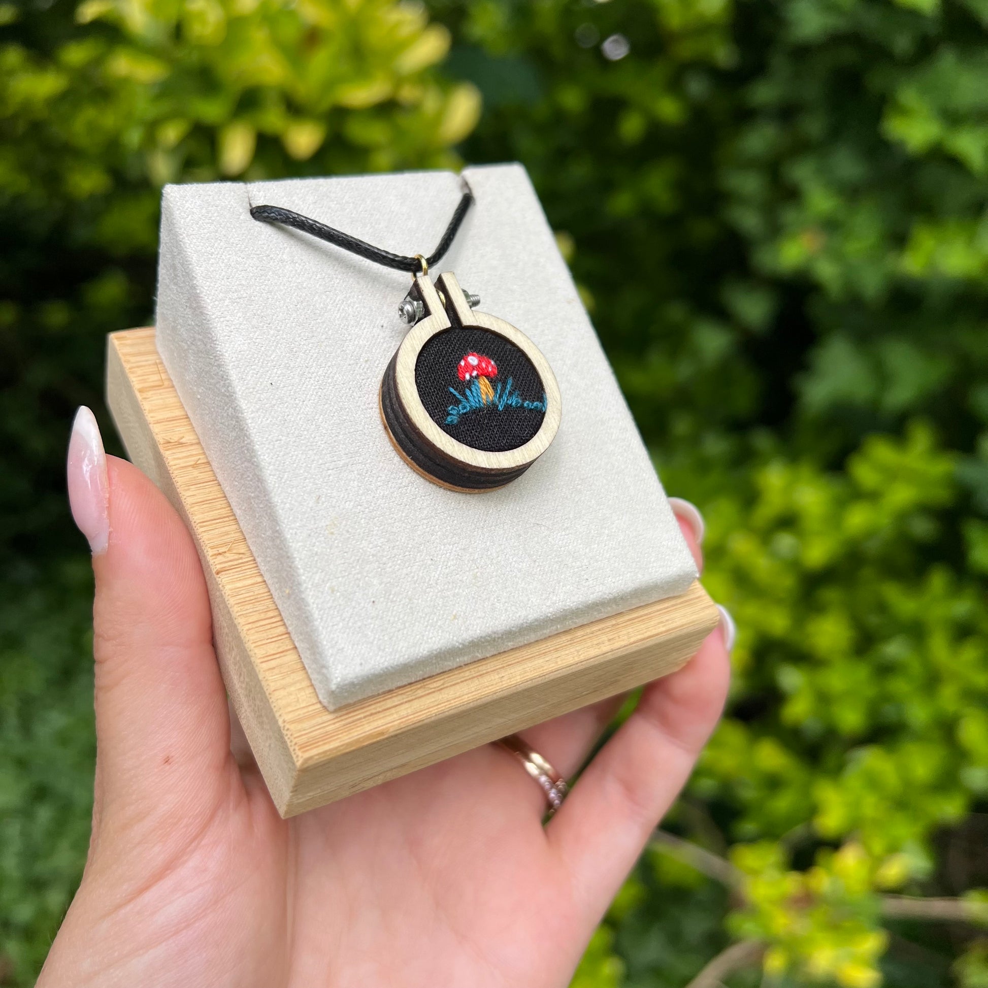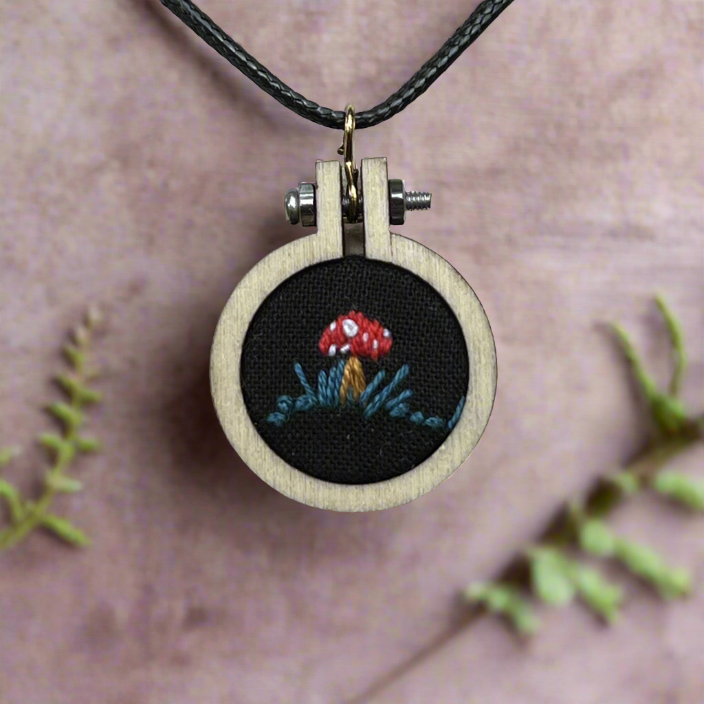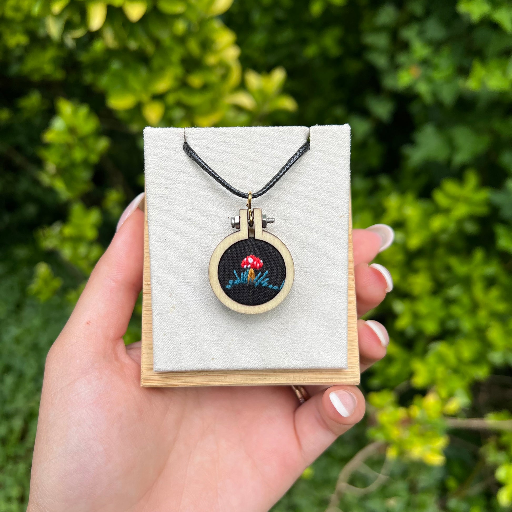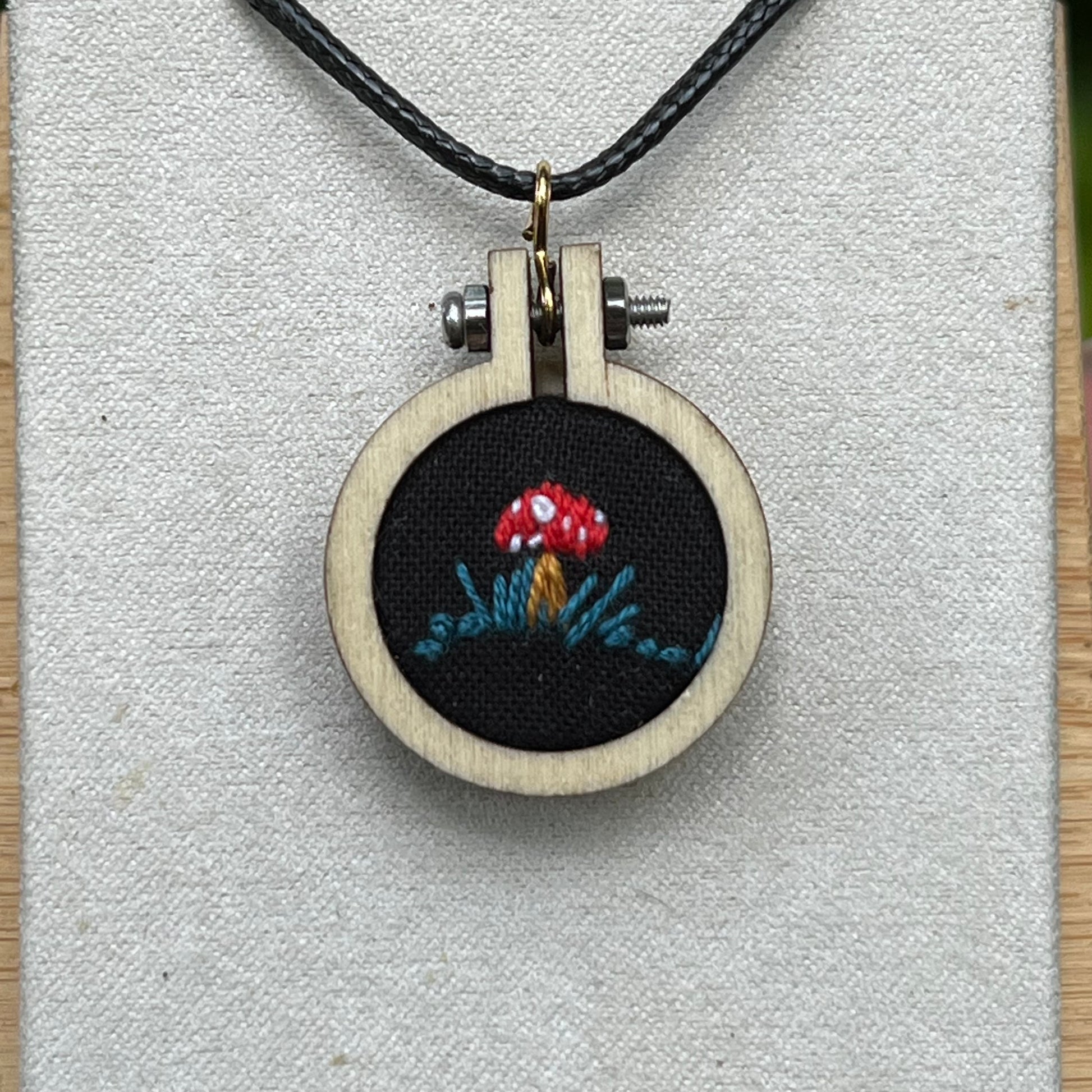 I hand-embroidered this cute mushroom pendant. I love creating all of the little details, and the meditative process of slowing down and embroidering. Transformed from tiny embroidered art to a wearable pendant with a teeny embroidery hoop framing, this OOAK piece comes on a black colored 18"-20" adjustable cotton cord chain.