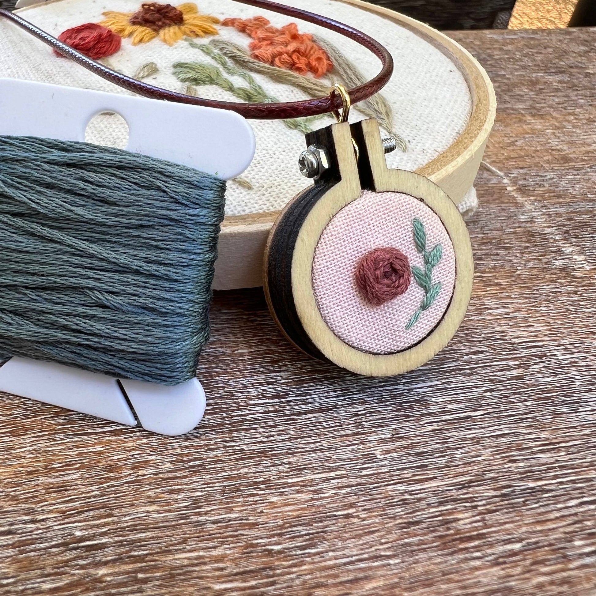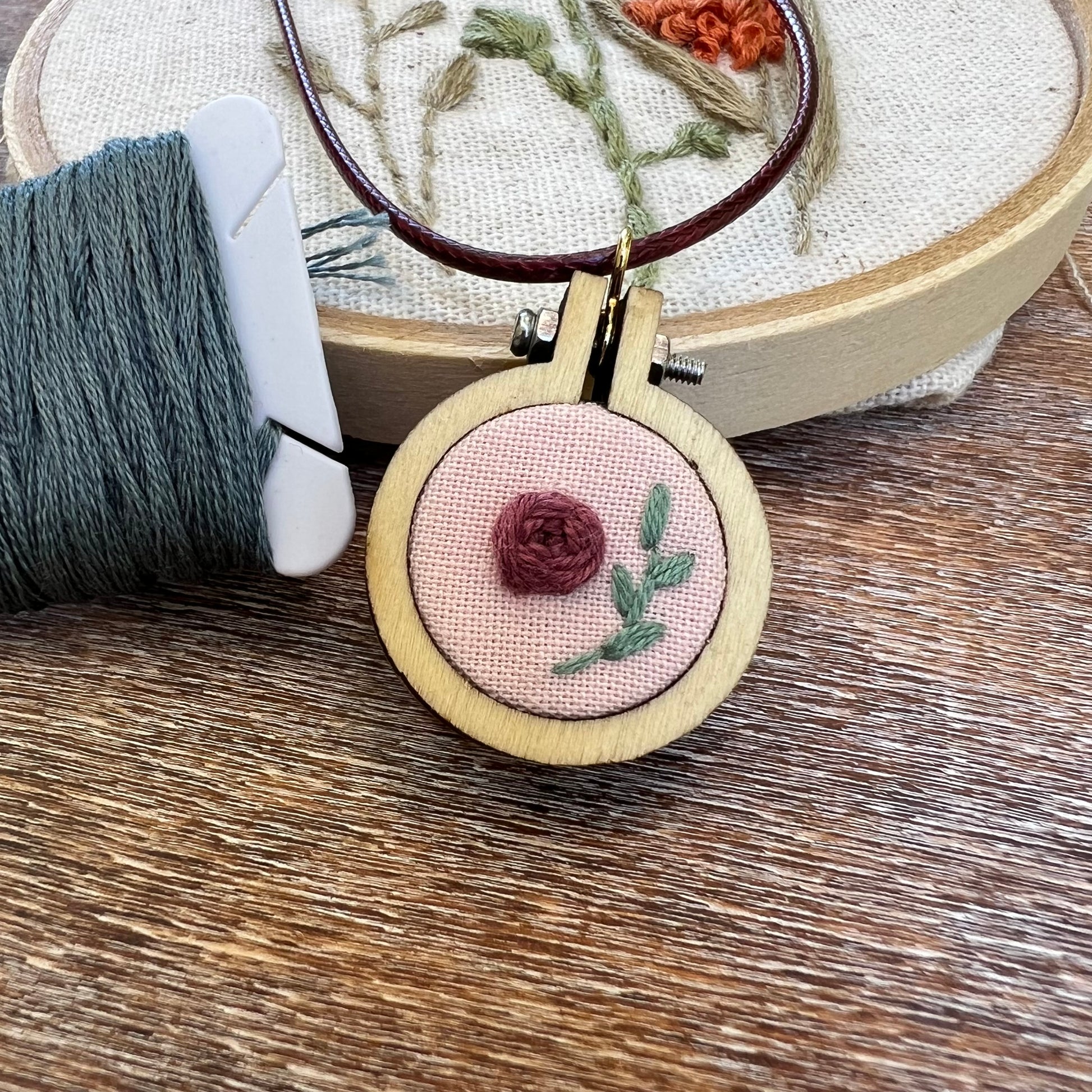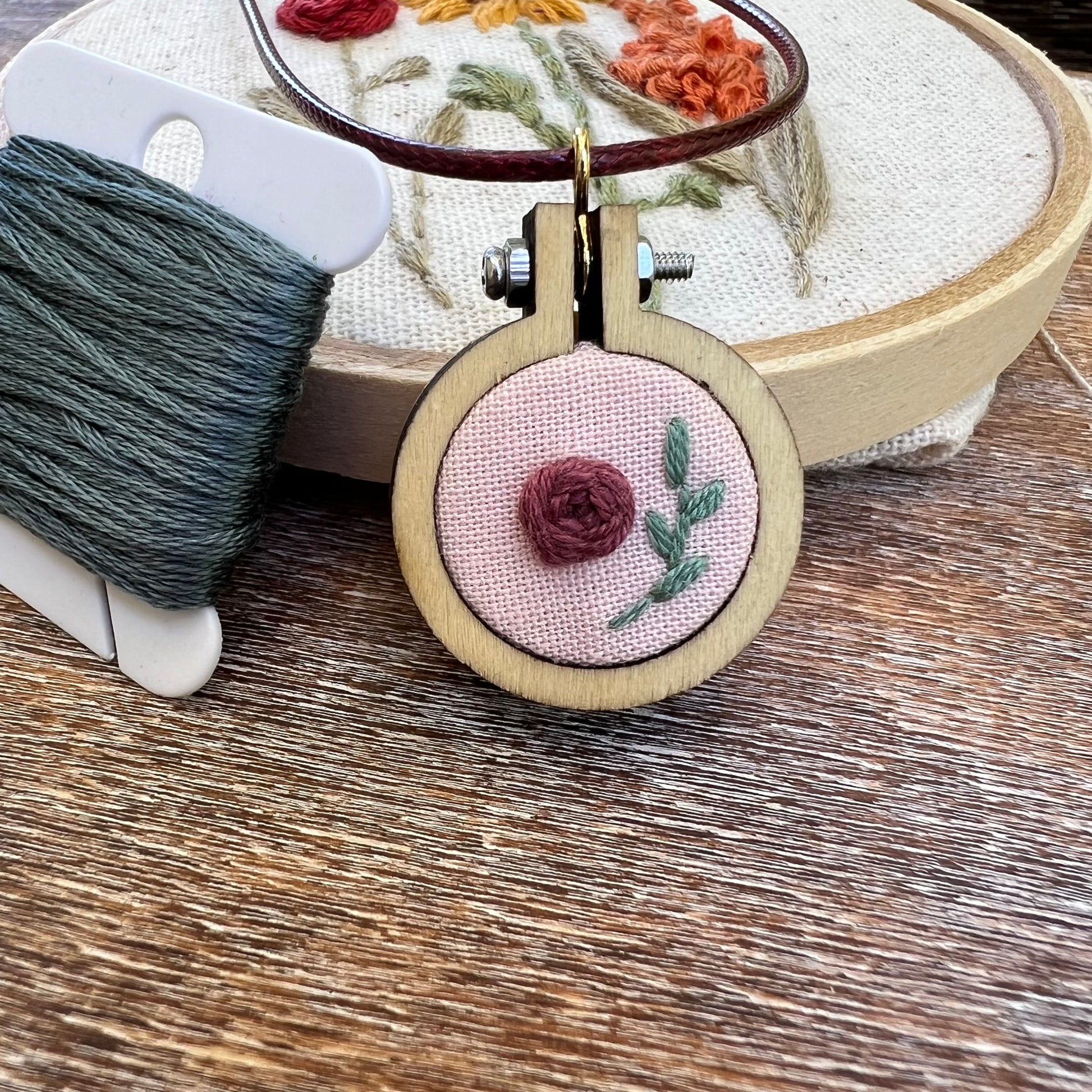 I hand-embroidered this cute mini rose & vine pendant. I love creating all of the little details, and the meditative process of slowing down and embroidering. Transformed from tiny embroidered art to a wearable pendant with a teeny embroidery hoop framing, this OOAK piece comes on a red colored 18"-20" adjustable cotton cord chain.