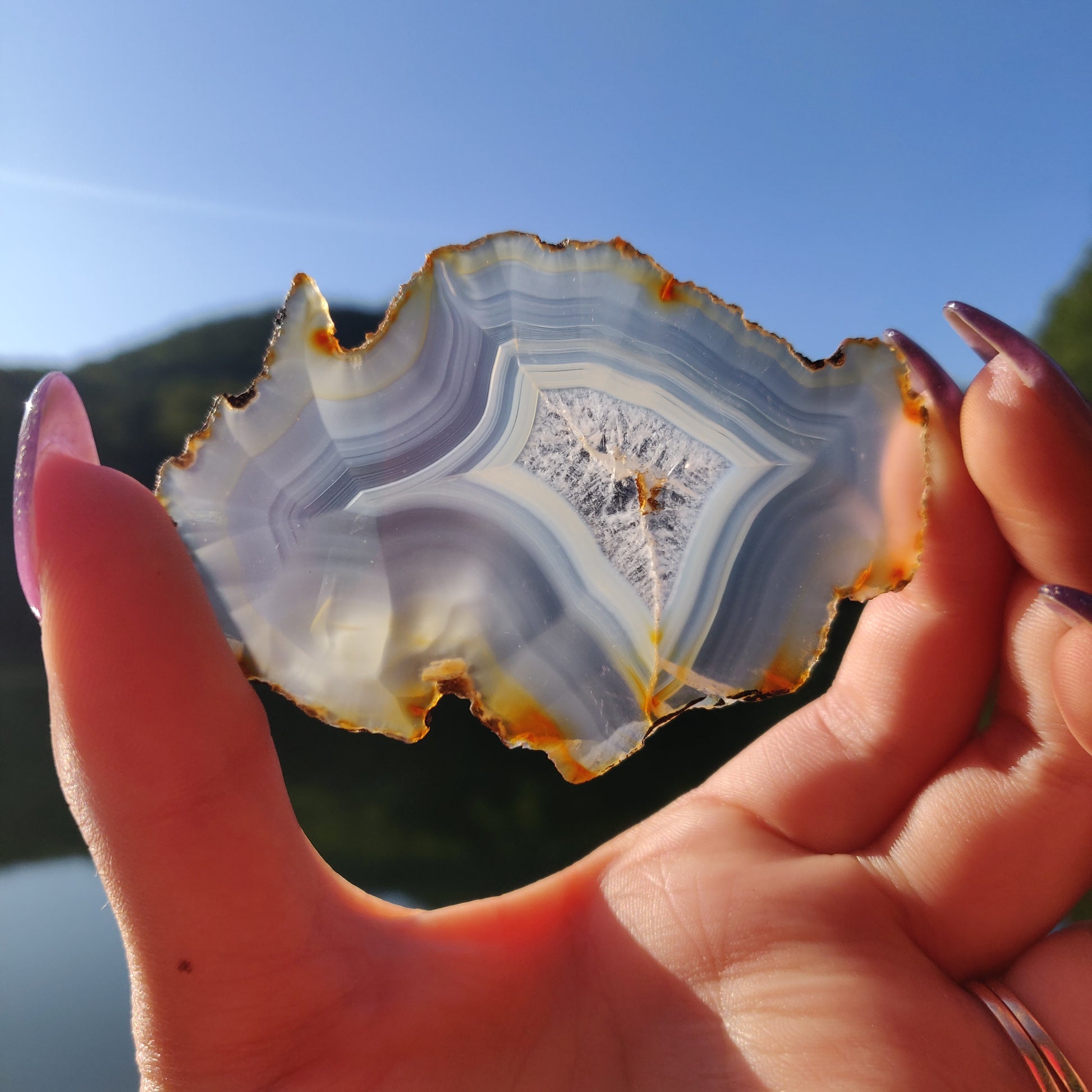 Agate forms when microscopic crystals of quartz are laid down in bands. Agate is a very grounding stone. It brings emotional, physical and intellectual balance. Please note: This piece is hand-polished, and it will have imperfections.