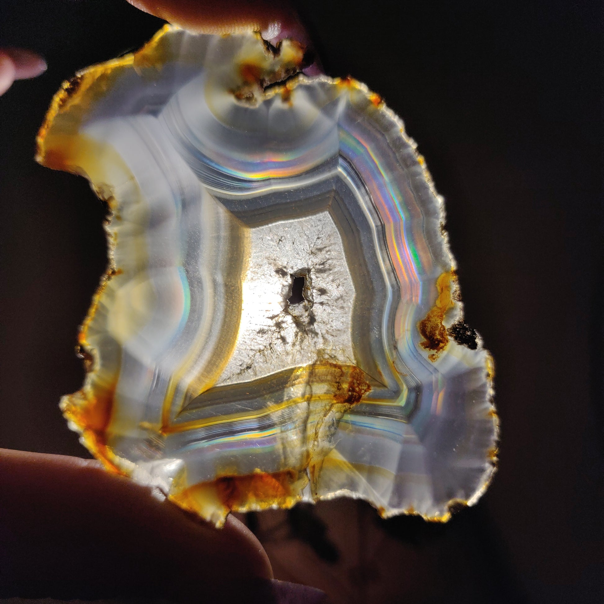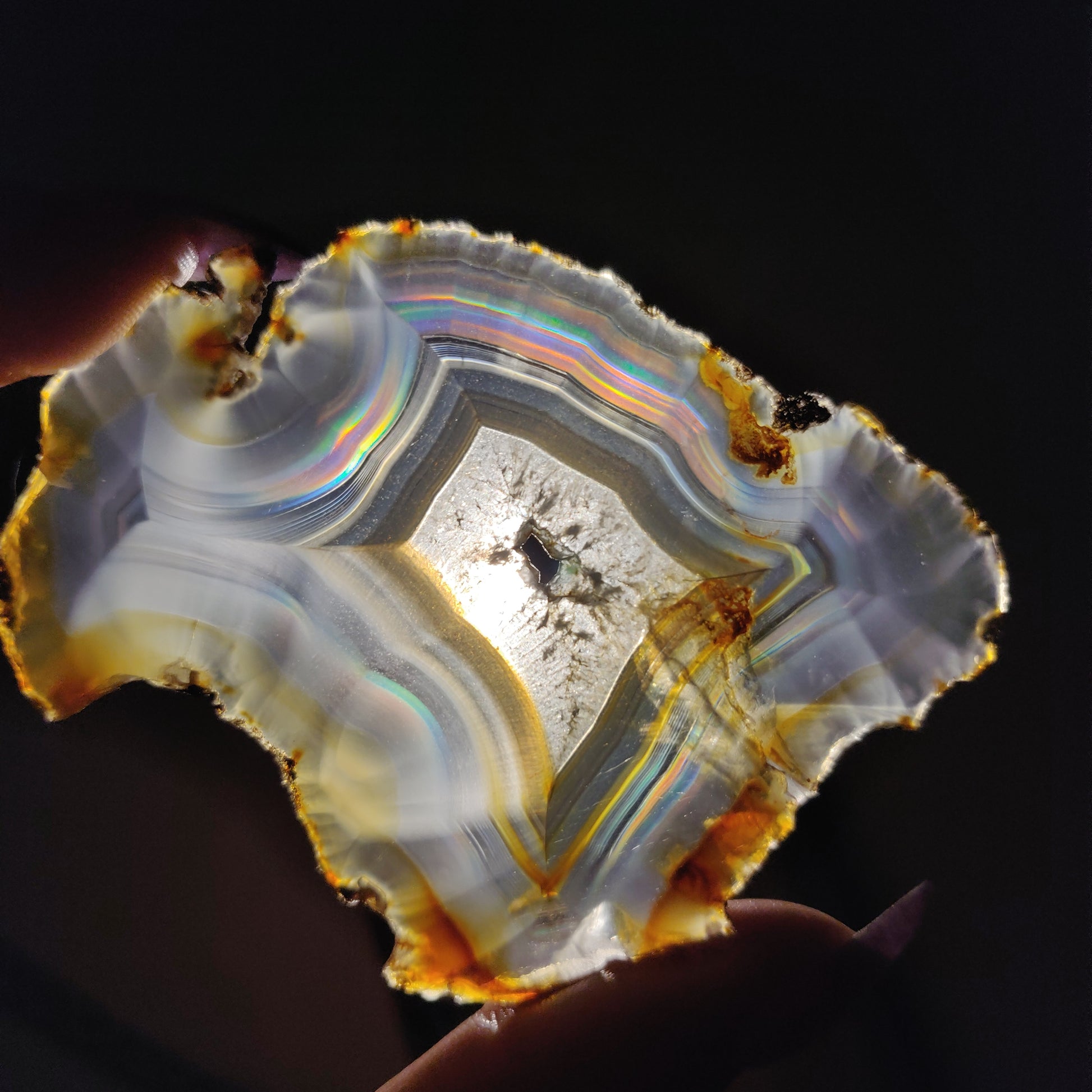 This incredibly rare Iris Agate slice is from Indonesia. It looks like a regular slice of agate until it is viewed through transmitted light, and then an incredible spectrum of colors appears. There are said to be a very small percentage of iris agates in the world. Furthermore, they have to be cut and polished just right and sliced very thin for the rainbows to be visible, making them even harder to come by! You can best enjoy your iris agate backlit with a bright flashlight in a dim environment. Cellphone flashlights work surprisingly well! The rainbows can also be viewed in bright sunshine, but you have to be very careful not to look directly into the sun to avoid eye damage, so the flashlight method is what we suggest.