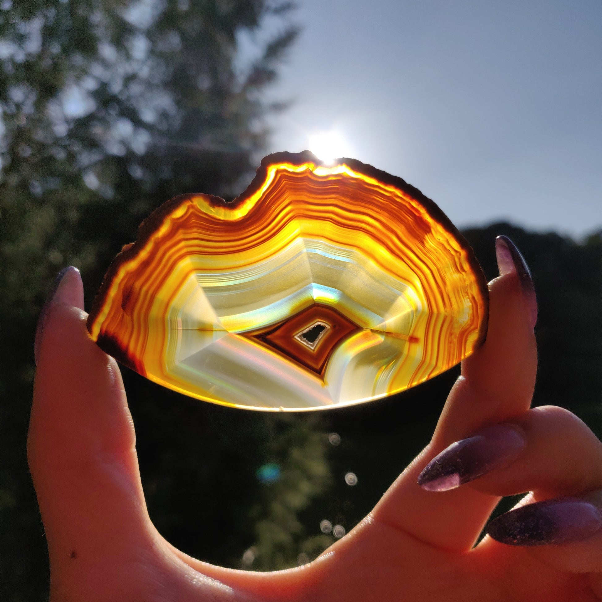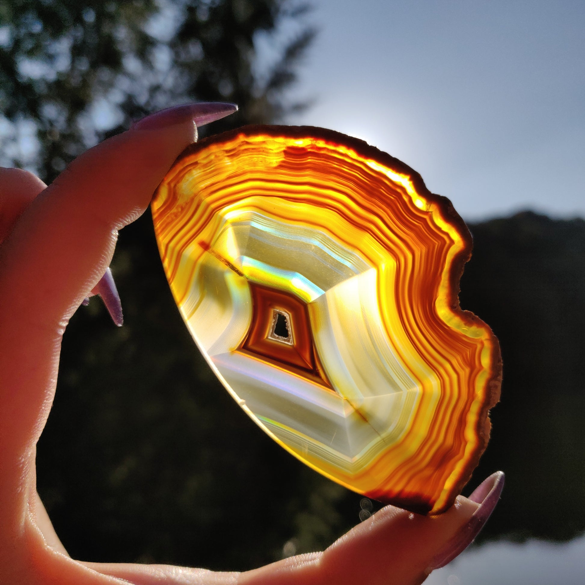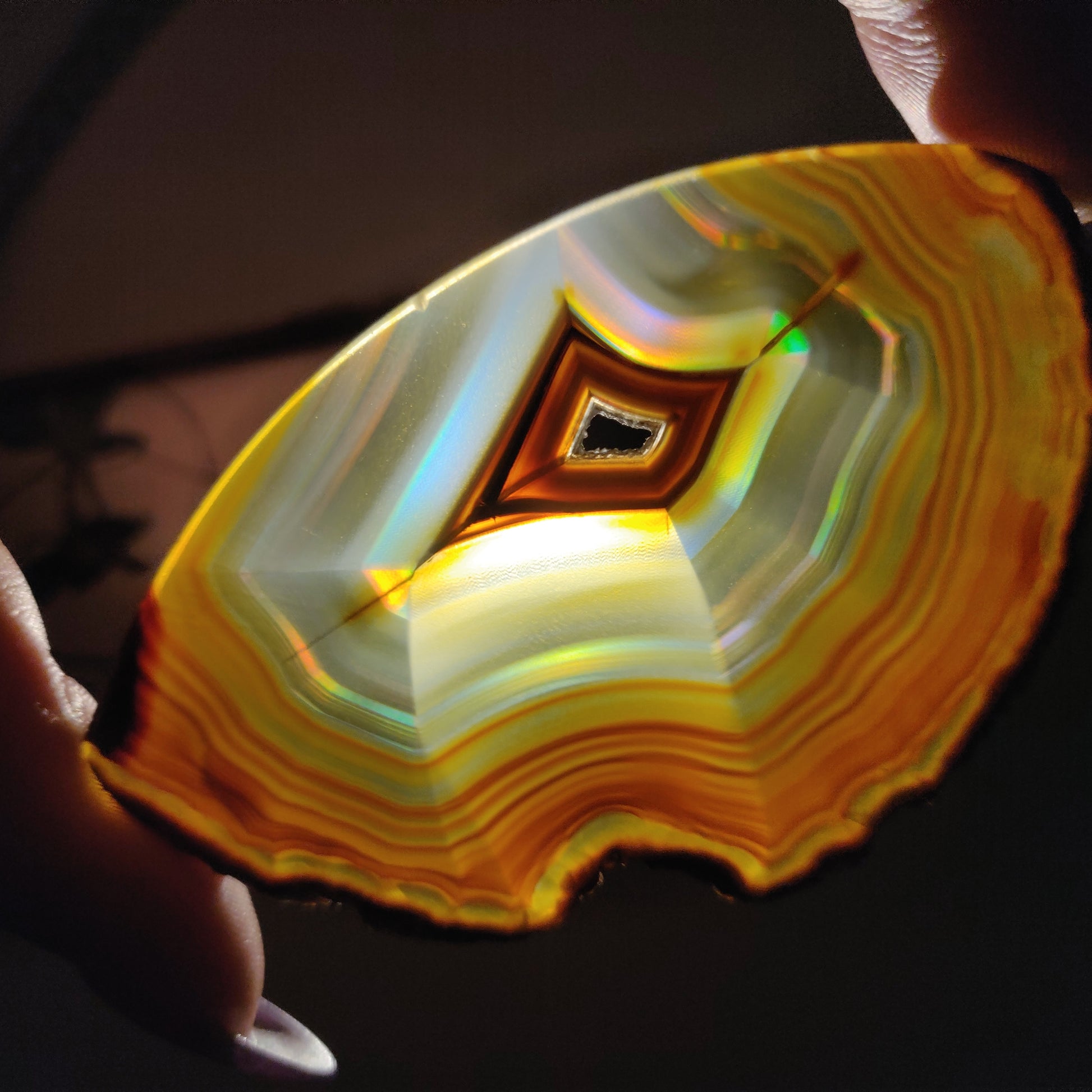 This incredibly rare Iris Agate slice is from Indonesia. It looks like a regular slice of agate until it is viewed through transmitted light, and then an incredible spectrum of colors appears. There are said to be a very small percentage of iris agates in the world. Furthermore, they have to be cut and polished just right and sliced very thin for the rainbows to be visible, making them even harder to come by! You can best enjoy your iris agate backlit with a bright flashlight in a dim environment. Cellphone flashlights work surprisingly well! The rainbows can also be viewed in bright sunshine, but you have to be very careful not to look directly into the sun to avoid eye damage, so the flashlight method is what we suggest.