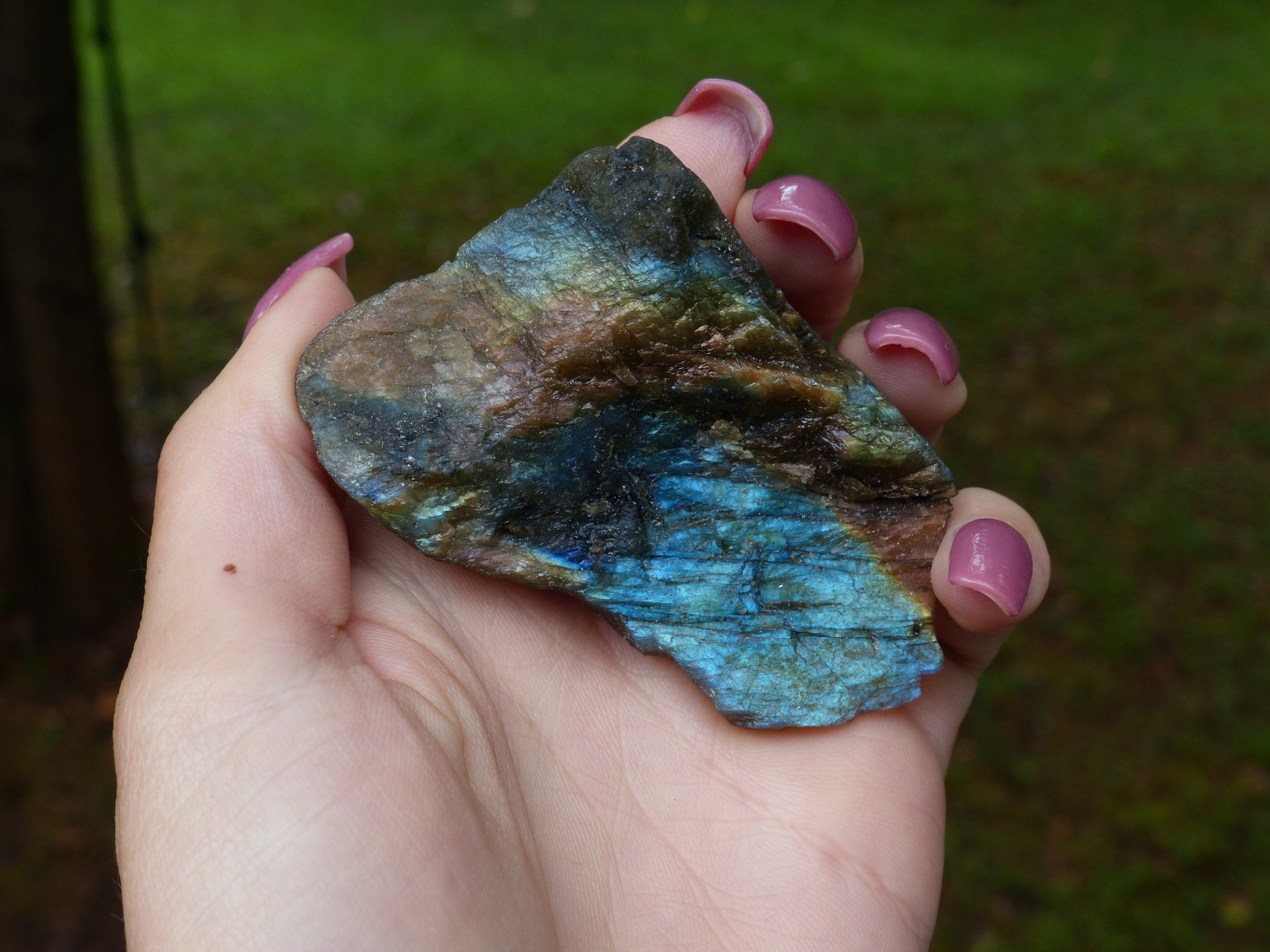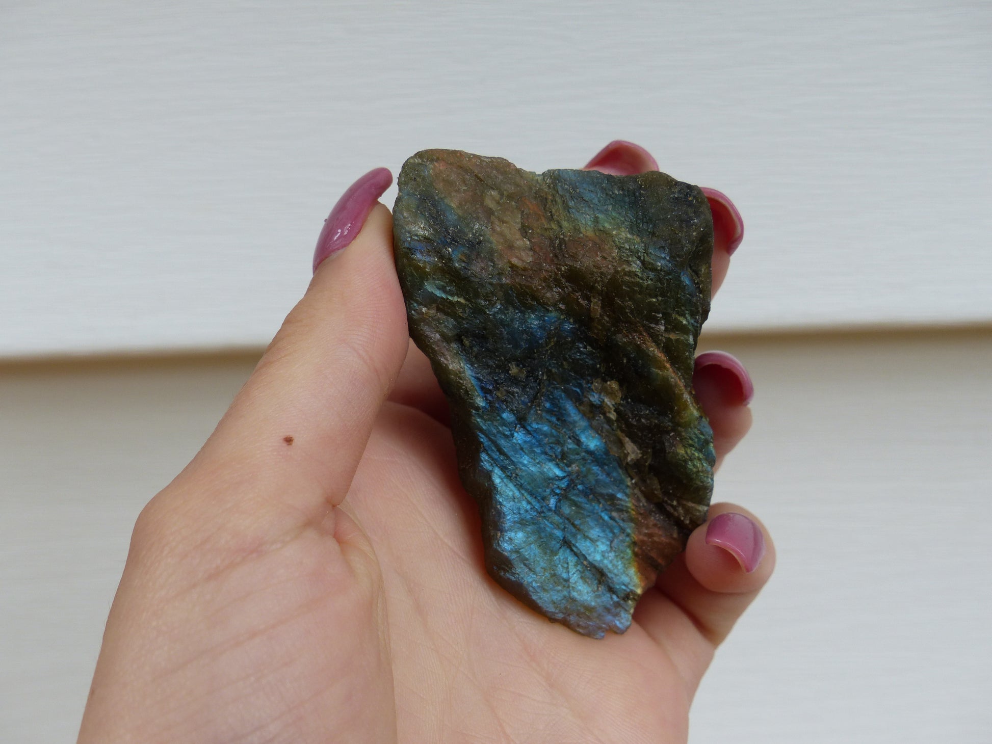 This lovely piece is polished on one side & rough on the others. The rough side also displays a beautiful flash. 💜Labradorite is known as a stone that aids in times of transition and change. Inuit folklore says that labradorite fell from the "frozen fire" of the aurora borealis (the northern lights) causing an ordinary stone to become extraordinary. It is said to weaken the negative side of our personality and strengthen the positive. Each and every piece is truly magical and I feel so honored to get to share all of this beauty with you! ♡ To read more about this amazing stone visit this site: http://www.crystalvaults.com/crystal-encyclopedia/labradorite