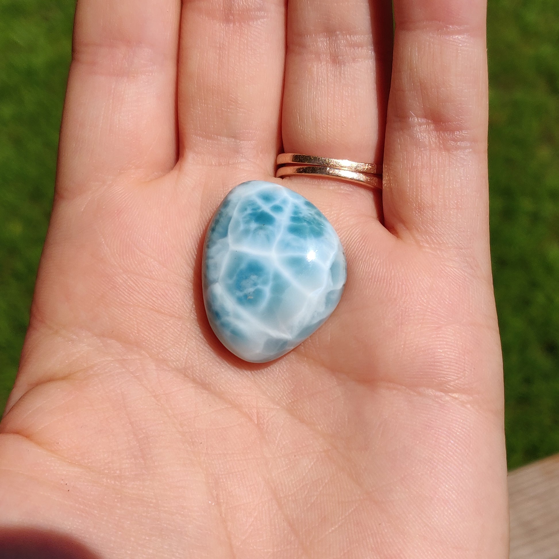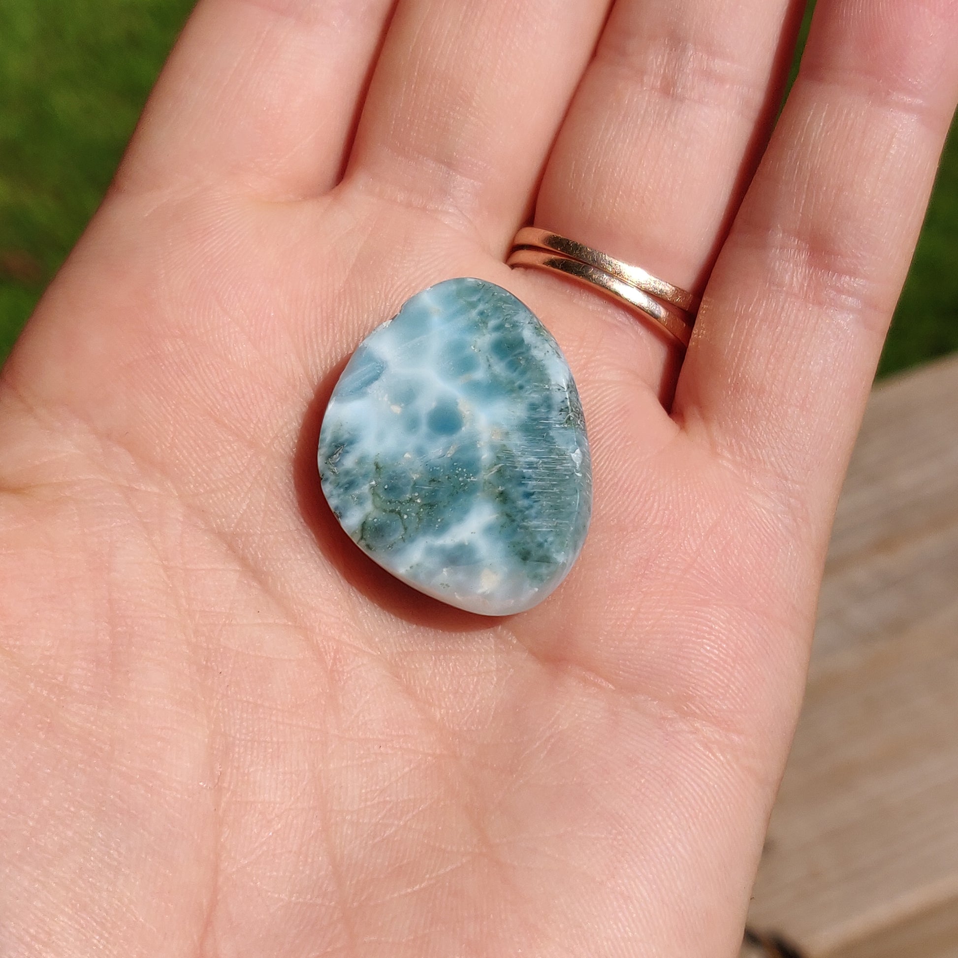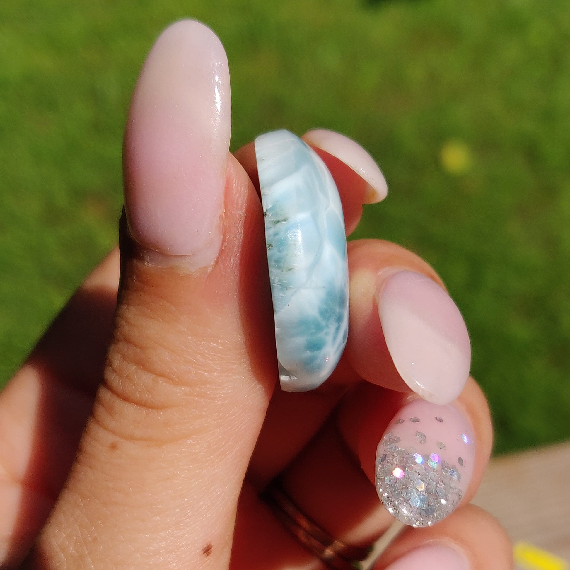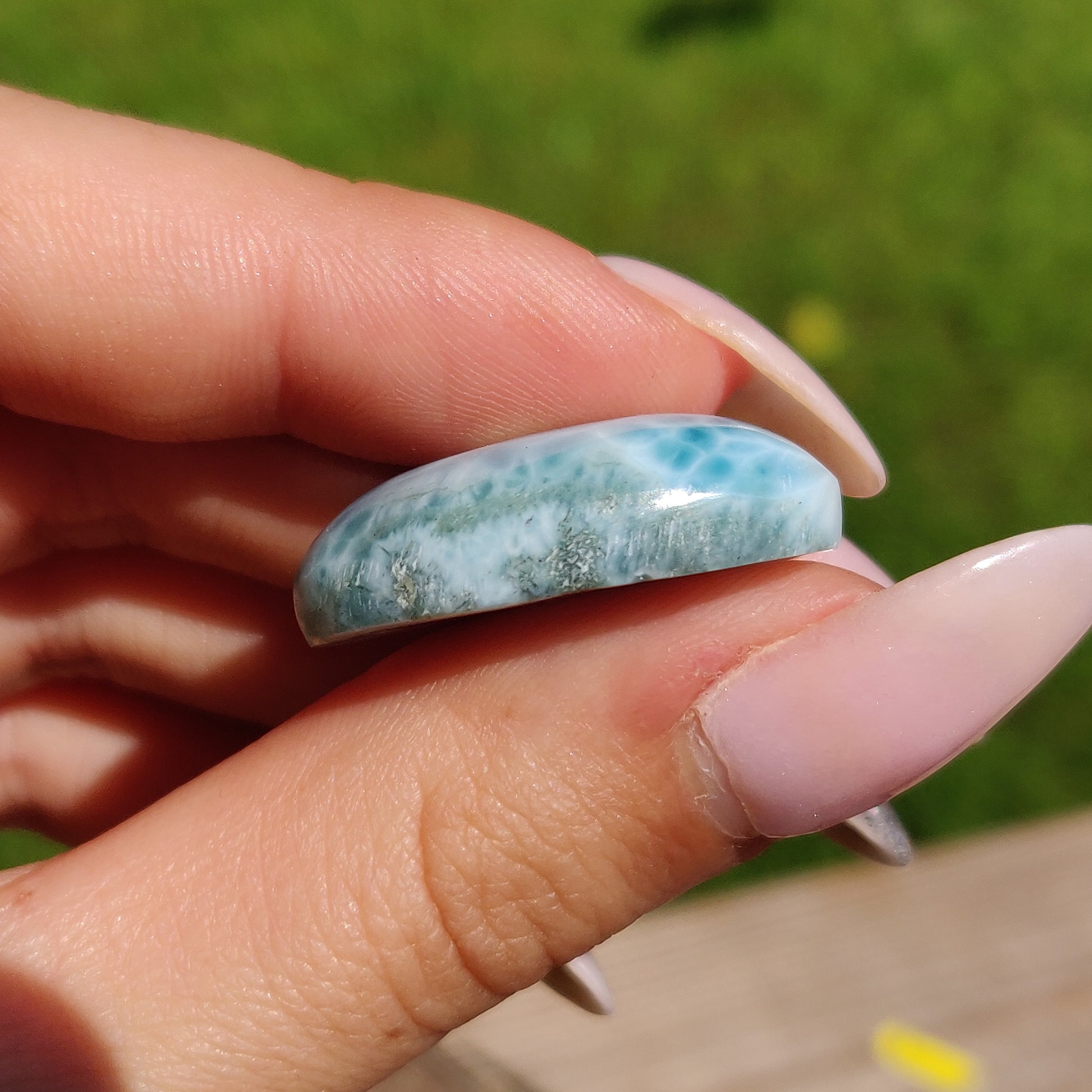 This gorgeous Larimar cabochon is ready to made into a beautiful piece of jewelry! Larimar is a truly rare gemstone of volcanic origins. It is only found one place in the world, the Dominican Republic. Larimar was discovered in the 1970's by a local resident that stumbled upon a cave with Larimar lining the walls. He named the newly found gem after his daughter Larissa and the sea ("mar" in Spanish). Larimar is also known as the Dolphin Stone, Blue Pectolite, Atlantis Stone, and Stefilia's Stone. It has been said that the blue variety of the stone has been completely mined out (as it was only found on one square kilometer of the island). Instead, they are finding the green variety of Larimar that is too soft to set in jewelry.