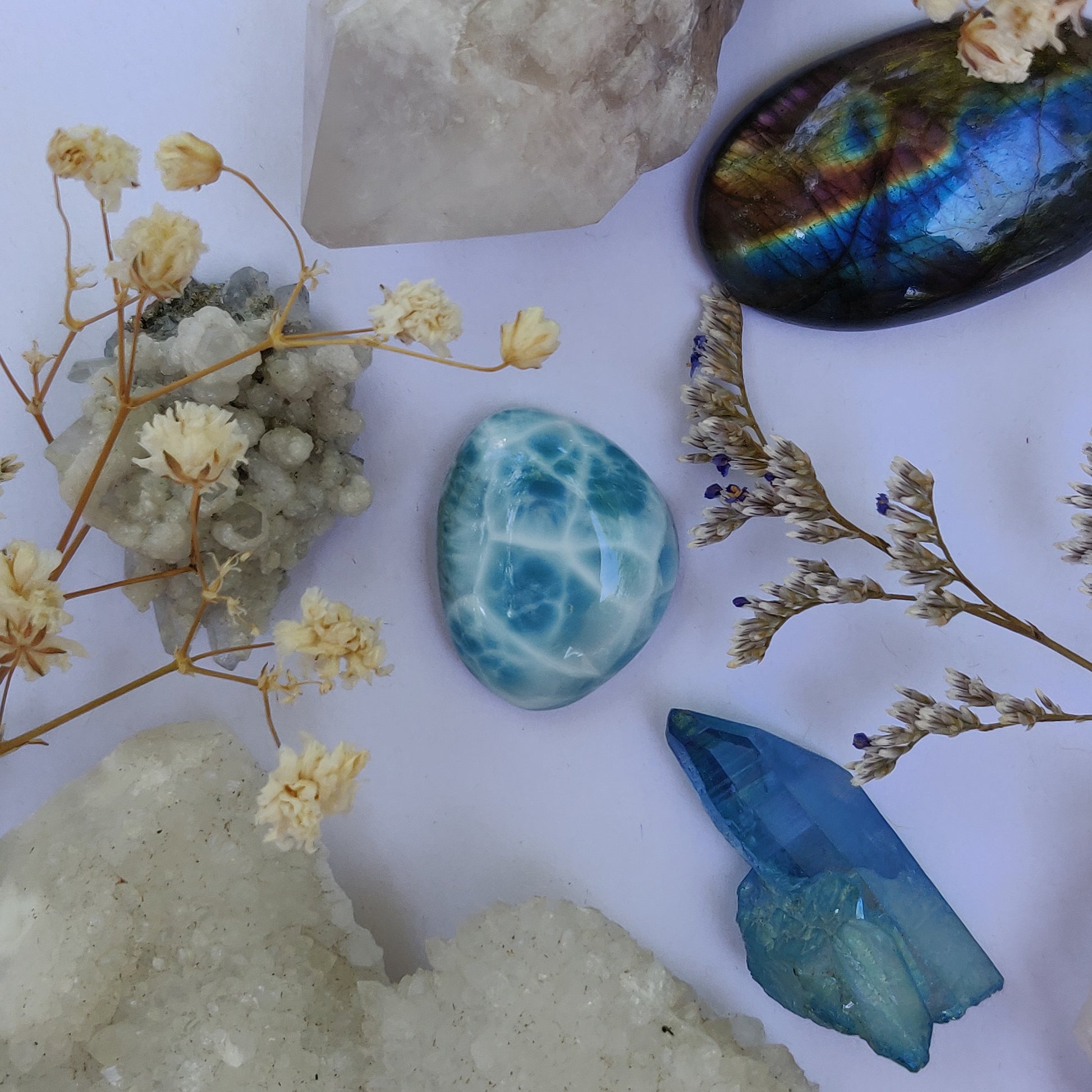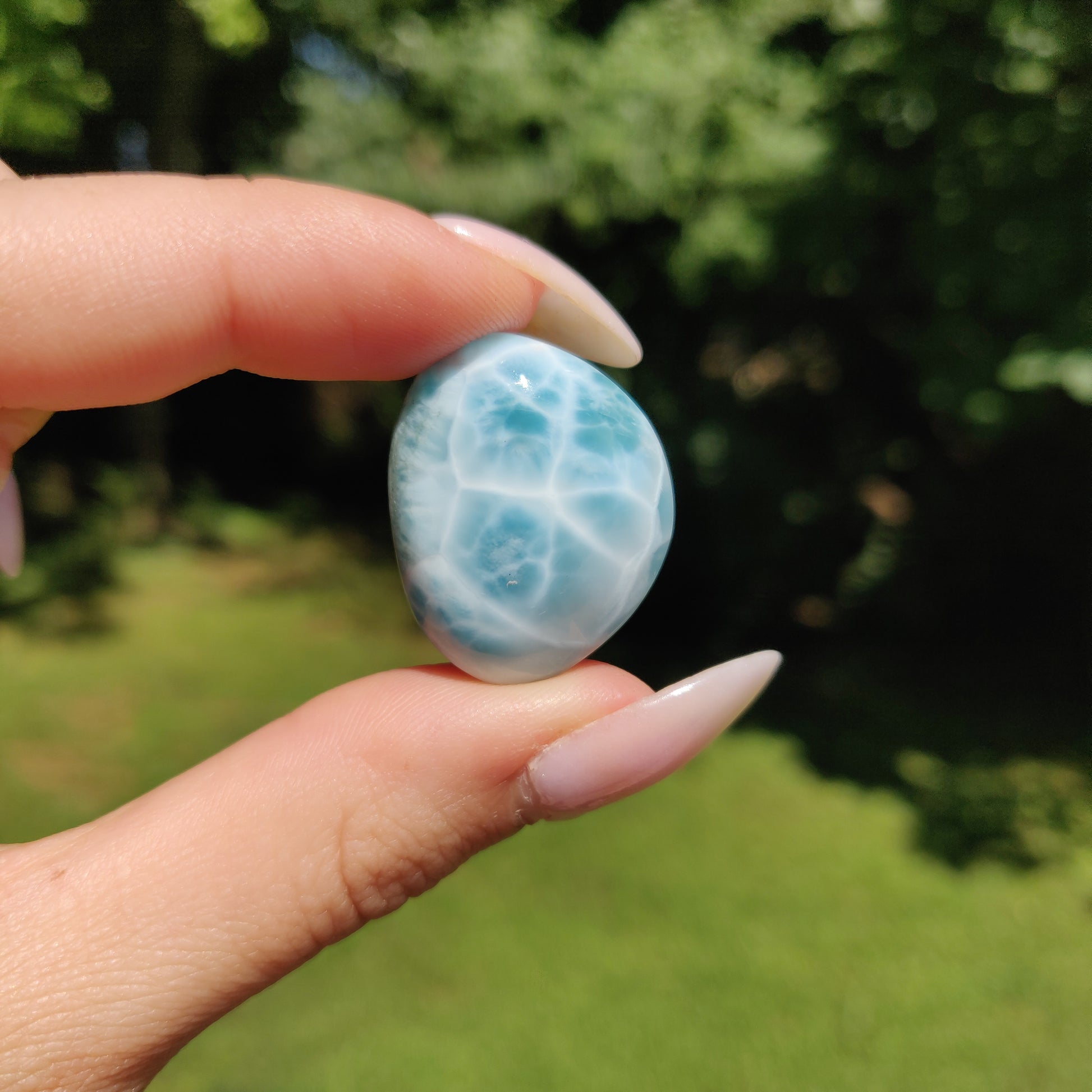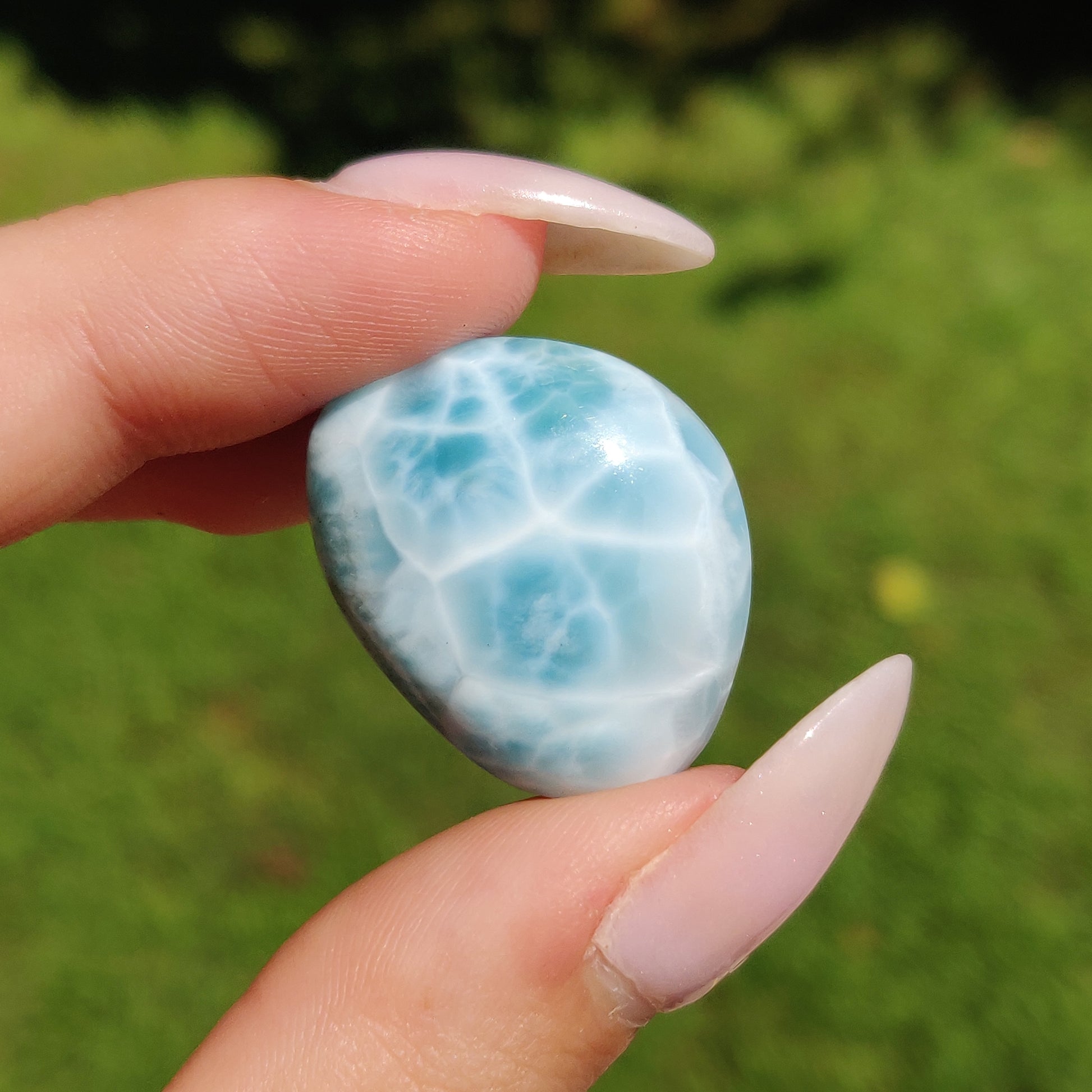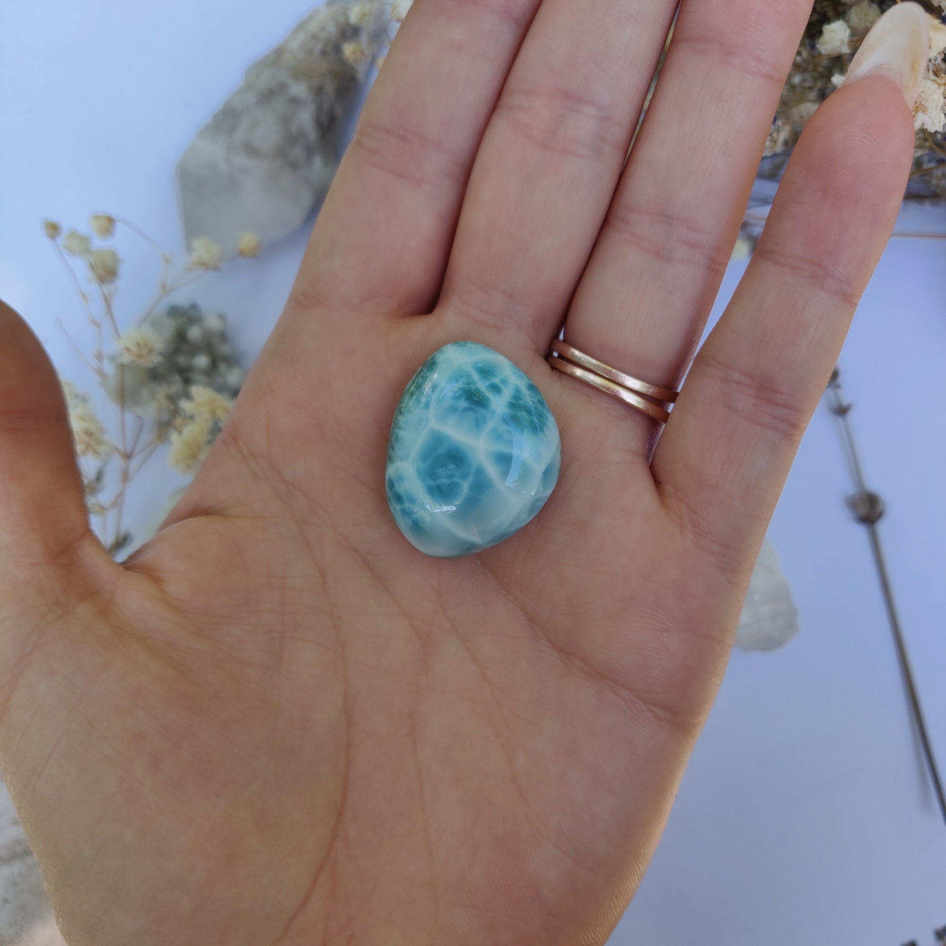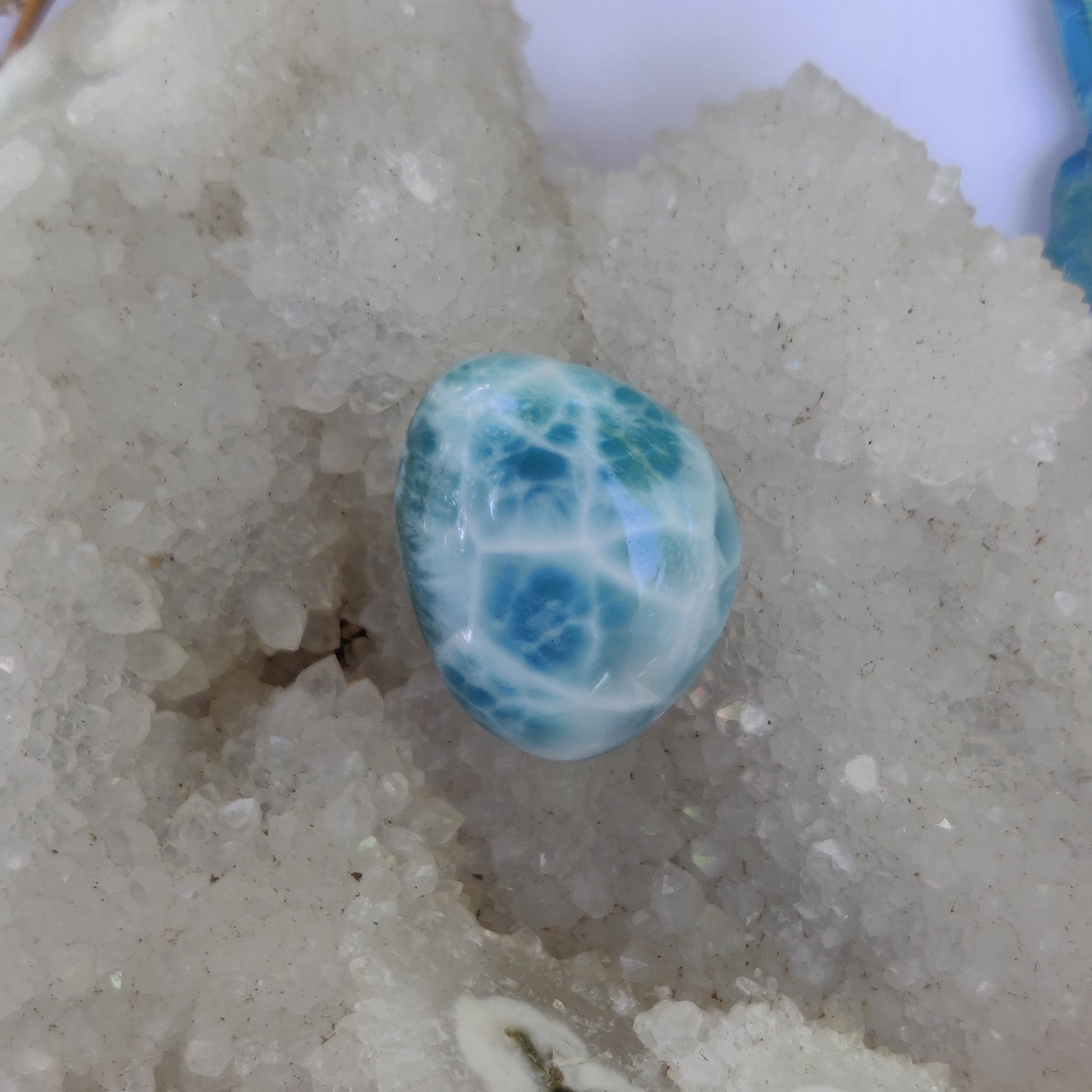 This gorgeous Larimar cabochon is ready to made into a beautiful piece of jewelry! Larimar is a truly rare gemstone of volcanic origins. It is only found one place in the world, the Dominican Republic. Larimar was discovered in the 1970's by a local resident that stumbled upon a cave with Larimar lining the walls. He named the newly found gem after his daughter Larissa and the sea ("mar" in Spanish). Larimar is also known as the Dolphin Stone, Blue Pectolite, Atlantis Stone, and Stefilia's Stone. It has been said that the blue variety of the stone has been completely mined out (as it was only found on one square kilometer of the island). Instead, they are finding the green variety of Larimar that is too soft to set in jewelry.