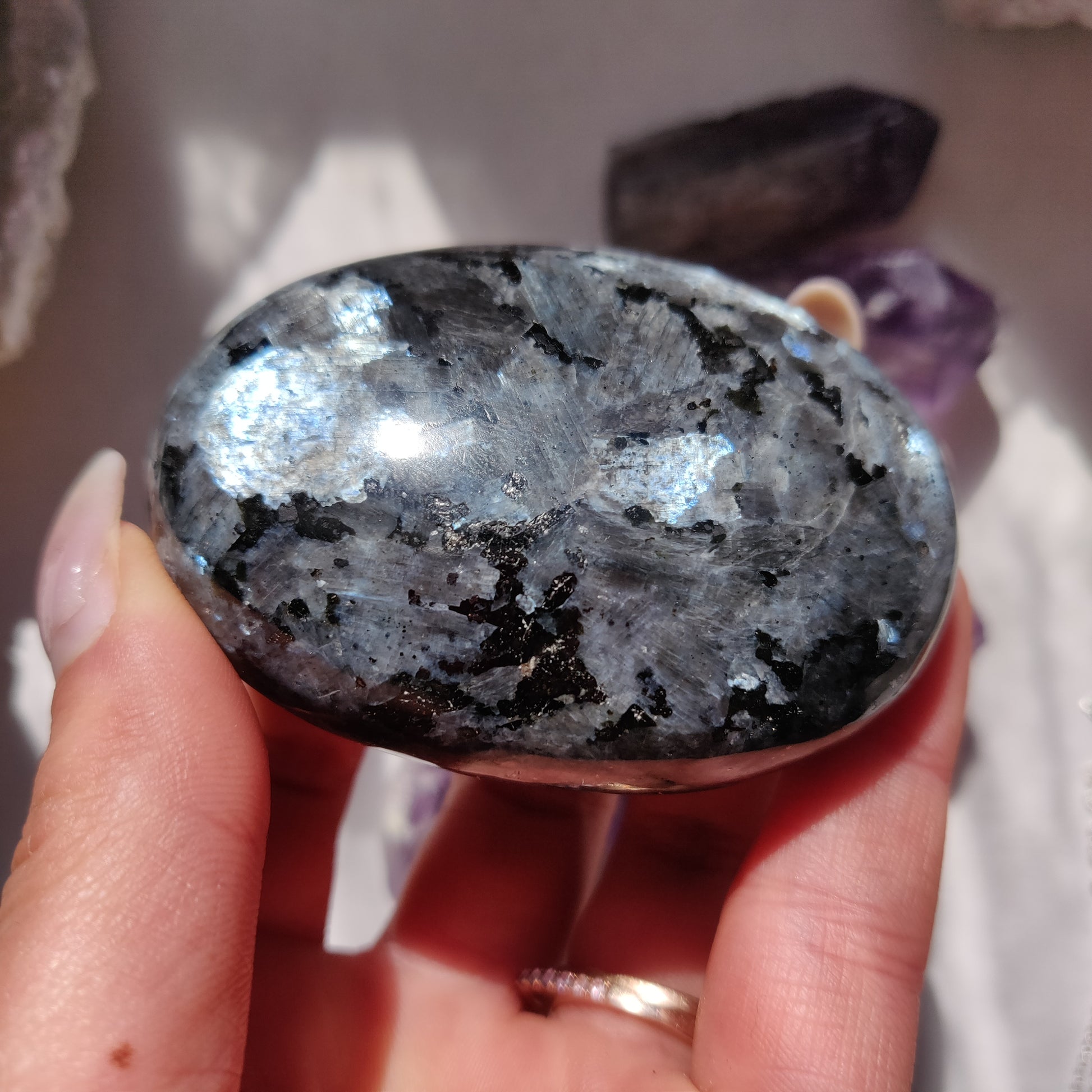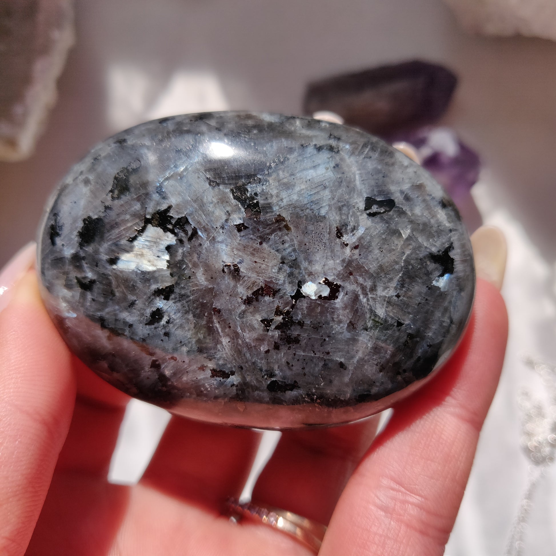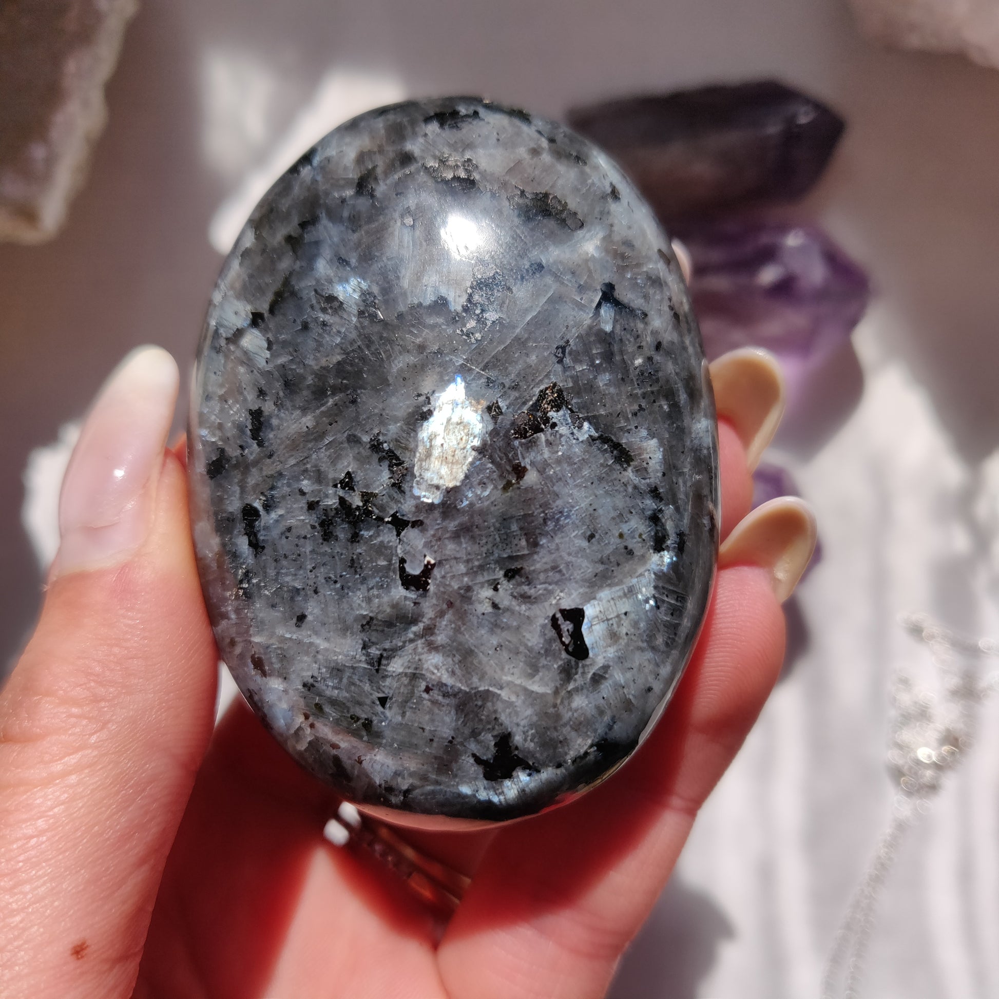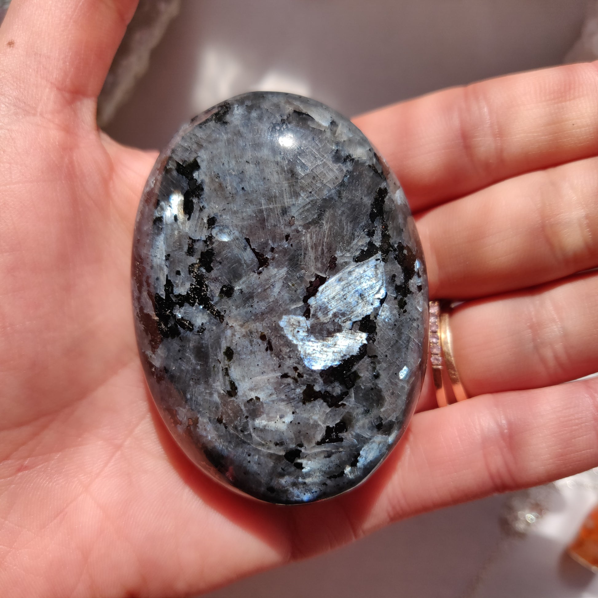 Larvikite is a beautiful gem in the Feldspar family. It is a wonderful stone to help you reconnect with nature. Larvikite encourages us not to dwell on problems, but to