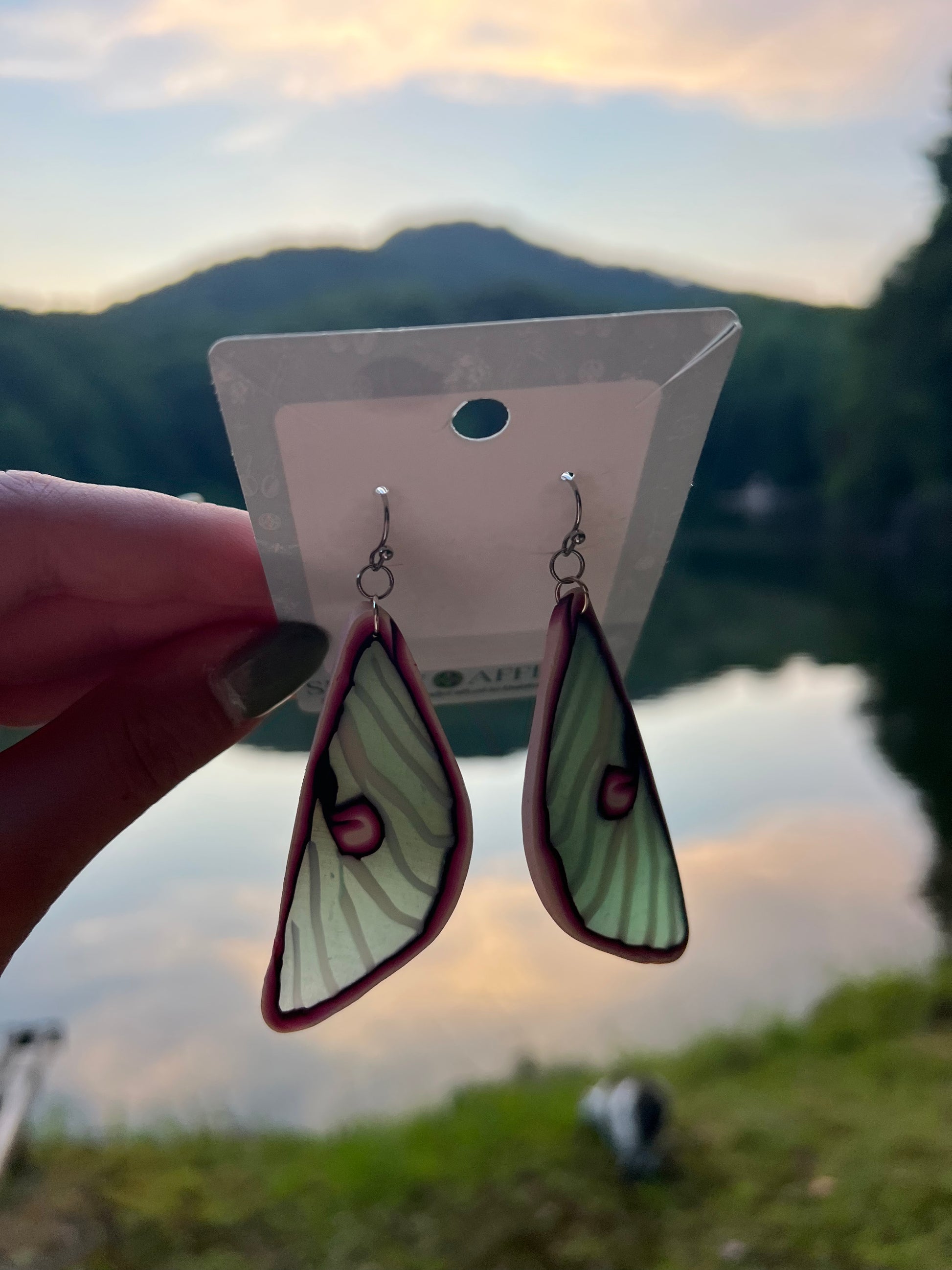 Ethereal and full of magic—these Luna Moth wing earrings are a tribute to one of nature’s most enchanting creatures. Each wing is sculpted entirely by hand from custom mixed polymer clay colors— I don't use any paint in my pieces. To create the luminous green of the wings, I blend translucent clay with mica powders and alcohol inks, resulting in a sheer wing that catches the light beautifully.