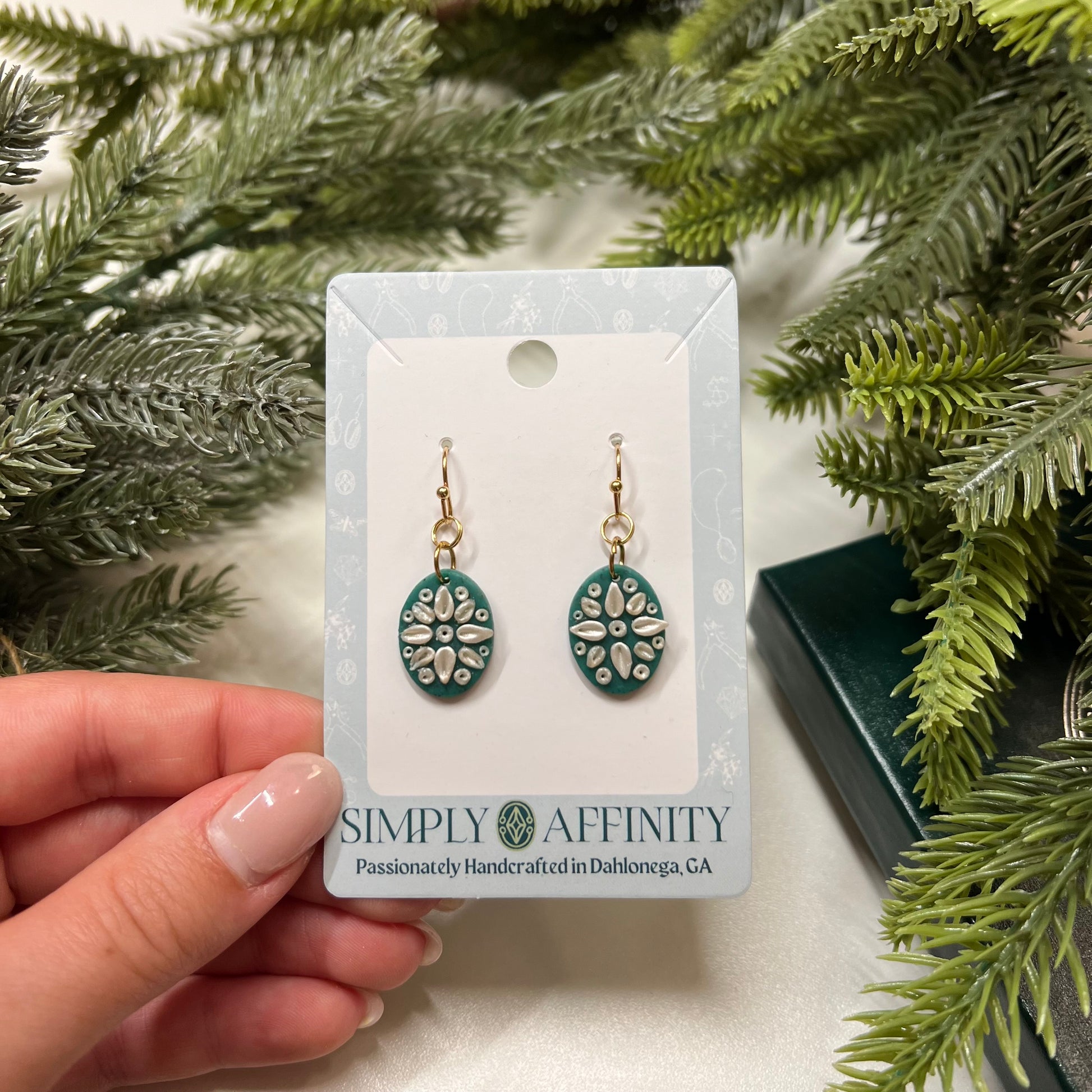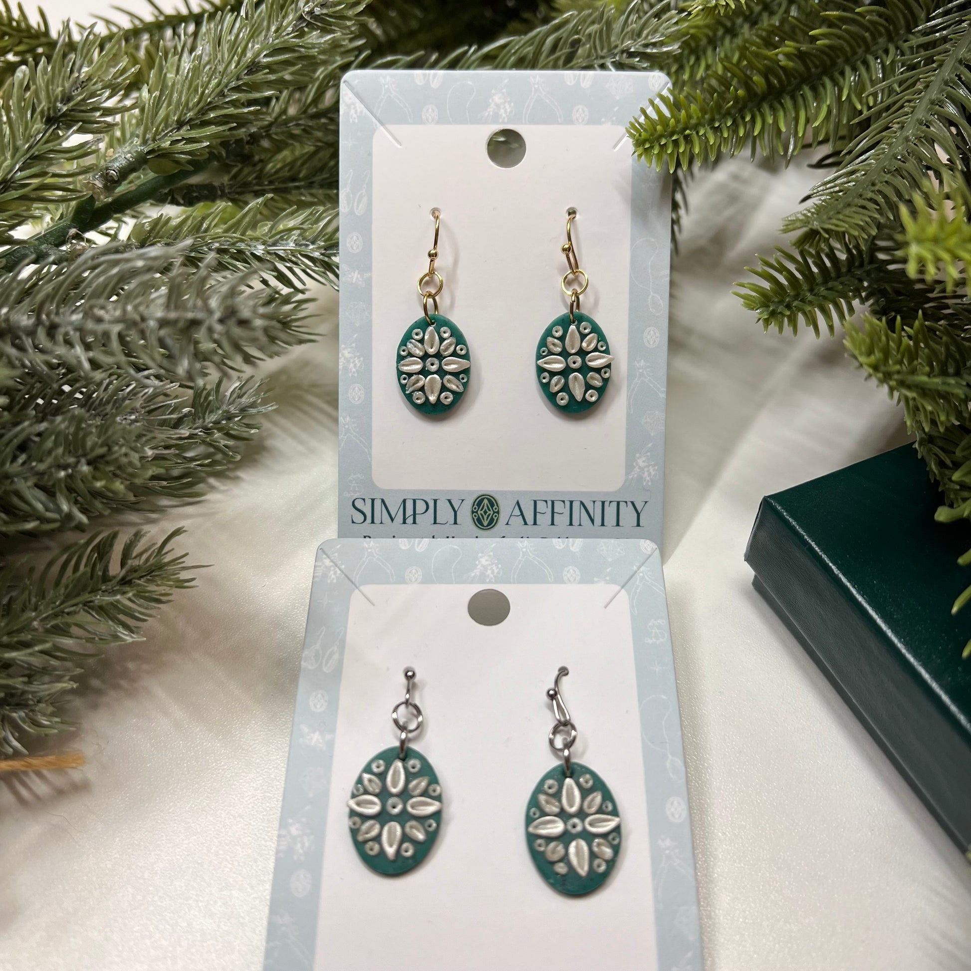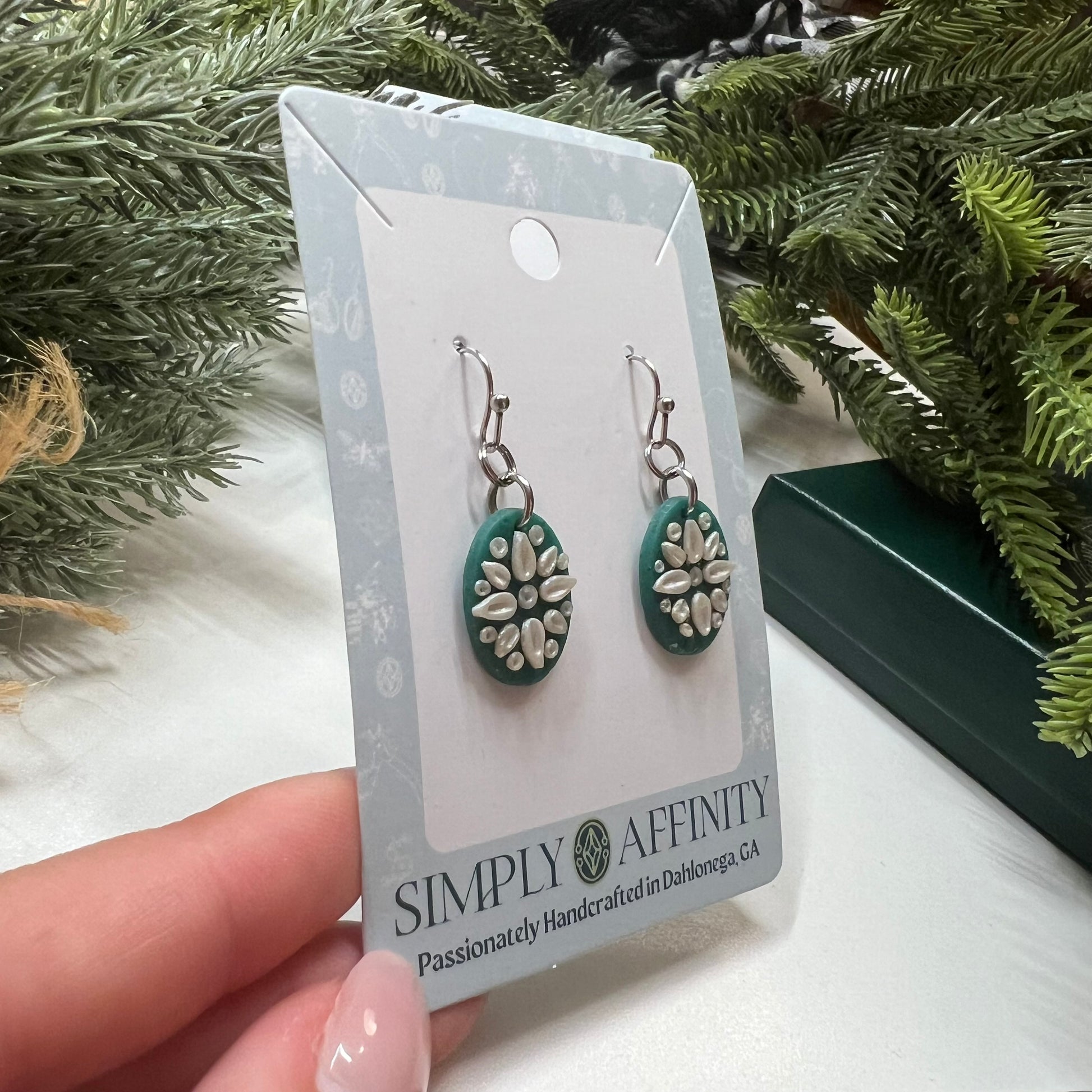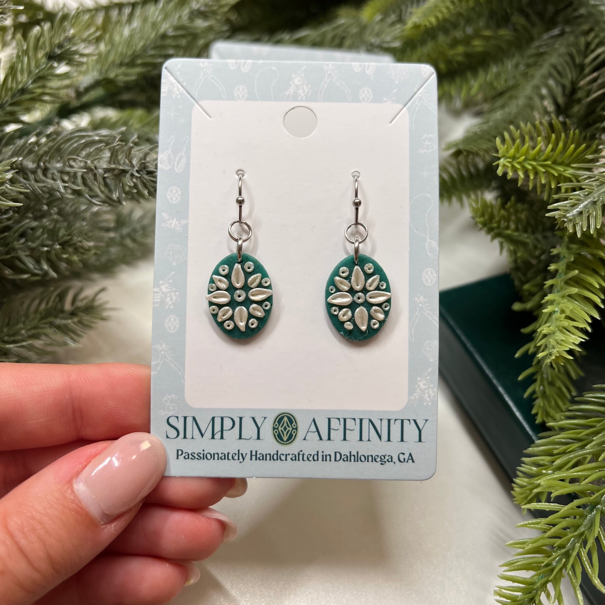 Step into a world of delicate elegance with these mandala inspired earrings. I sculpt each pair meticulously out of polymer clay. These earrings are now available in this delightful green & pearlescent clay combination and I have also created this design in white and blue.