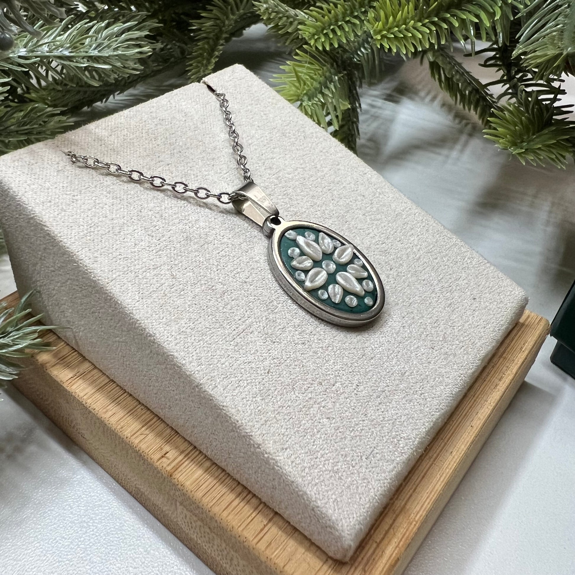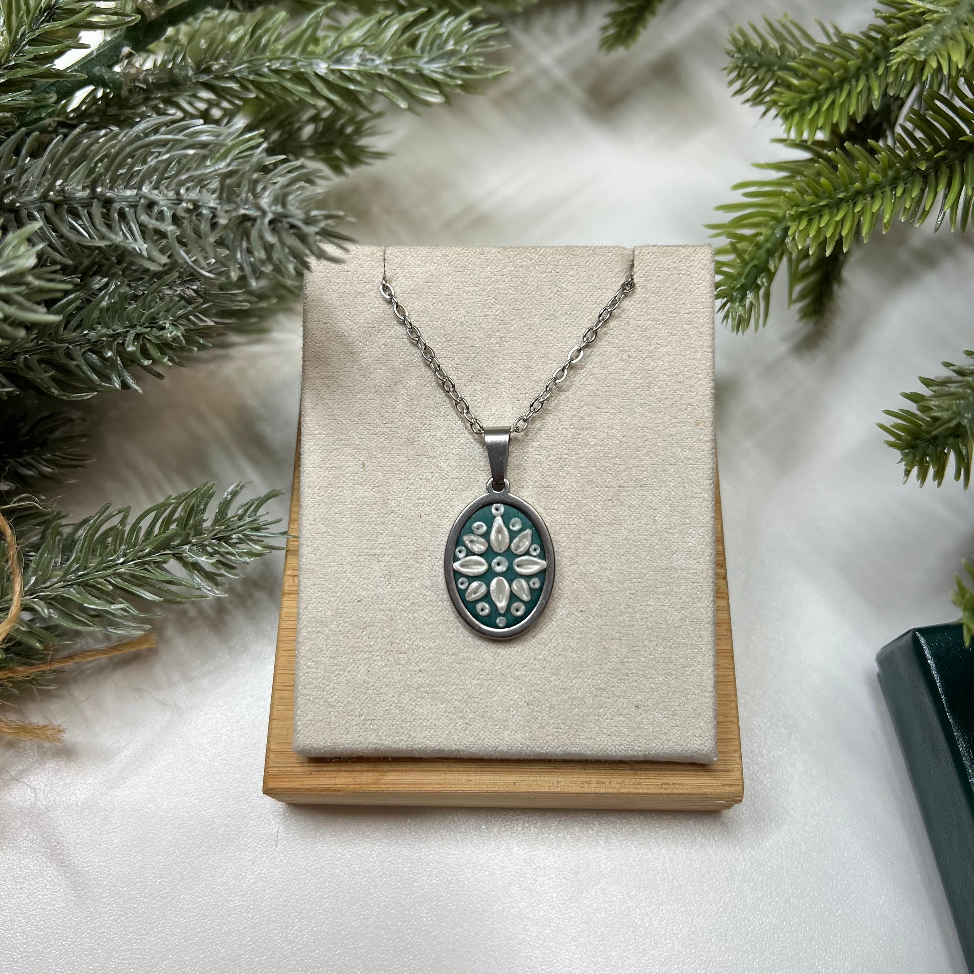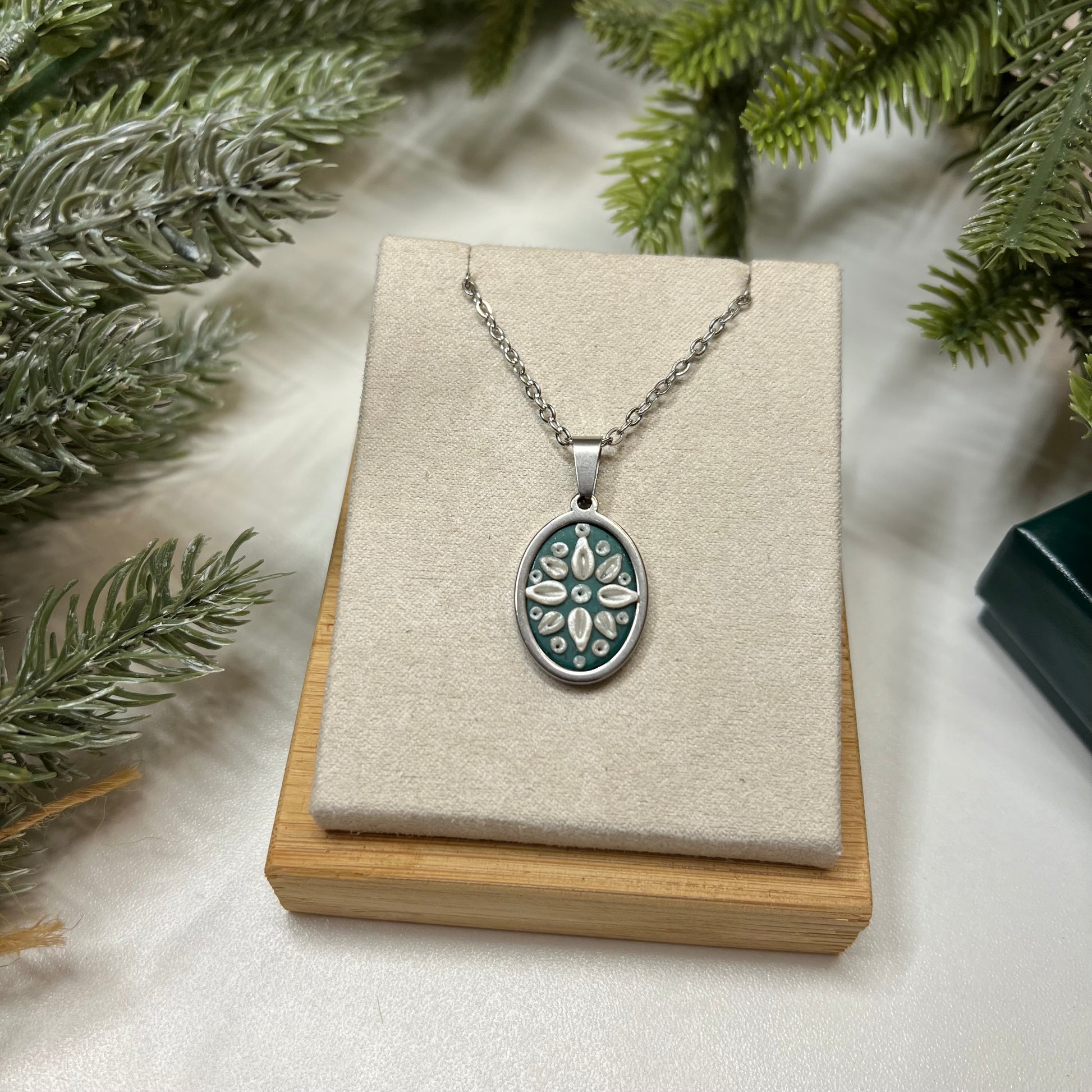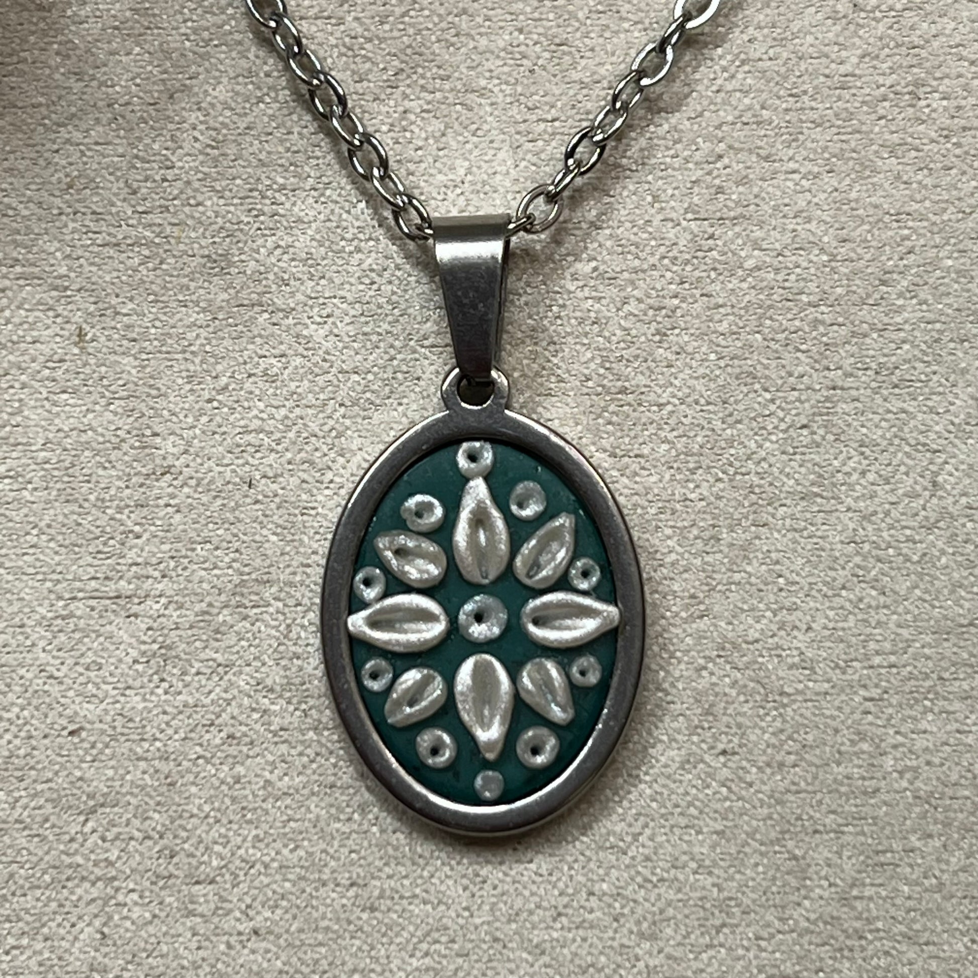 Step into a world of delicate elegance with this mandala inspired necklace. I sculpted this pendant meticulously out of polymer clay, and set it in a stainless steel bezel. This necklace is now available in this delightful green & pearlescent clay combination and I have also created this mandala design in white and blue.