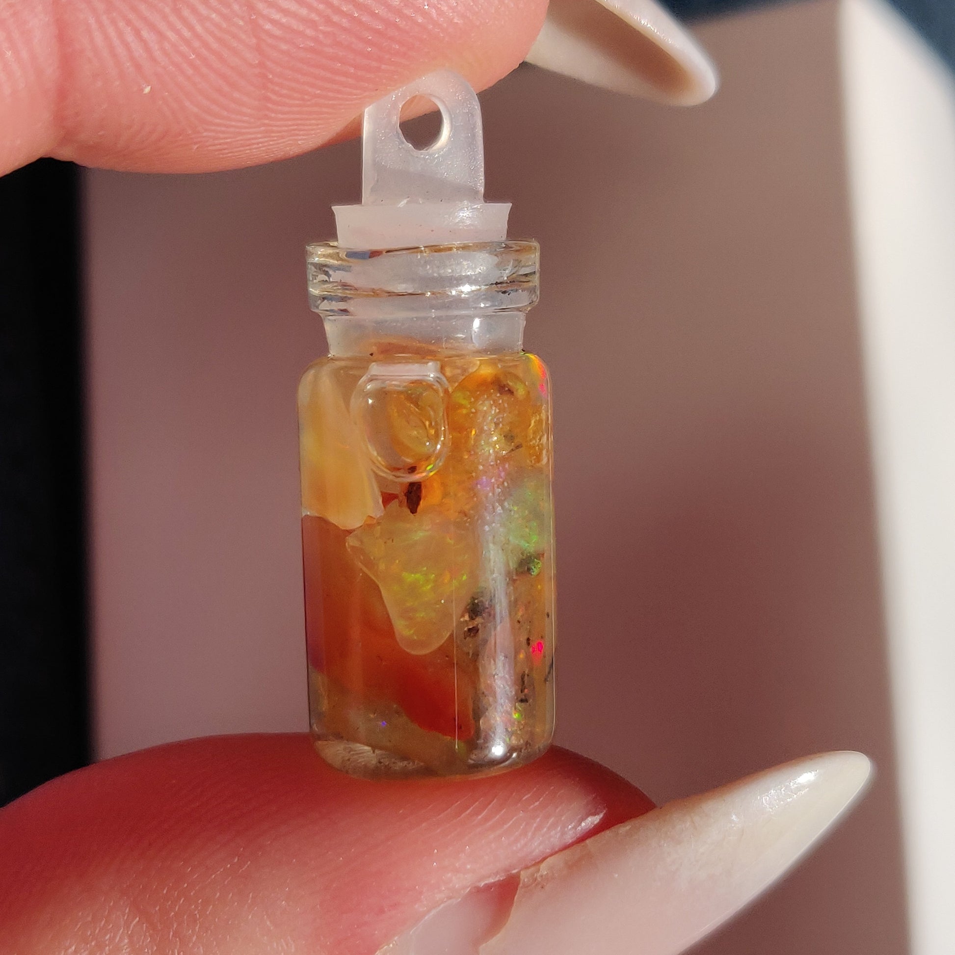 These glass vial pendants contain beautiful, natural, fire opal from Mexico.The opalescence in these bottles are gorgeous! These stunning Fire Opals make you feel like you are wearing little drops of sunshine and rainbows.