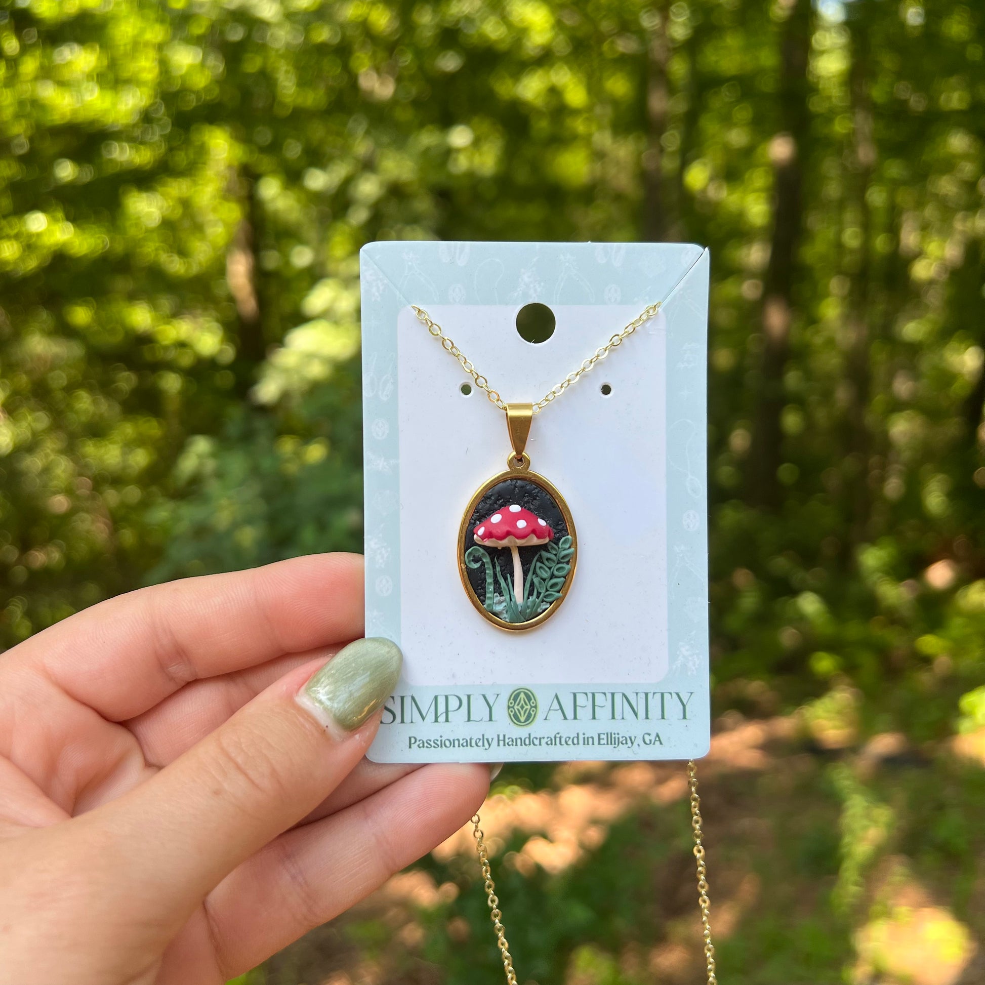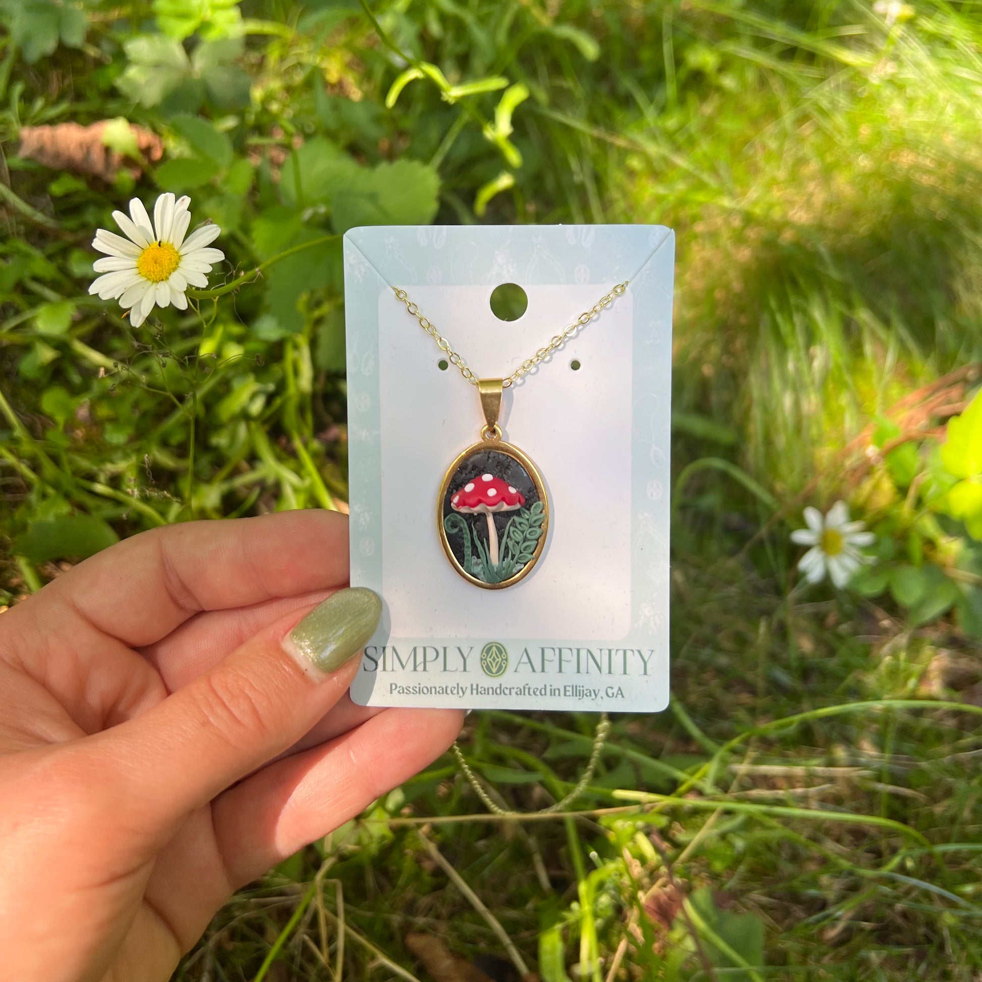 Add a touch of enchantment to your wardrobe with our intricately sculpted mushroom necklace. Hand-sculpted from lightweight polymer clay, enjoy the whimsical beauty of nature.