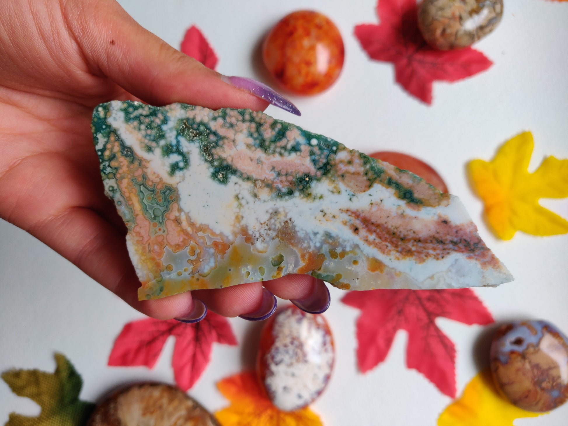 This amazing slab of ocean jasper is polished on both sides and rough on the edges. Beautiful Ocean Jasper is only found one place in the world, Madagascar. There are only a few deposits on the island and many deposits can only be reached by boat, making ocean jasper a wonderfully rare stone. Ocean Jasper is said to relieve stress & bring peace & tranquility. The beautiful orbicular patterns that you see in ocean jasper begin as three-dimensional orbs. When cut, you see the cross-section of the stone, so the orbs leave round and flower-like patterns in the stone. Ocean jasper can also form with druzy inclusions, like this beautiful piece.