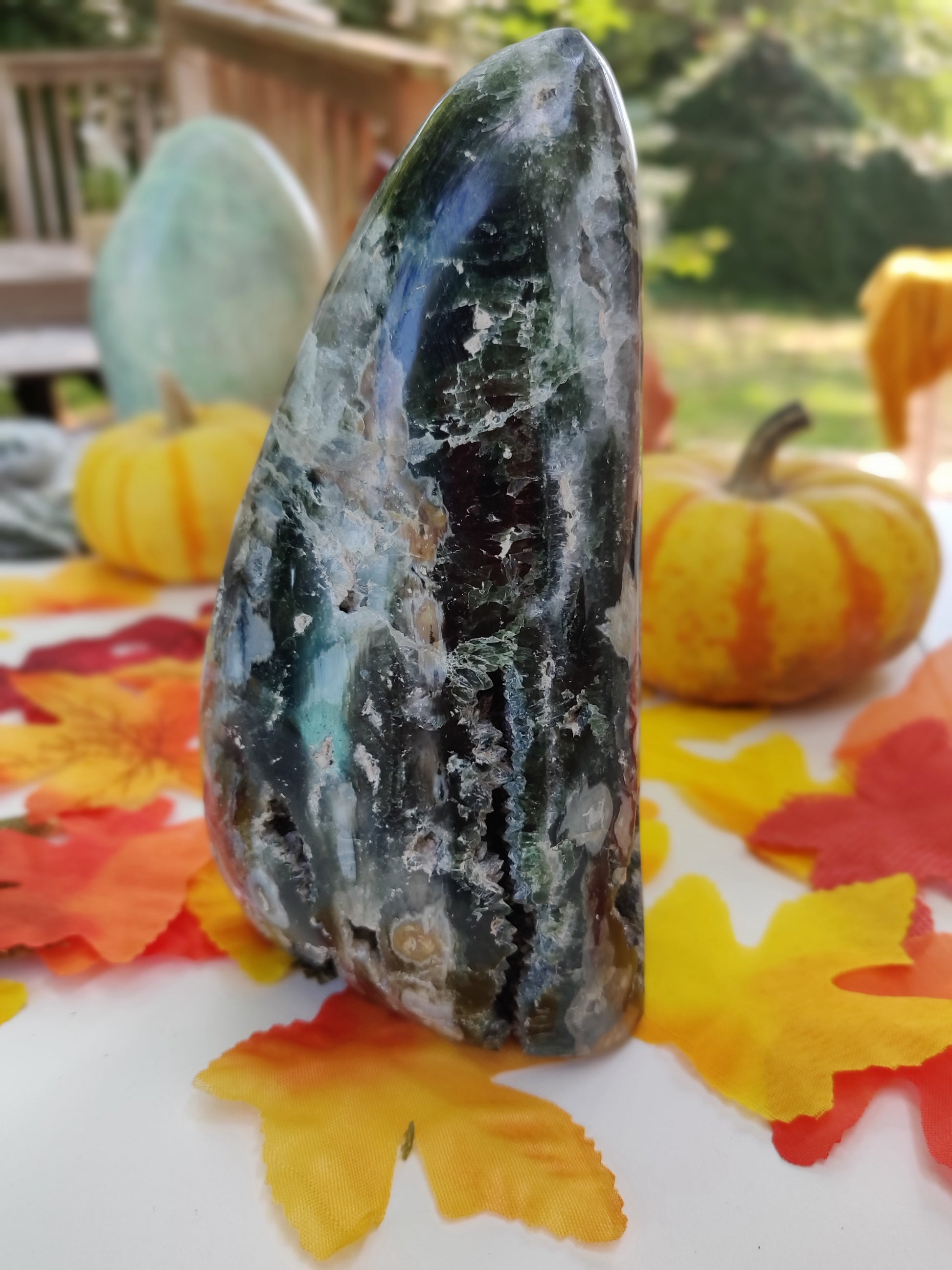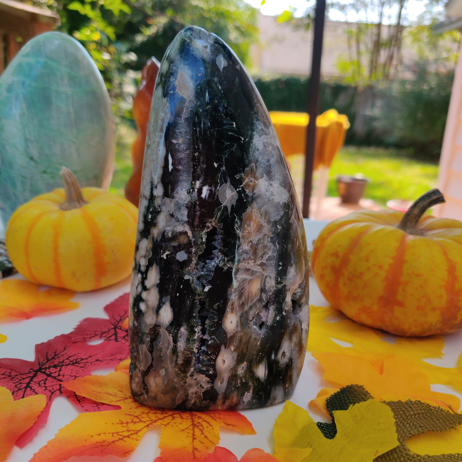 Beautiful Ocean Jasper is only found one place in the world, Madagascar. There are only a few deposits on the island and many deposits can only be reached by boat, making ocean jasper a wonderfully rare stone. Ocean Jasper is said to relieve stress & bring peace & tranquility. The beautiful orbicular patterns that you see in ocean jasper begin as three-dimensional orbs. When cut, you see the cross-section of the stone, so the orbs leave round and flower-like patterns in the stone. Ocean jasper can also form with druzy inclusions, like this beautiful piece.