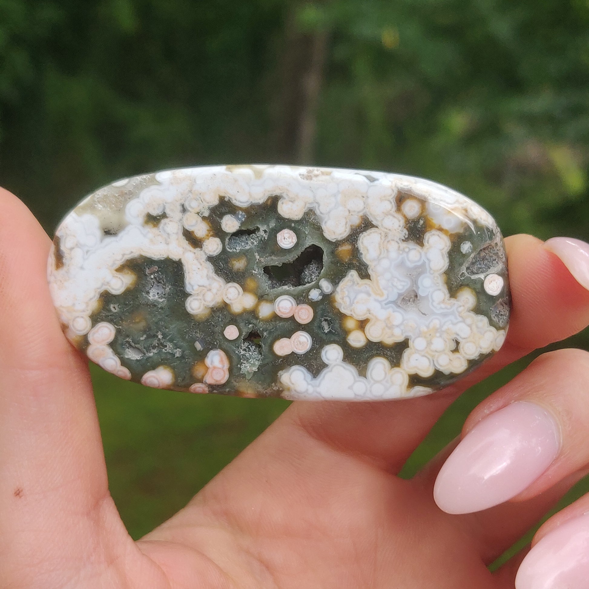 Beautiful Ocean Jasper is only found one place in the world, Madagascar. There are only a few deposits on the island and many deposits can only be reached by boat, making ocean jasper a wonderfully rare stone. Ocean Jasper is said to relieve stress & bring peace & tranquility. The beautiful orbicular patterns that you see in ocean jasper begin as three-dimensional orbs. When cut, you see the cross-section of the stone, so the orbs leave round and flower-like patterns in the stone. Ocean jasper can also form with druzy inclusions.