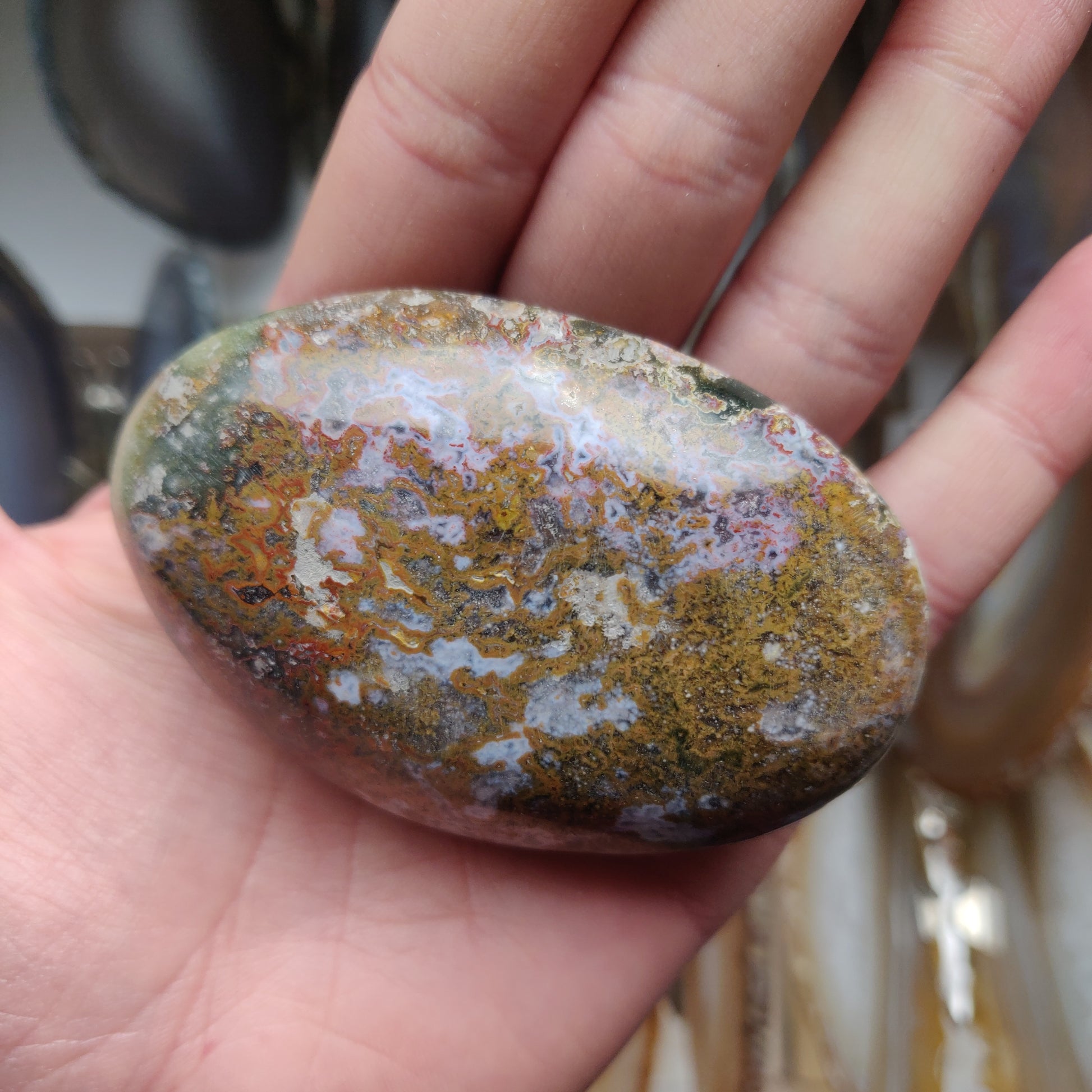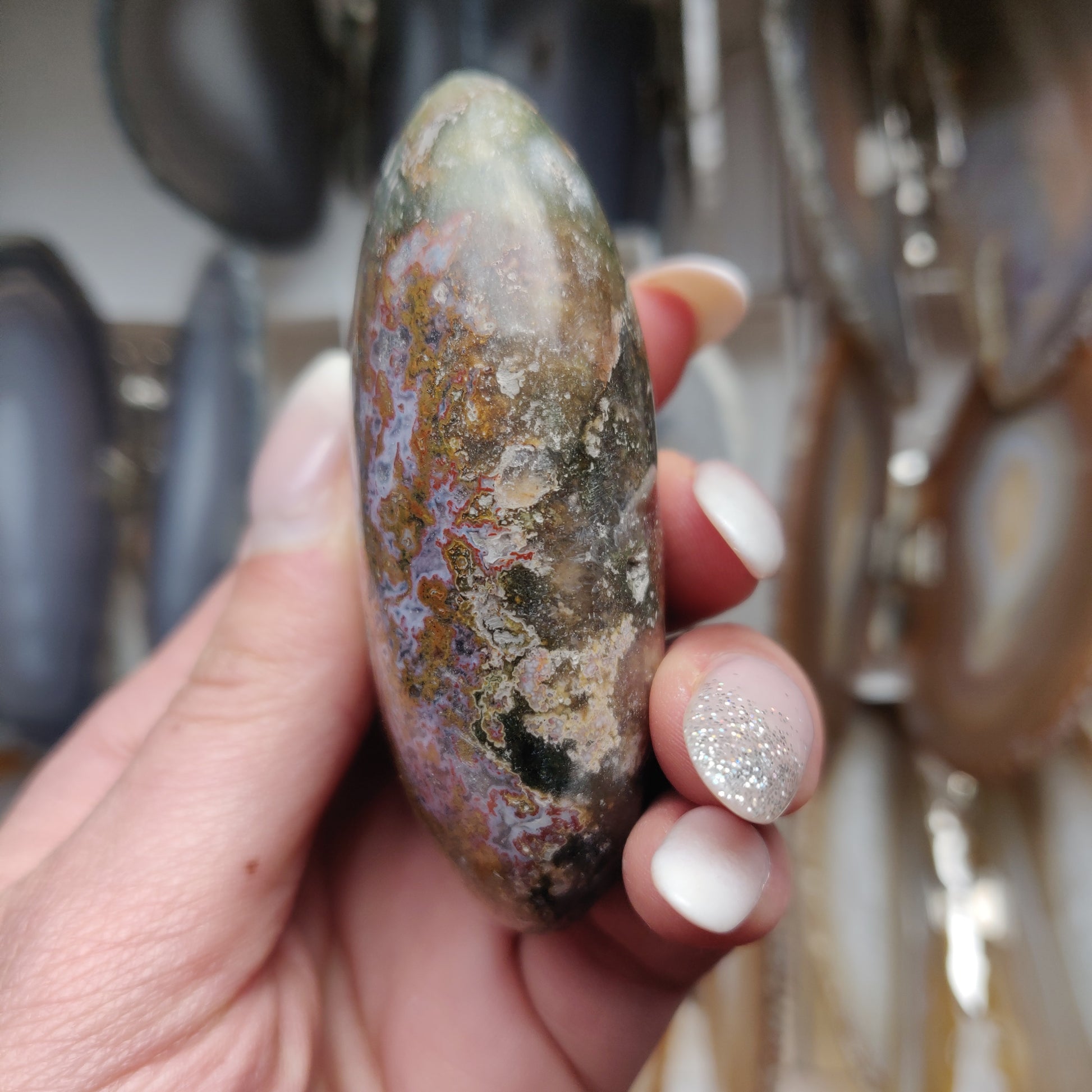 Beautiful Ocean Jasper is only found one place in the world, Madagascar. There are only a few deposits on the island and many deposits can only be reached by boat, making ocean jasper a wonderfully rare stone. Ocean Jasper is said to relieve stress & bring peace & tranquility. The beautiful orbicular patterns that you see in ocean jasper begin as three-dimensional orbs. When cut, you see the cross-section of the stone, so the orbs leave round and flower-like patterns in the stone. Ocean jasper can also form with druzy inclusions.