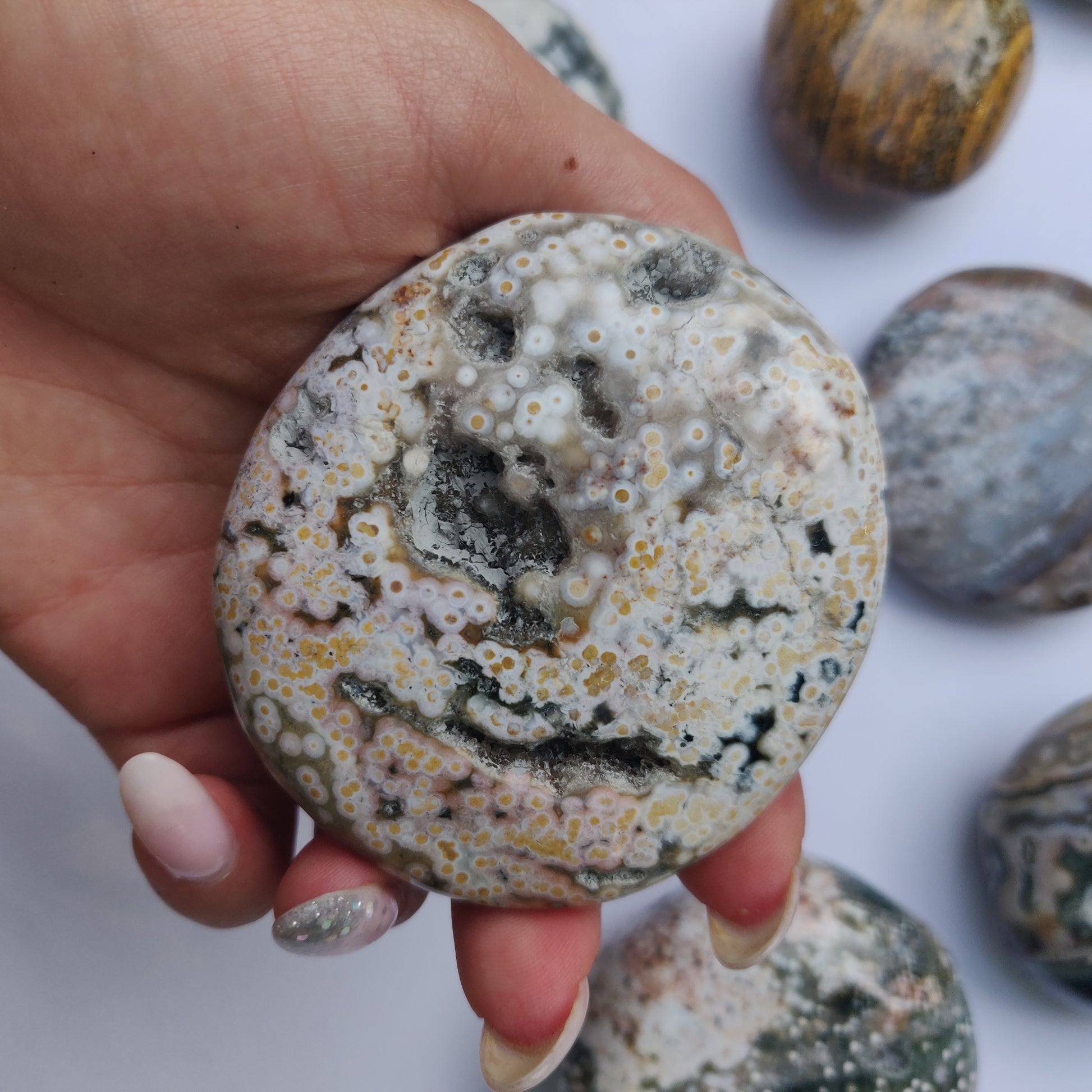 Beautiful Ocean Jasper is only found one place in the world, Madagascar. There are only a few deposits on the island and many deposits can only be reached by boat, making ocean jasper a wonderfully rare stone. Ocean Jasper is said to relieve stress & bring peace & tranquility. The beautiful orbicular patterns that you see in ocean jasper begin as three-dimensional orbs. When cut, you see the cross-section of the stone, so the orbs leave round and flower-like patterns in the stone. Ocean jasper can also form with druzy inclusions.