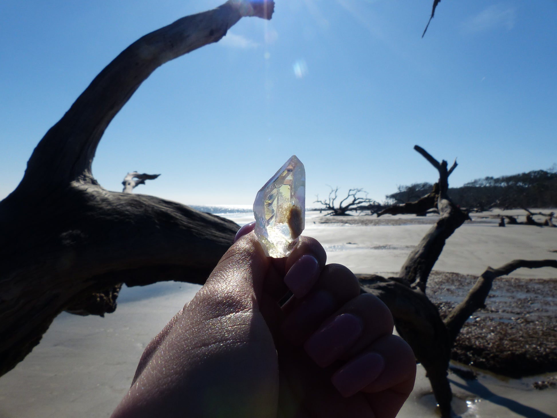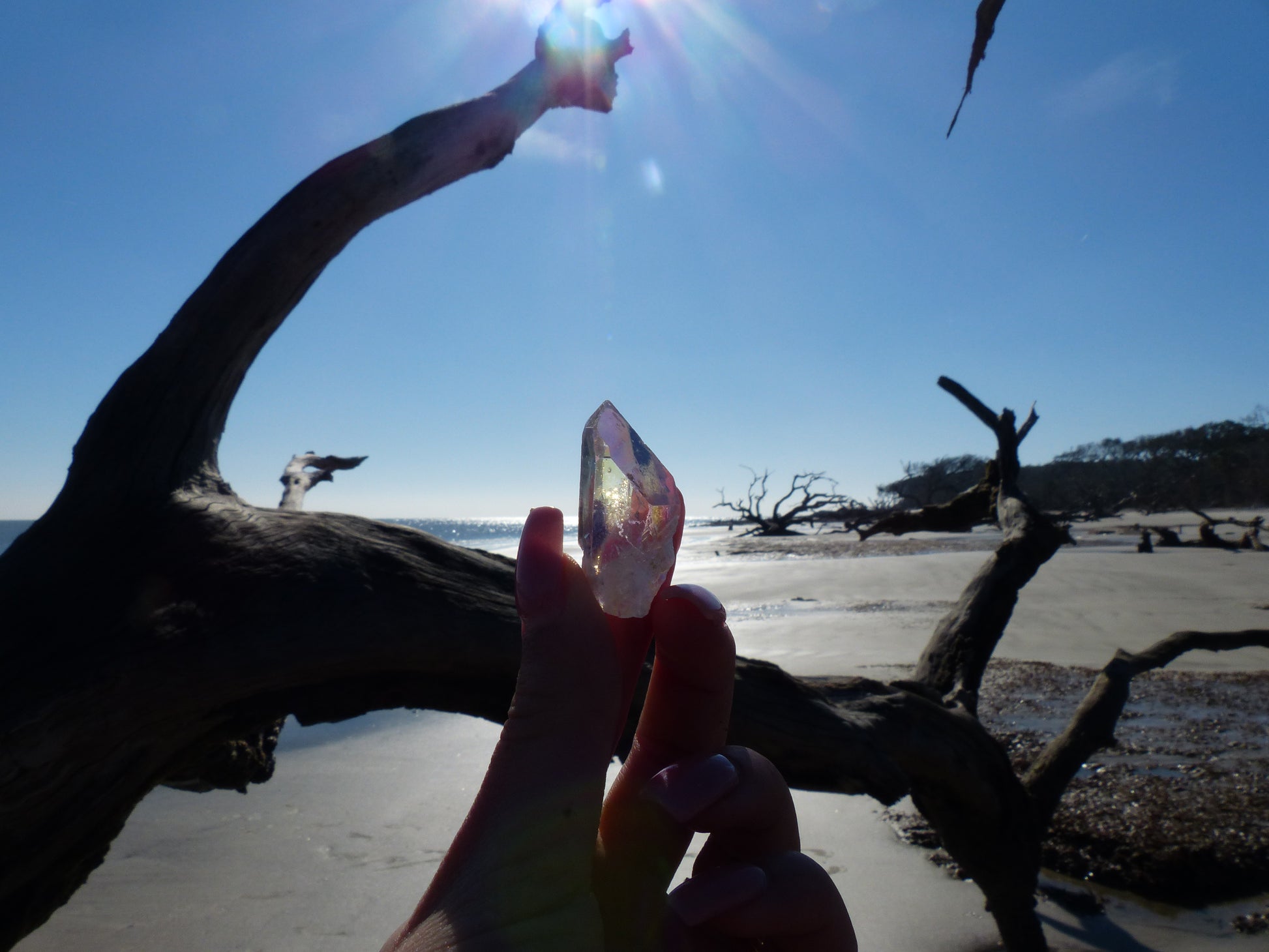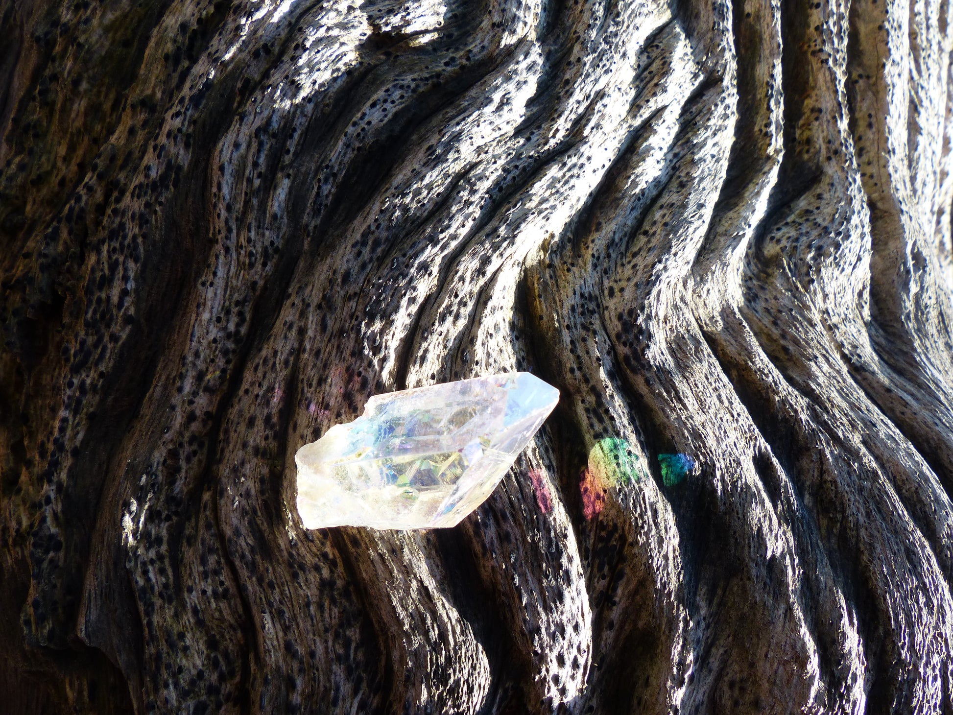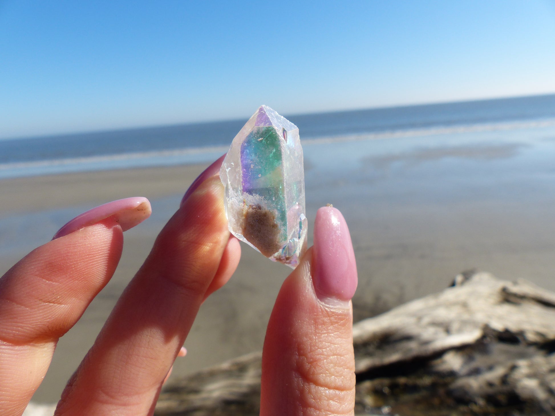 This beautiful clear quartz point with inclusions has been coated with precious metals to display the gorgeous aura-like effect on the outside of the stone. Though it goes through a man-made coating process, the coating is done with natural elements found in nature. Because of this, aura quartz is said to display the healing properties of quartz and that of its precious metal coating. Opal Aura is made by using Platinum as a coating. Depending on the angle that it is held, and the lighting, different colors can be seen, so it is quite hard to capture in photographs. Because this quartz point was left unpolished, the natural striations and "baby crystals" on the side, make this a very unique specimen. Opal Aura Quartz is said to be a crystal of joy, and like a rainbow, signifies hope and optimism. It is also a stone of romance and love.