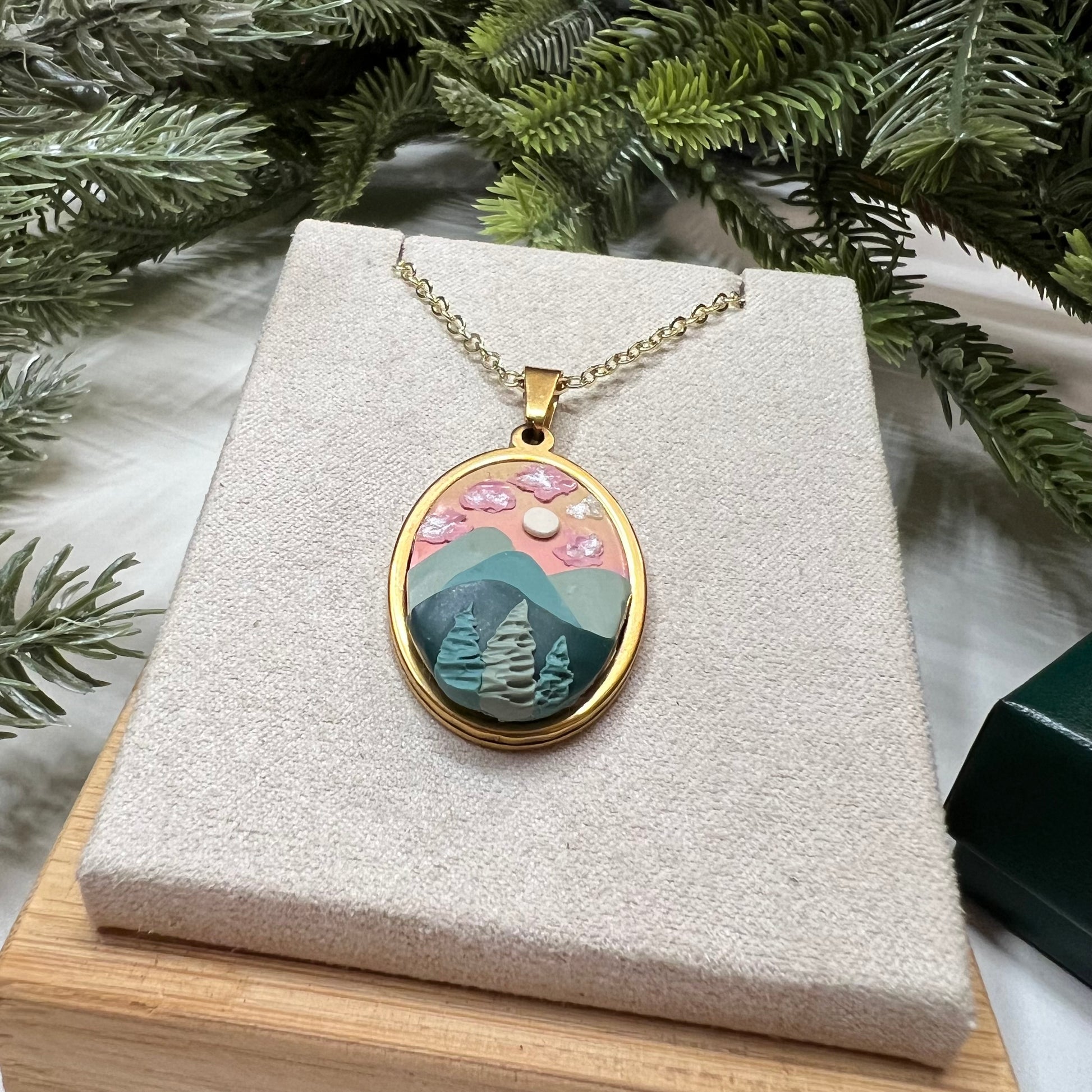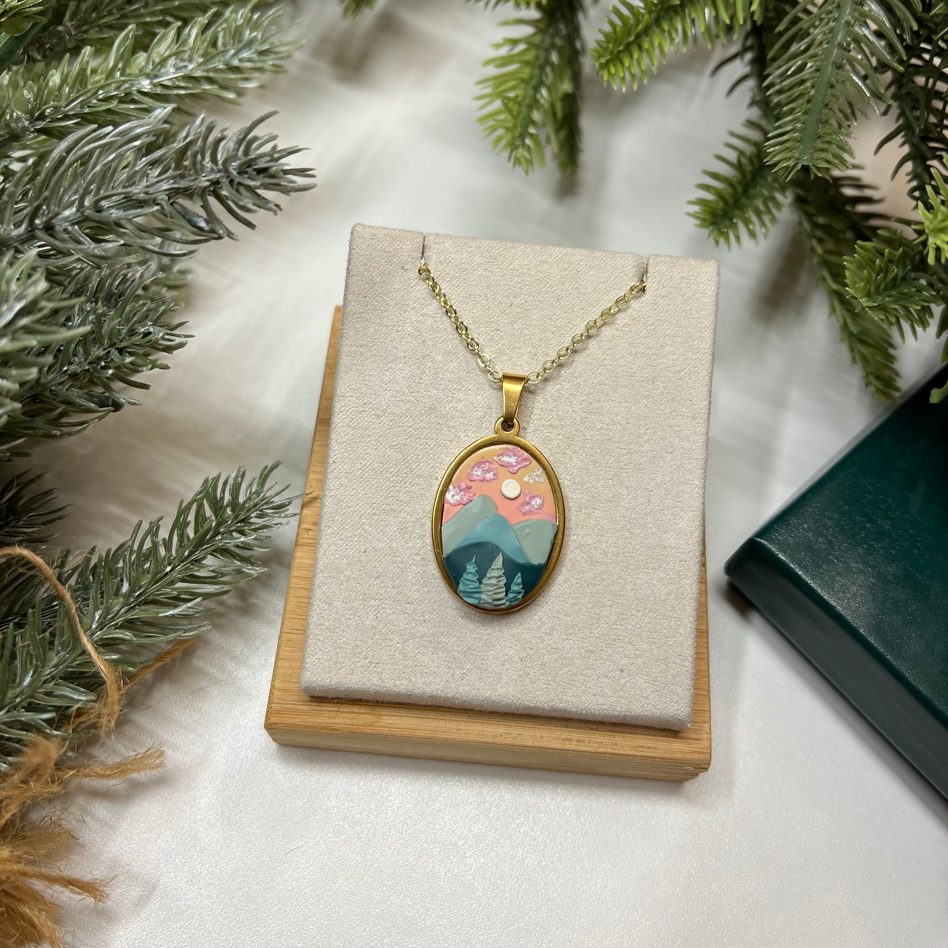 Bring the beauty of the outdoors wherever you go with this stunning hand-sculpted mountain scene necklace. Crafted from lightweight polymer clay, each piece features a serene landscape of rolling mountains and delicate details that capture the peaceful essence of nature. This necklace is perfect for nature lovers, hikers, or anyone who finds tranquility in the mountains.