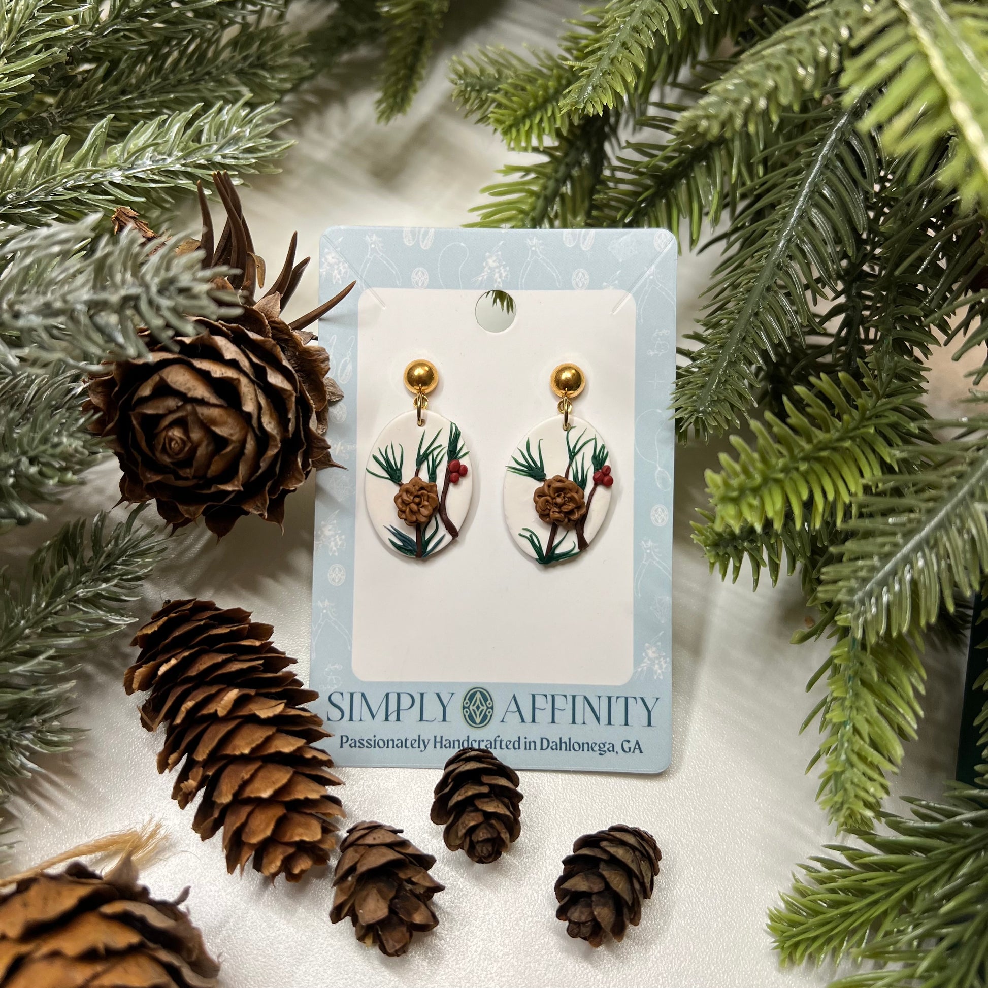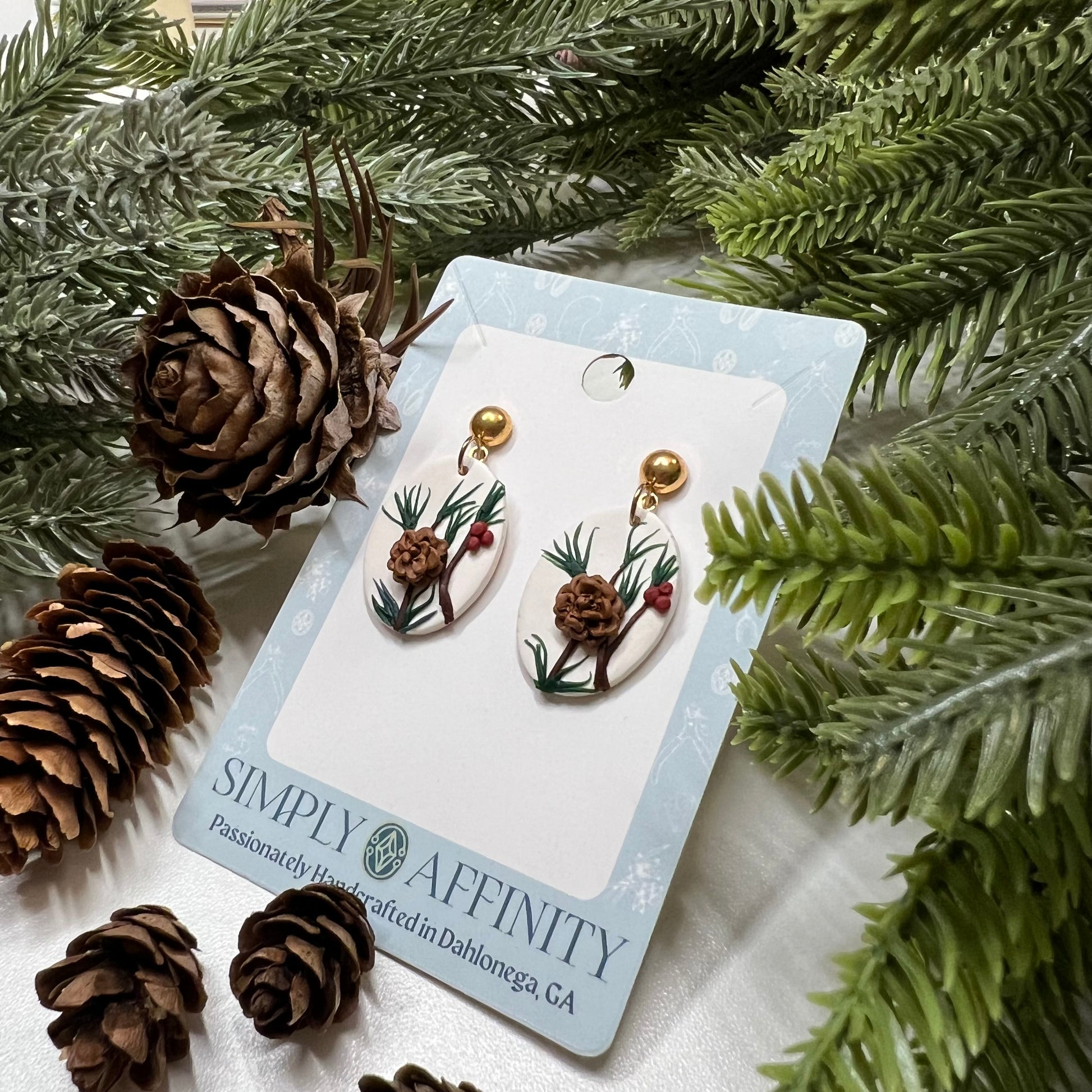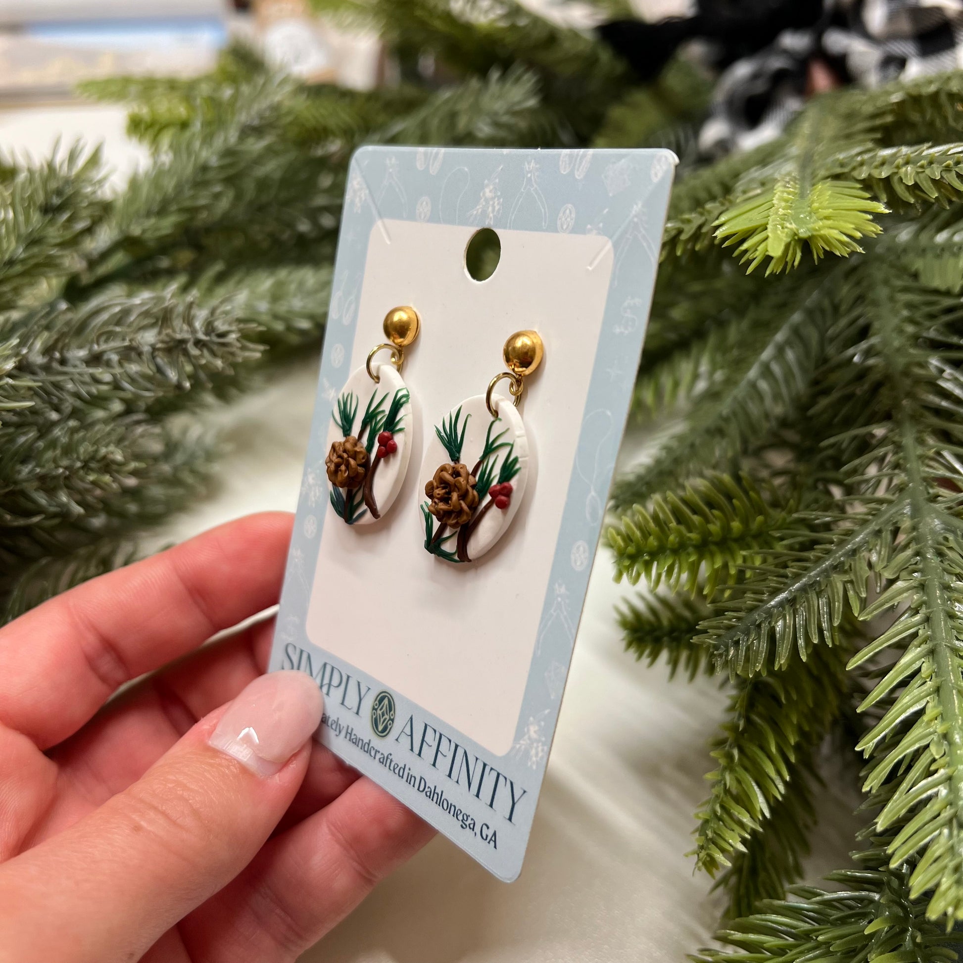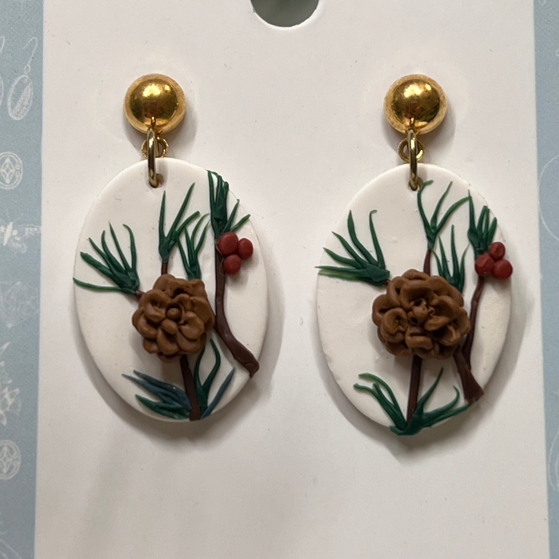 Add a touch of enchantment to your wardrobe with our lightweight and intricately sculpted pine bough earrings. Handcrafted from lightweight polymer clay, enjoy the whimsical beauty of nature while being comfortable wearing your earrings all day long. These sweet earrings are on gold plated brass earring wires.