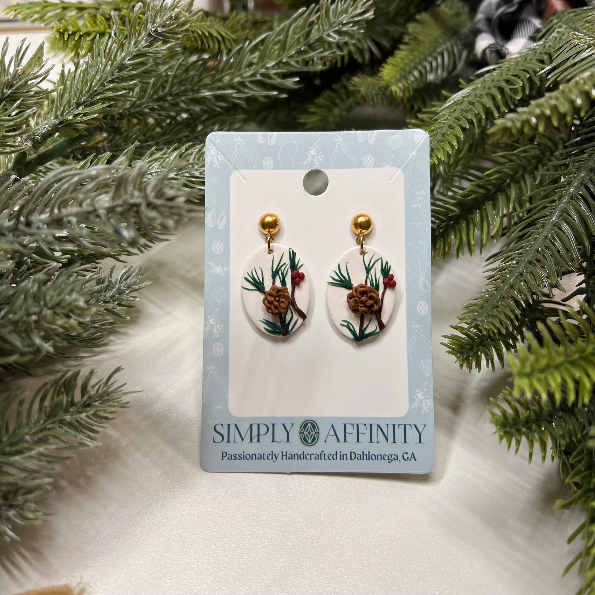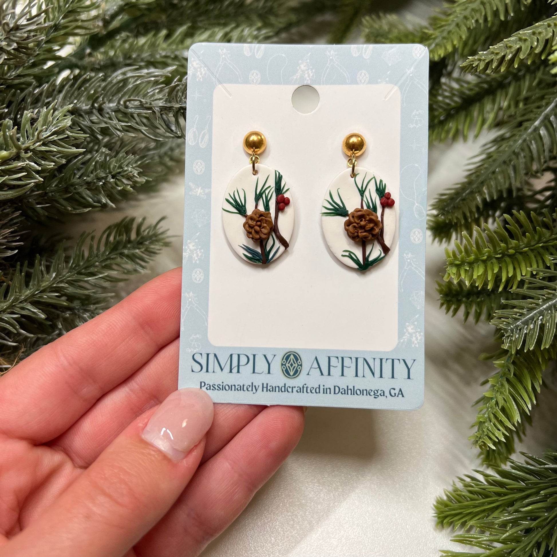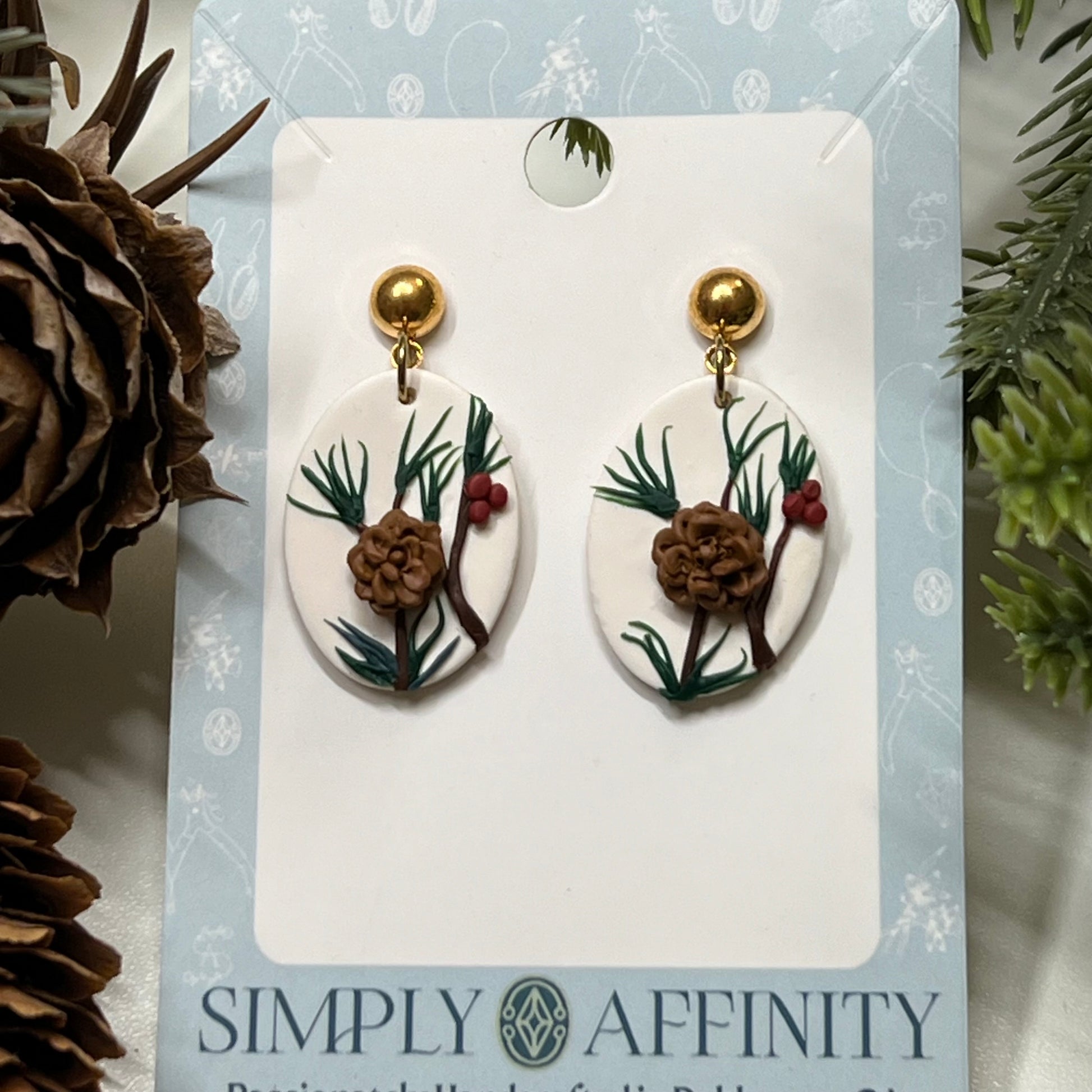 Add a touch of enchantment to your wardrobe with our lightweight and intricately sculpted pine bough earrings. Handcrafted from lightweight polymer clay, enjoy the whimsical beauty of nature while being comfortable wearing your earrings all day long. These sweet earrings are on gold plated brass earring wires.