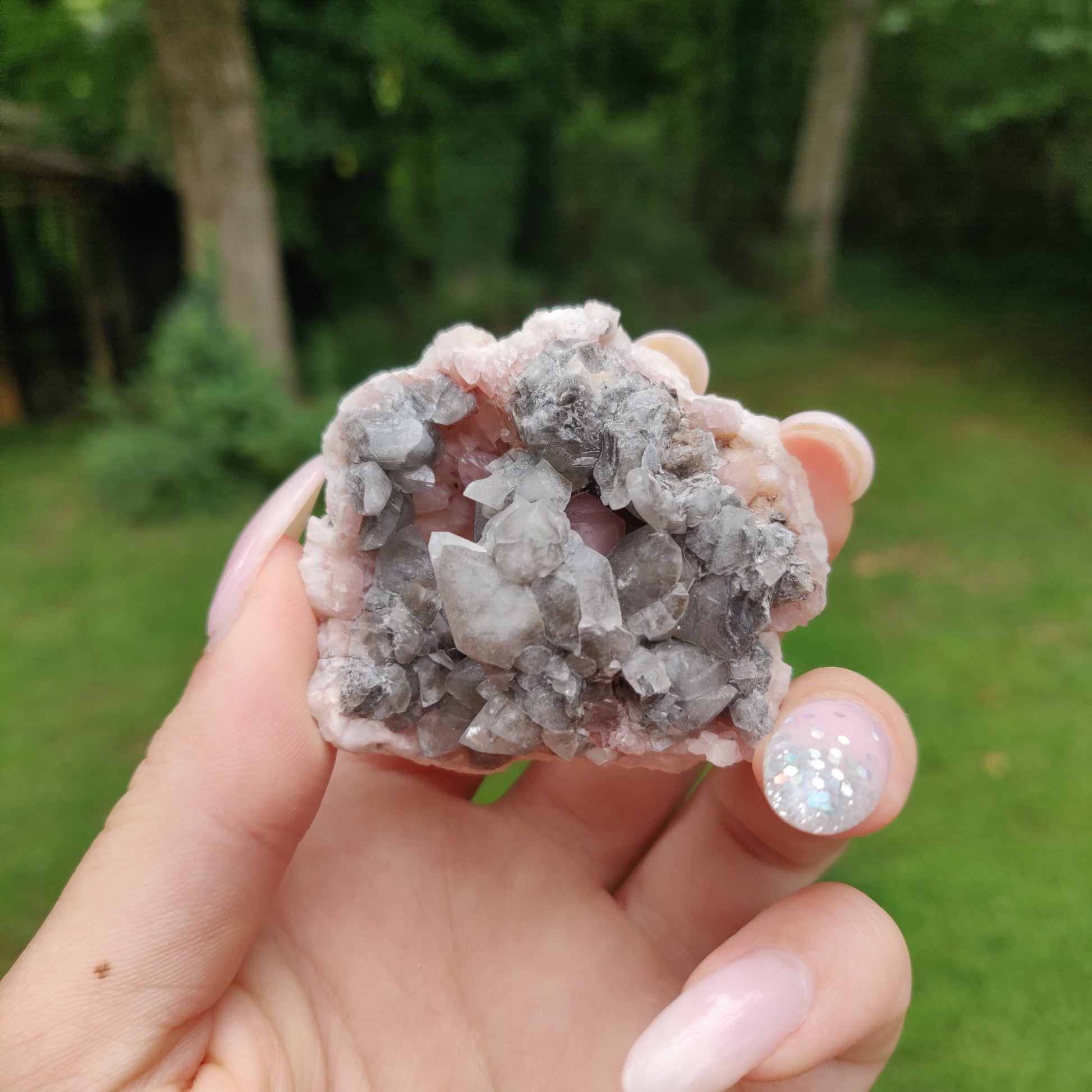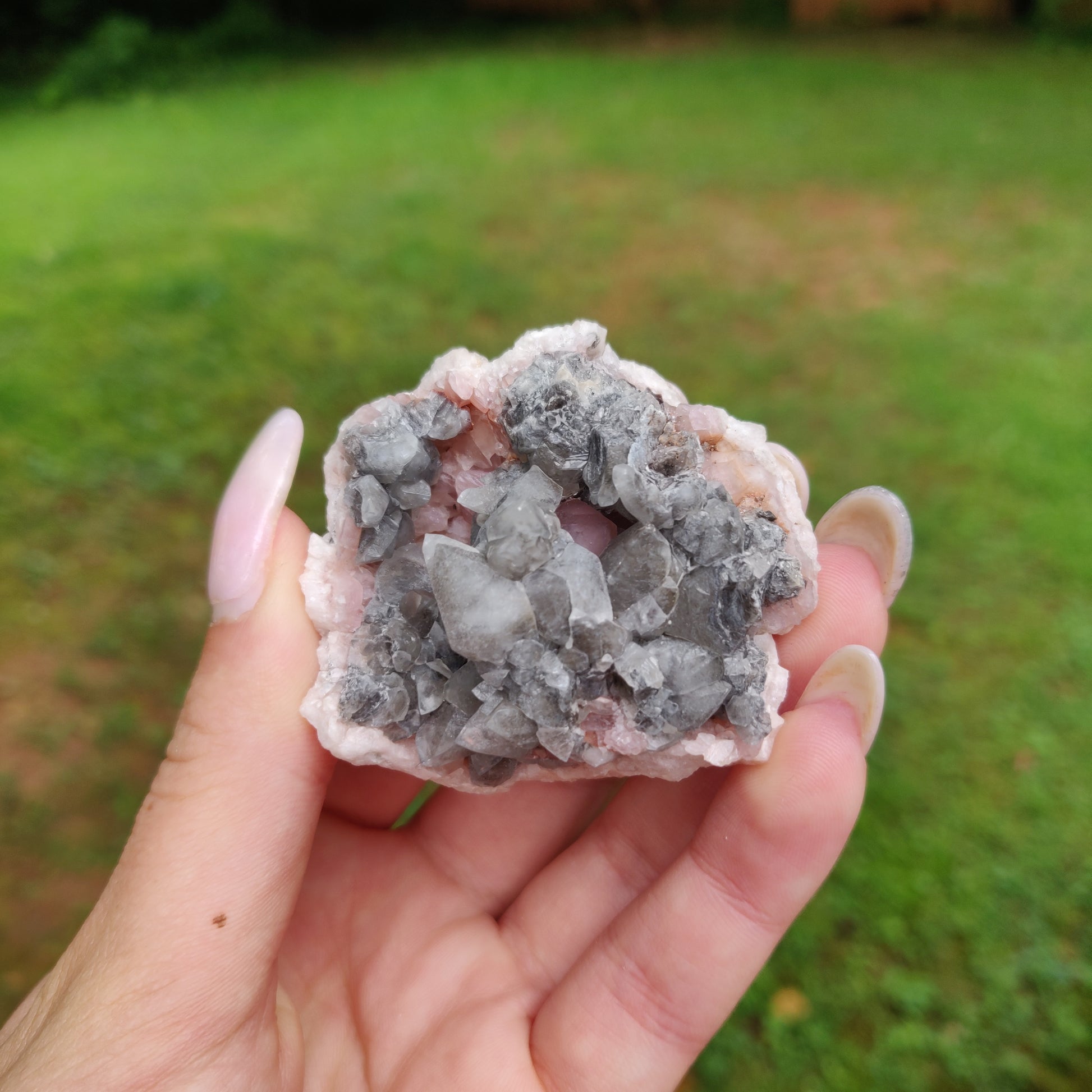 Beautiful Pink Amethyst geodes are rare to find. This beauty was sourced from Argentina. This piece has amazing calcite inclusions that fluoresce pink under a black light.