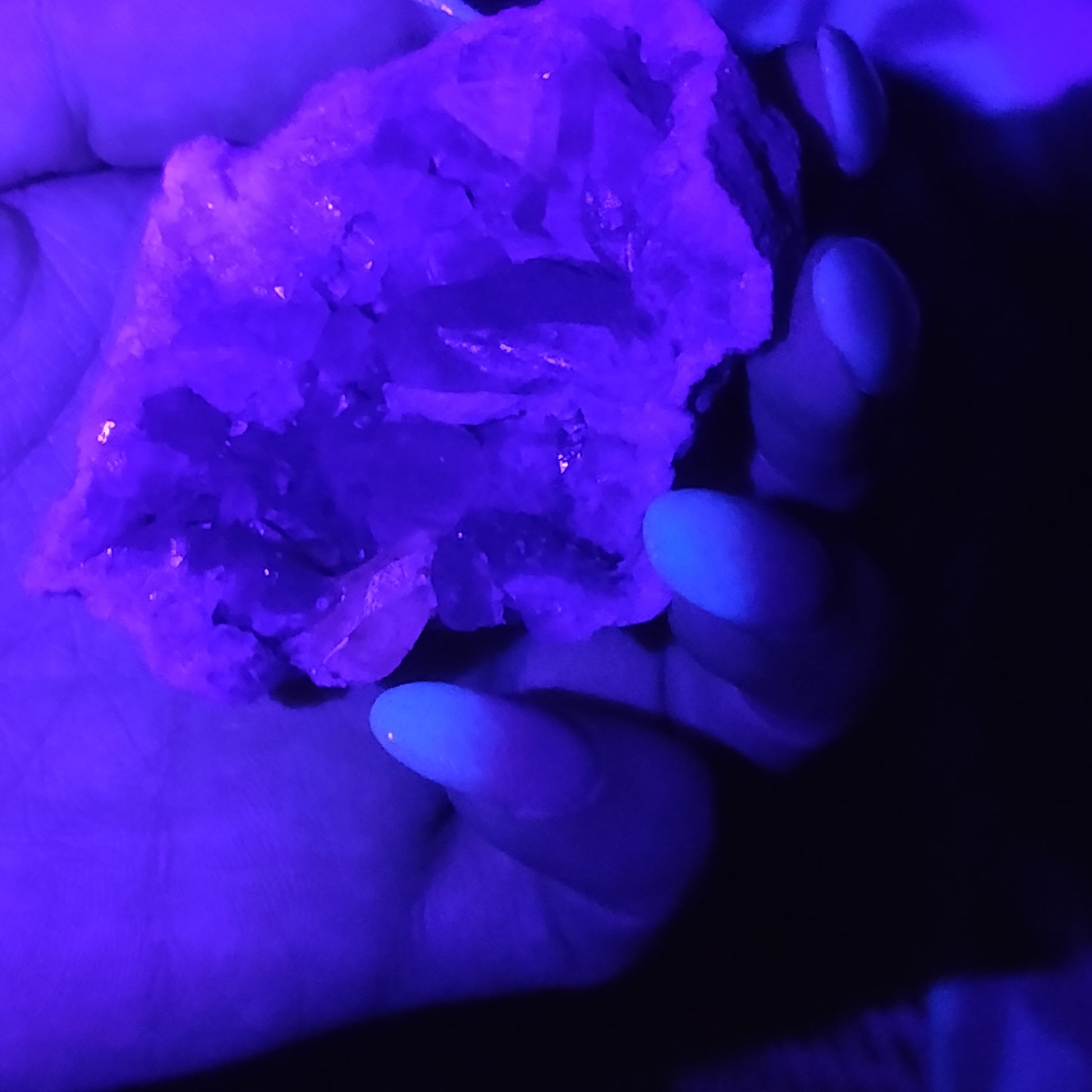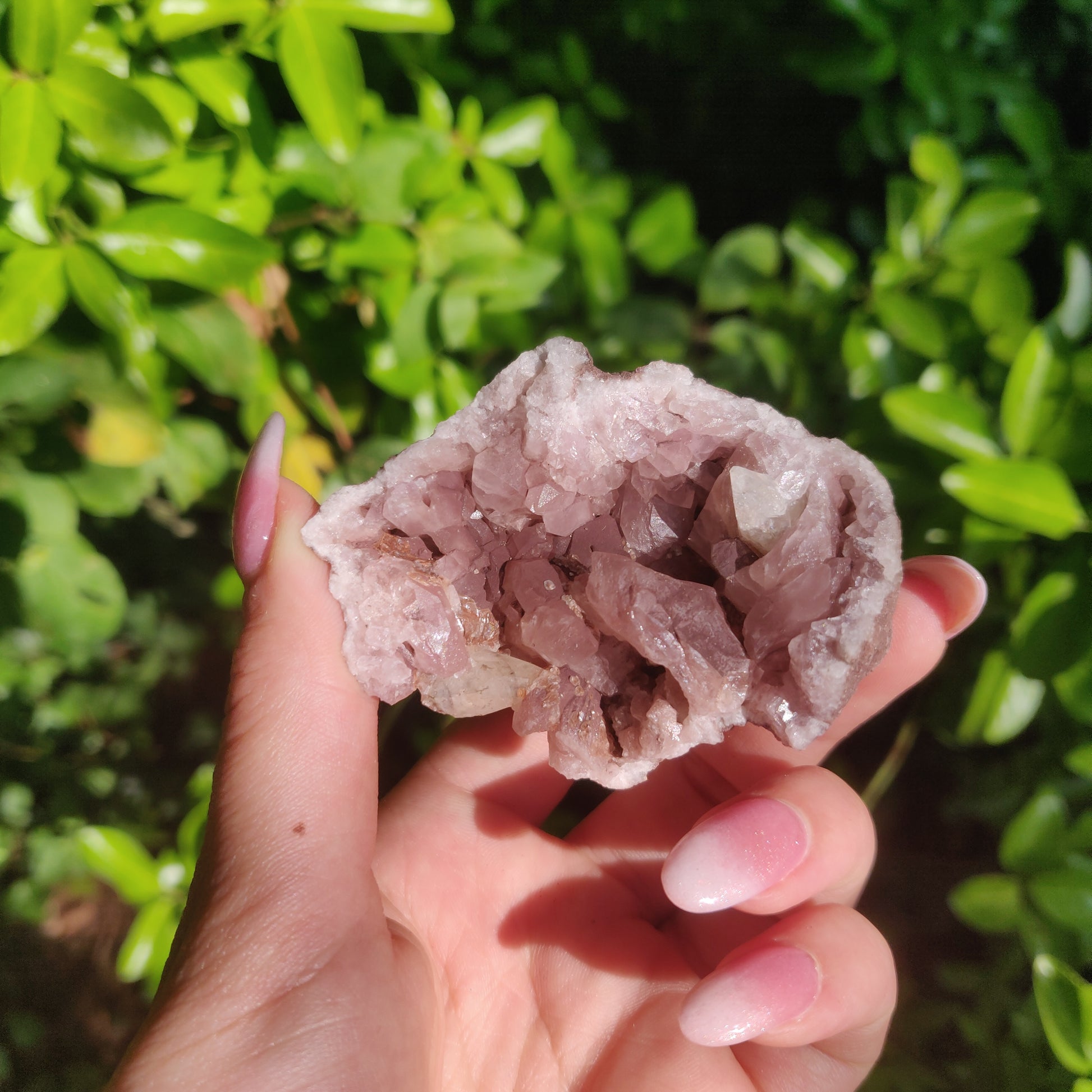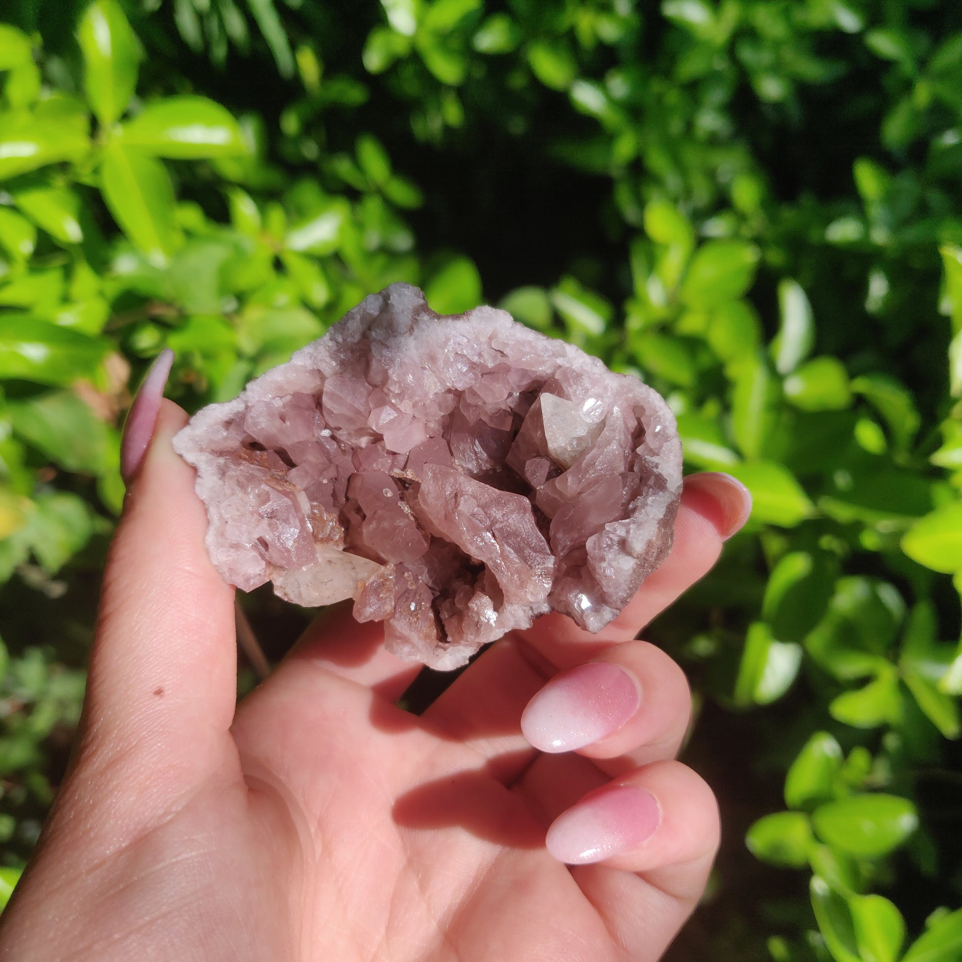 Beautiful Pink Amethyst geodes are rare to find. This beauty was sourced from Argentina. This piece has amazing calcite inclusions that fluoresce pink under a black light.