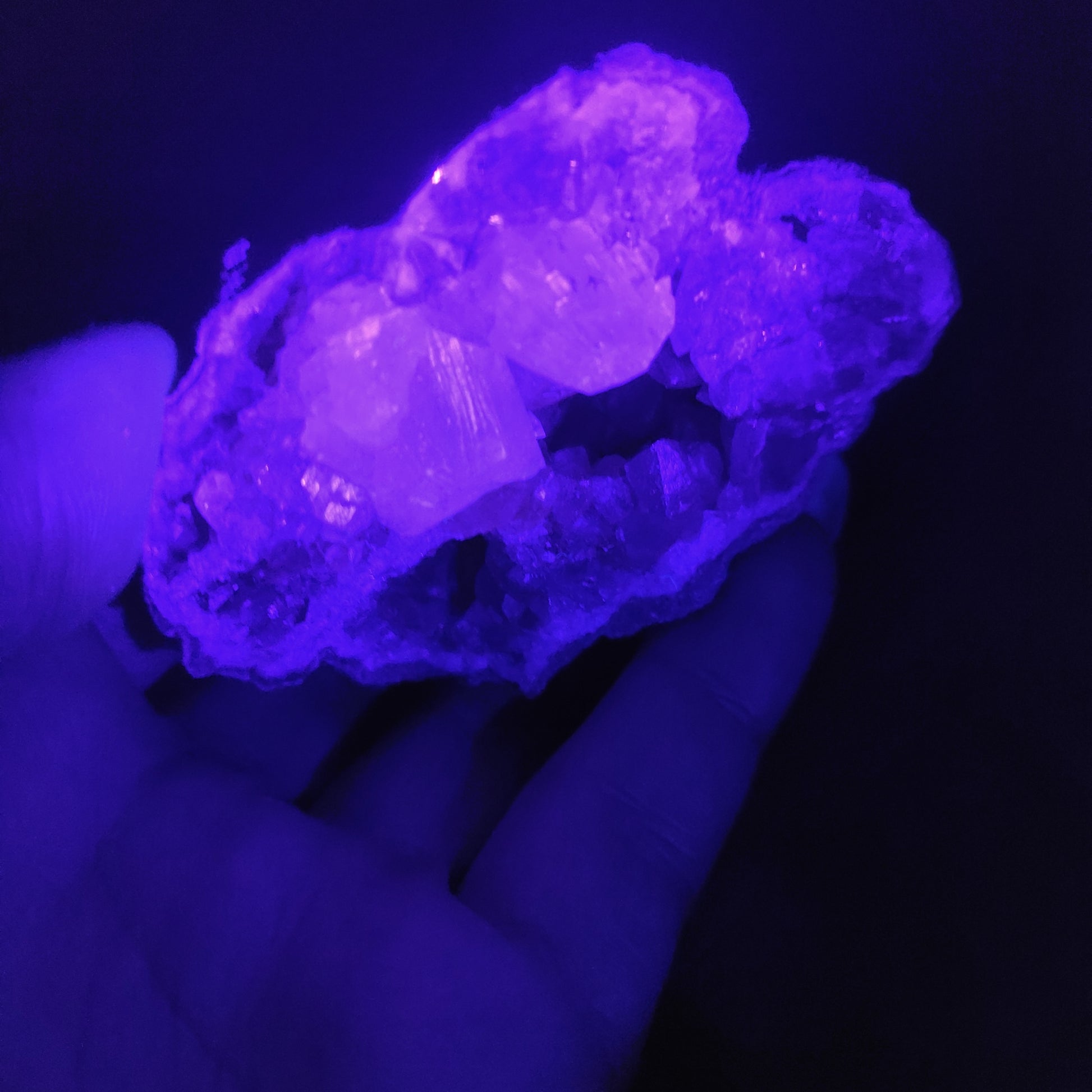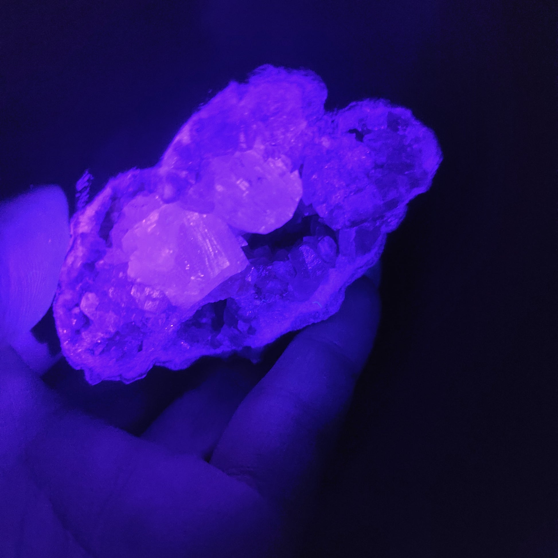 Beautiful Pink Amethyst geodes are rare to find. This beauty was sourced from Argentina. This piece has amazing calcite inclusions that fluoresce pink under a black light.
