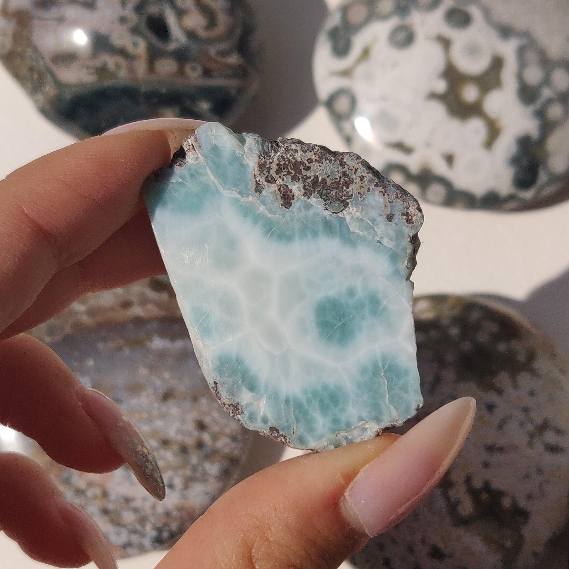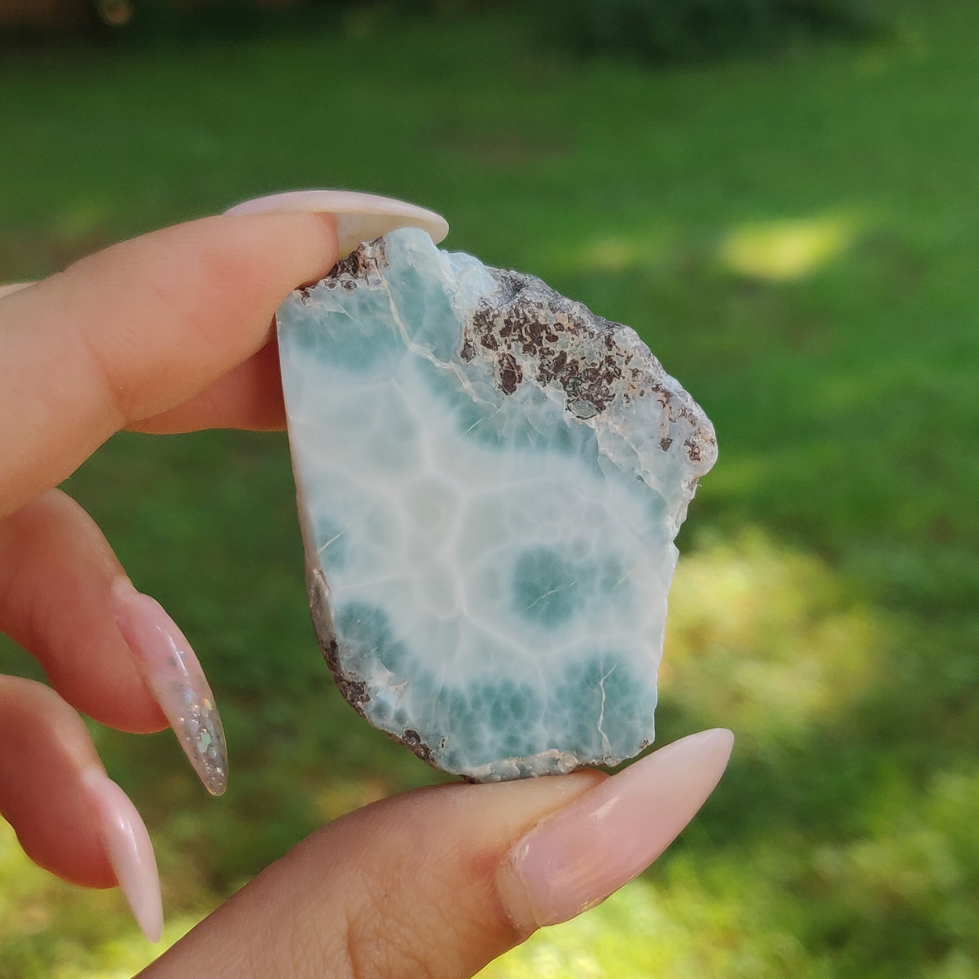 Larimar is a truly rare gemstone of volcanic origins. It is only found one place in the world, the Dominican Republic. Larimar was discovered in the 1970's by a local resident that stumbled upon a cave with Larimar lining the walls. He named the newly found gem after his daughter Larissa and the sea ("mar" in Spanish). Larimar is also known as the Dolphin Stone, Blue Pectolite, Atlantis Stone, and Stefilia's Stone. It has been said that the blue variety of the stone has been completely mined out (as it was only found on one square kilometer of the island). Instead, they are finding the green variety of Larimar that is too soft to set in jewelry.