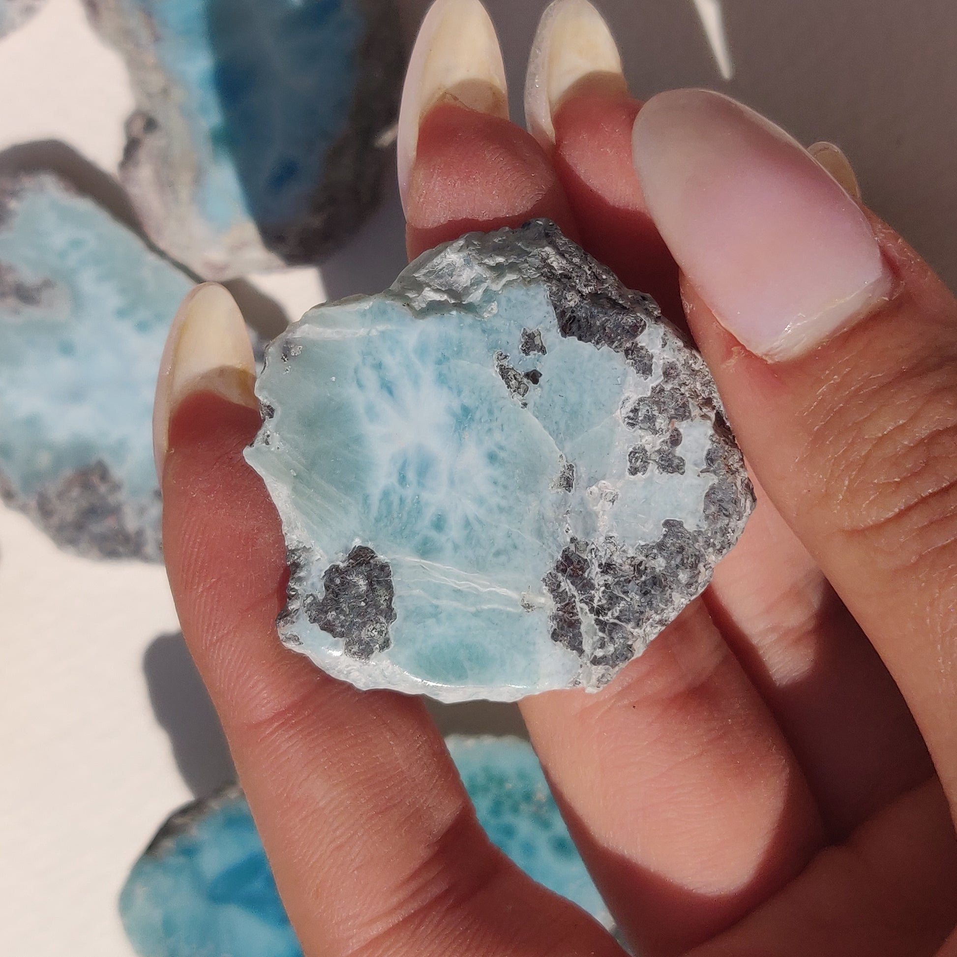 Larimar is a truly rare gemstone of volcanic origins. It is only found one place in the world, the Dominican Republic. Larimar was discovered in the 1970's by a local resident that stumbled upon a cave with Larimar lining the walls. He named the newly found gem after his daughter Larissa and the sea ("mar" in Spanish). Larimar is also known as the Dolphin Stone, Blue Pectolite, Atlantis Stone, and Stefilia's Stone. It has been said that the blue variety of the stone has been completely mined out (as it was only found on one square kilometer of the island). Instead, they are finding the green variety of Larimar that is too soft to set in jewelry.