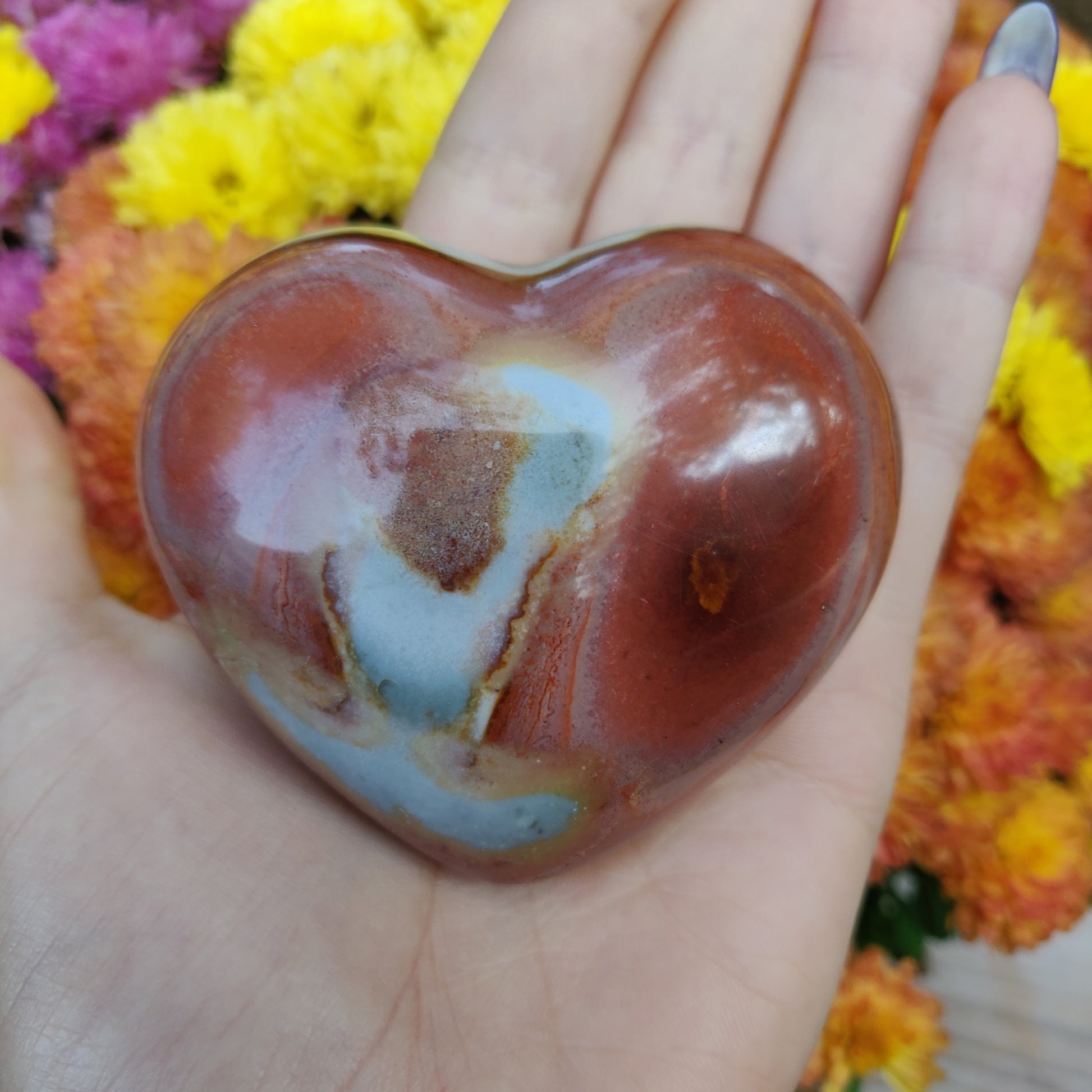 This beautiful piece of polychrome jasper heart displays a beautiful array of colors! Polychrome Jasper, also known as Desert Jasper, represents the earth and is a grounding stone that promotes stability and balance in life. It balances the vibrations and emotional energies of the body, and is very nurturing. It helps to bring balance between assertiveness and sensitivity, bringing tranquillity and wholeness into your life, sustaining and supporting in times of stress.